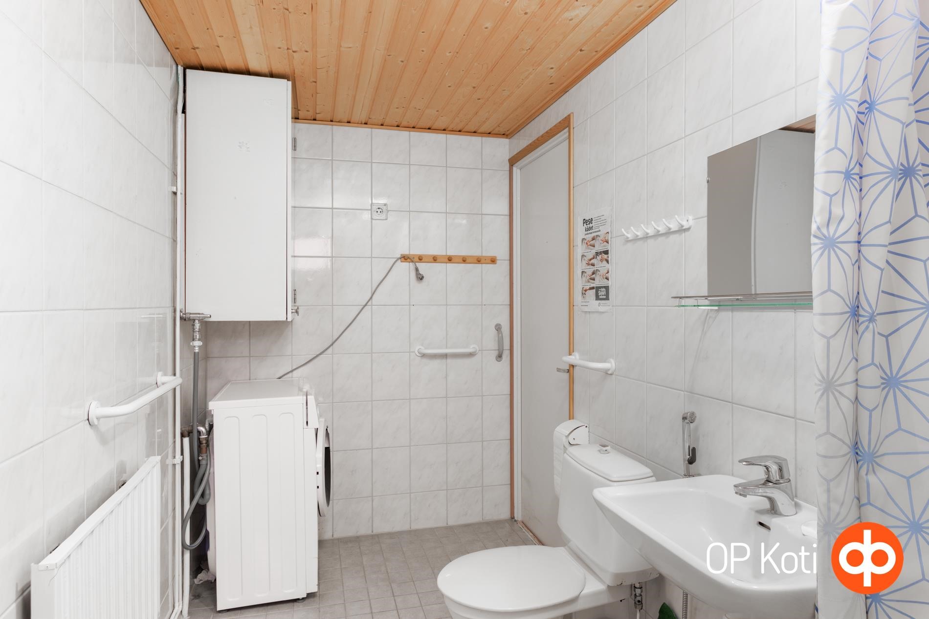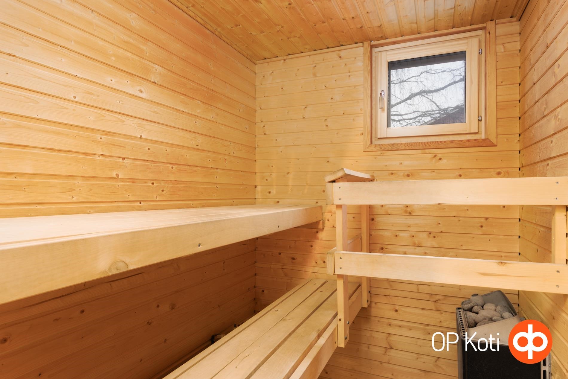 - Sauna, sähkökiuas, kylpyhuone, suihku, peilit, pesukoneliitäntä, kiinteät valaisimet.