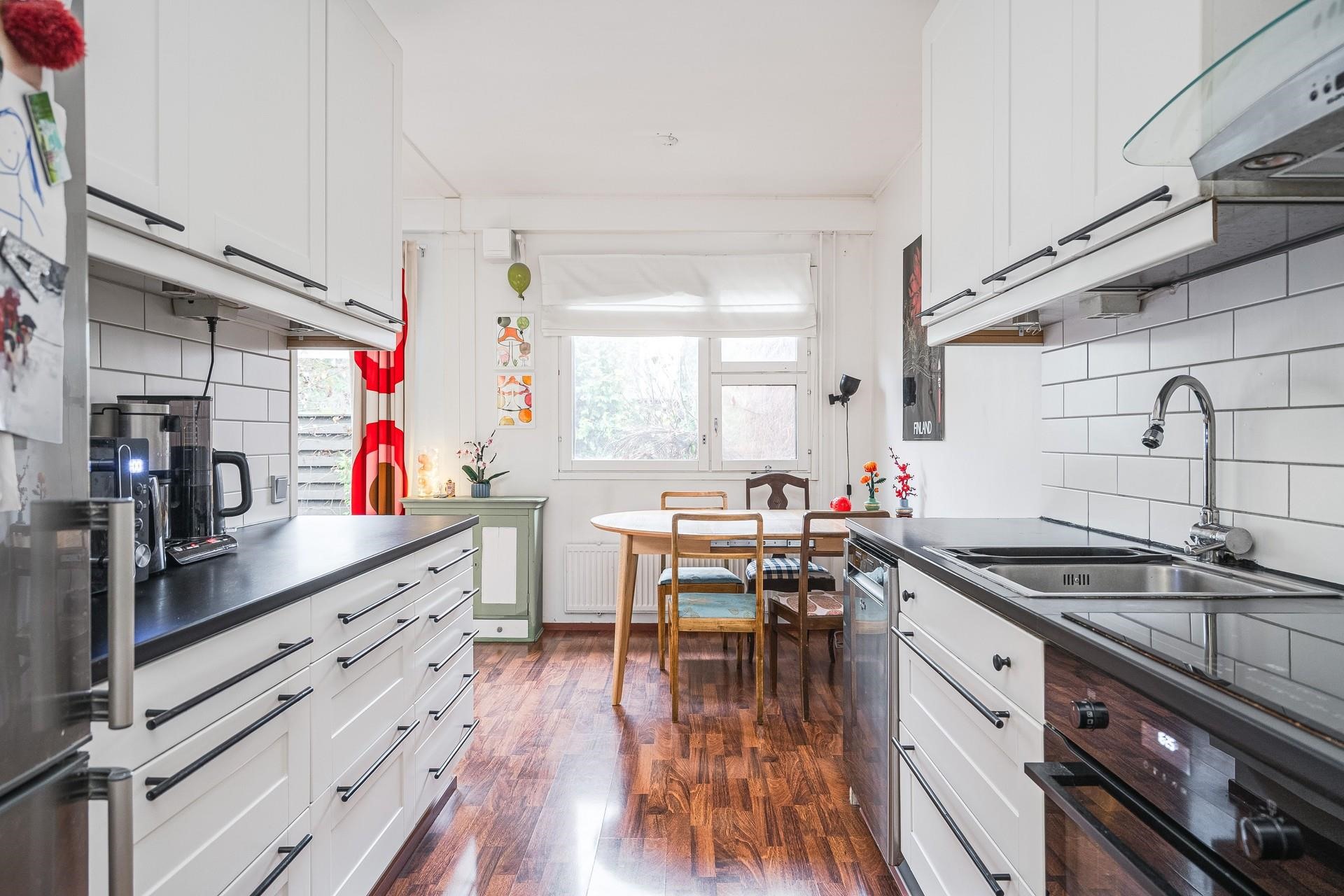 - Jääkaappipakastin, erillisuuni uusittu 2023, induktioliesi uusittu 2023, astianpesukone uusittu noin 2020, kaapistot uusittu 2010, kiinteät valaisimet.