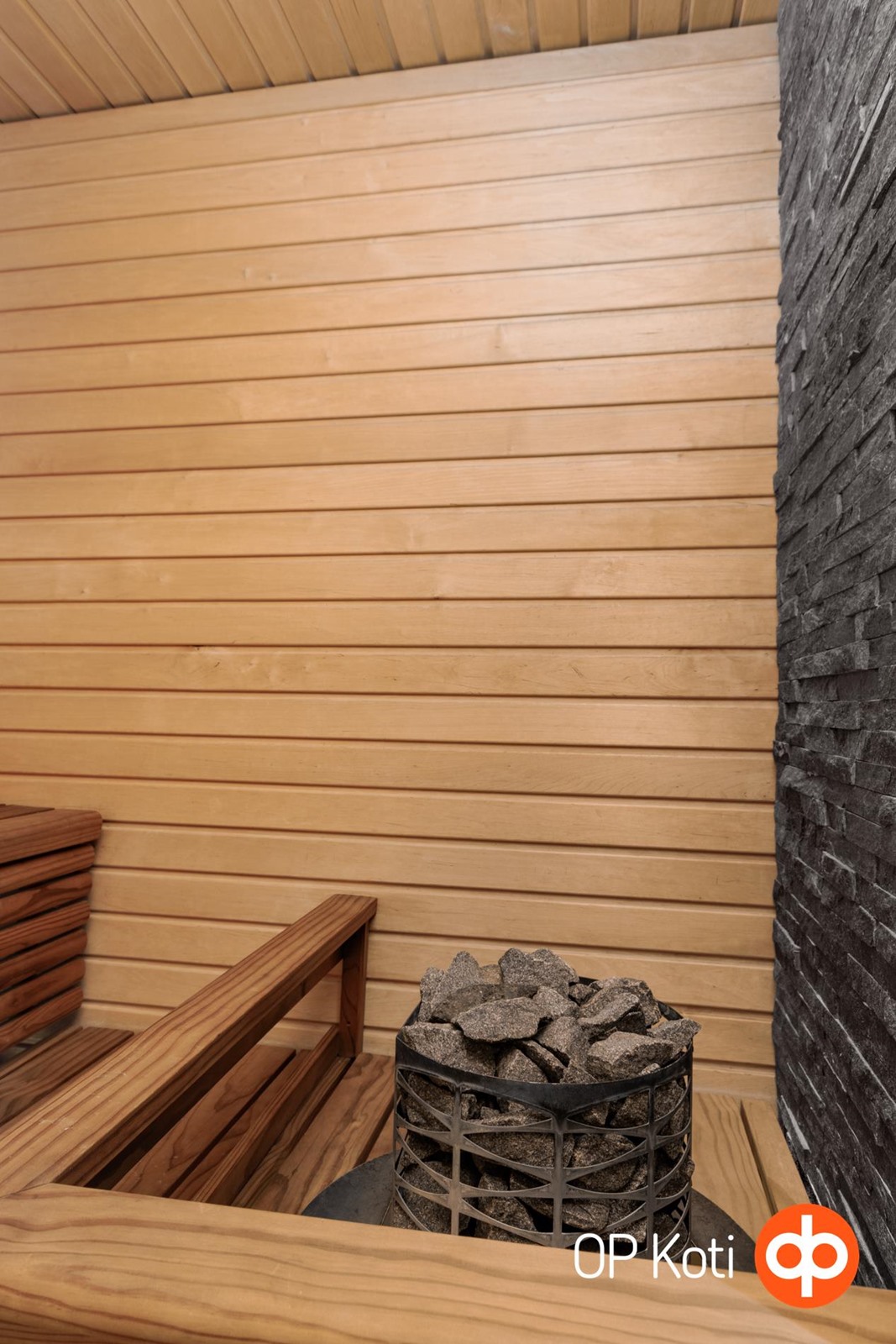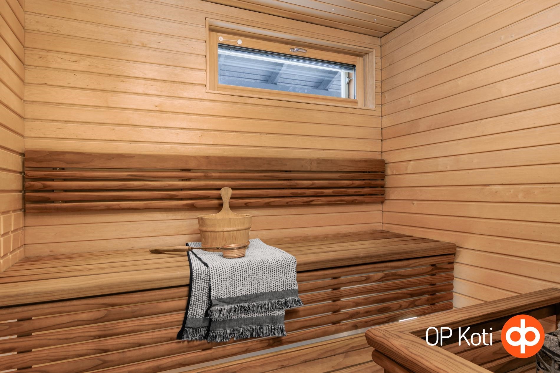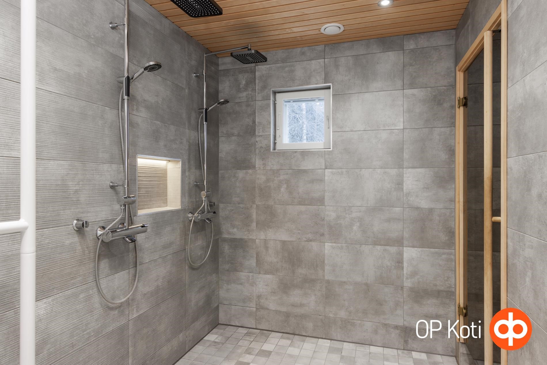 - Sauna, sähkökiuas, kylpyhuone, erillinen wc, suihku x 2, peilit, peilikaappi, kaapit, allaskaappi, pesukoneliitäntä, lattialämmitys, kiinteät valaisimet.
