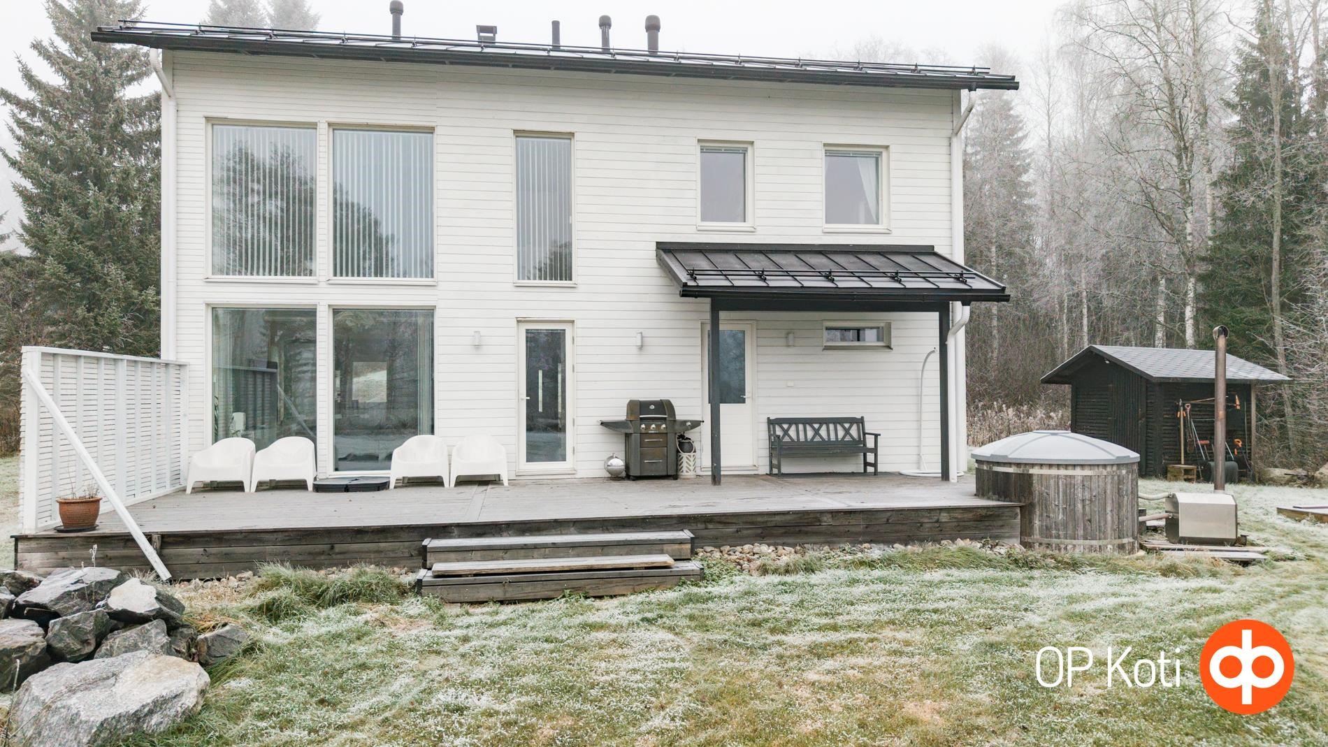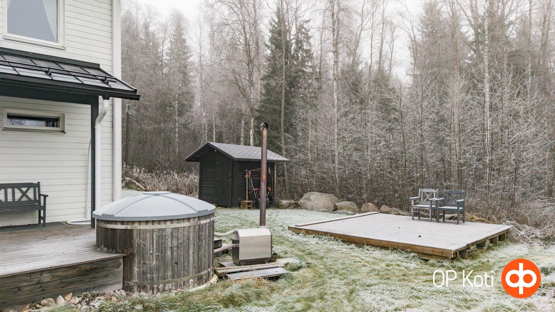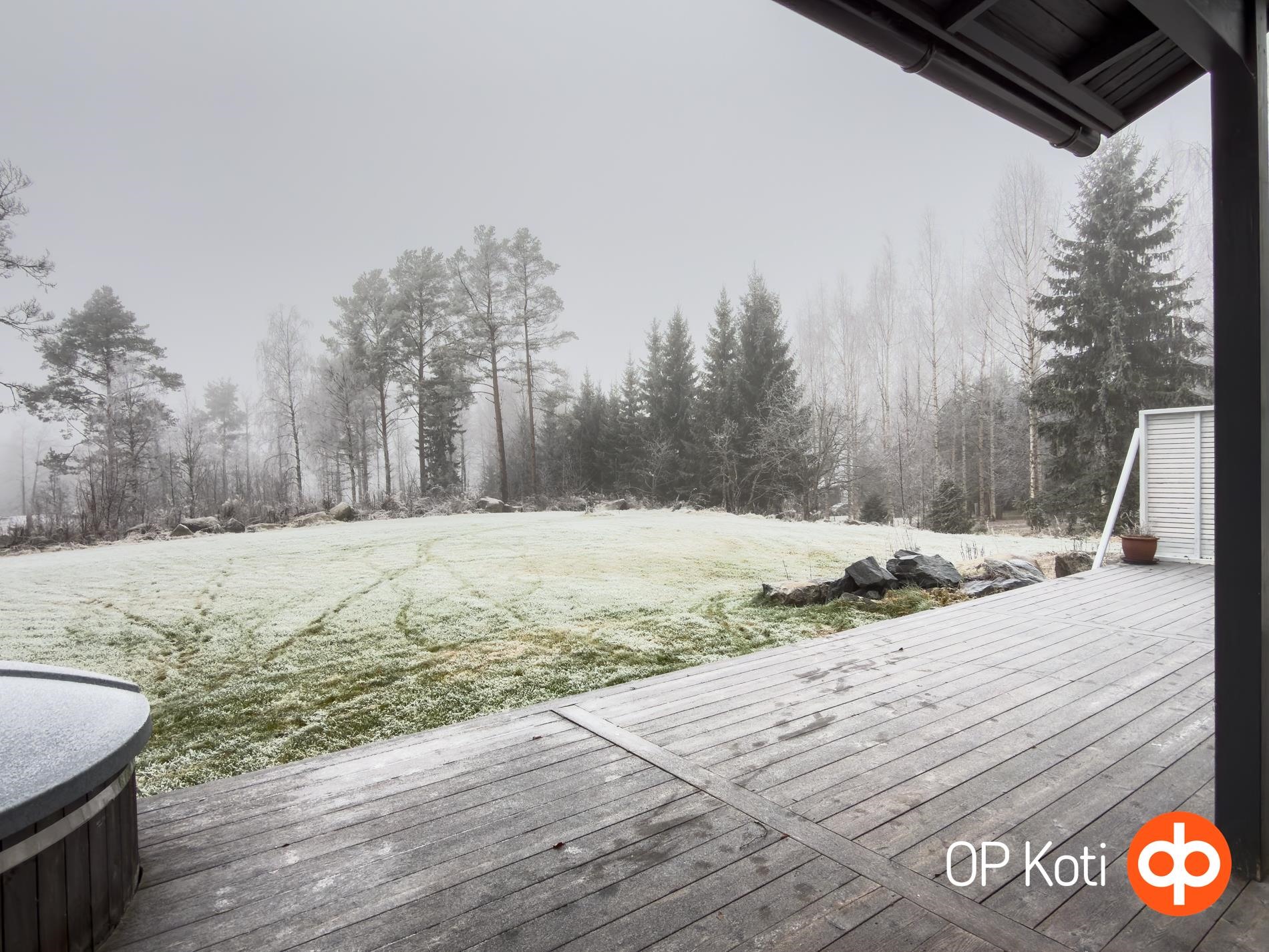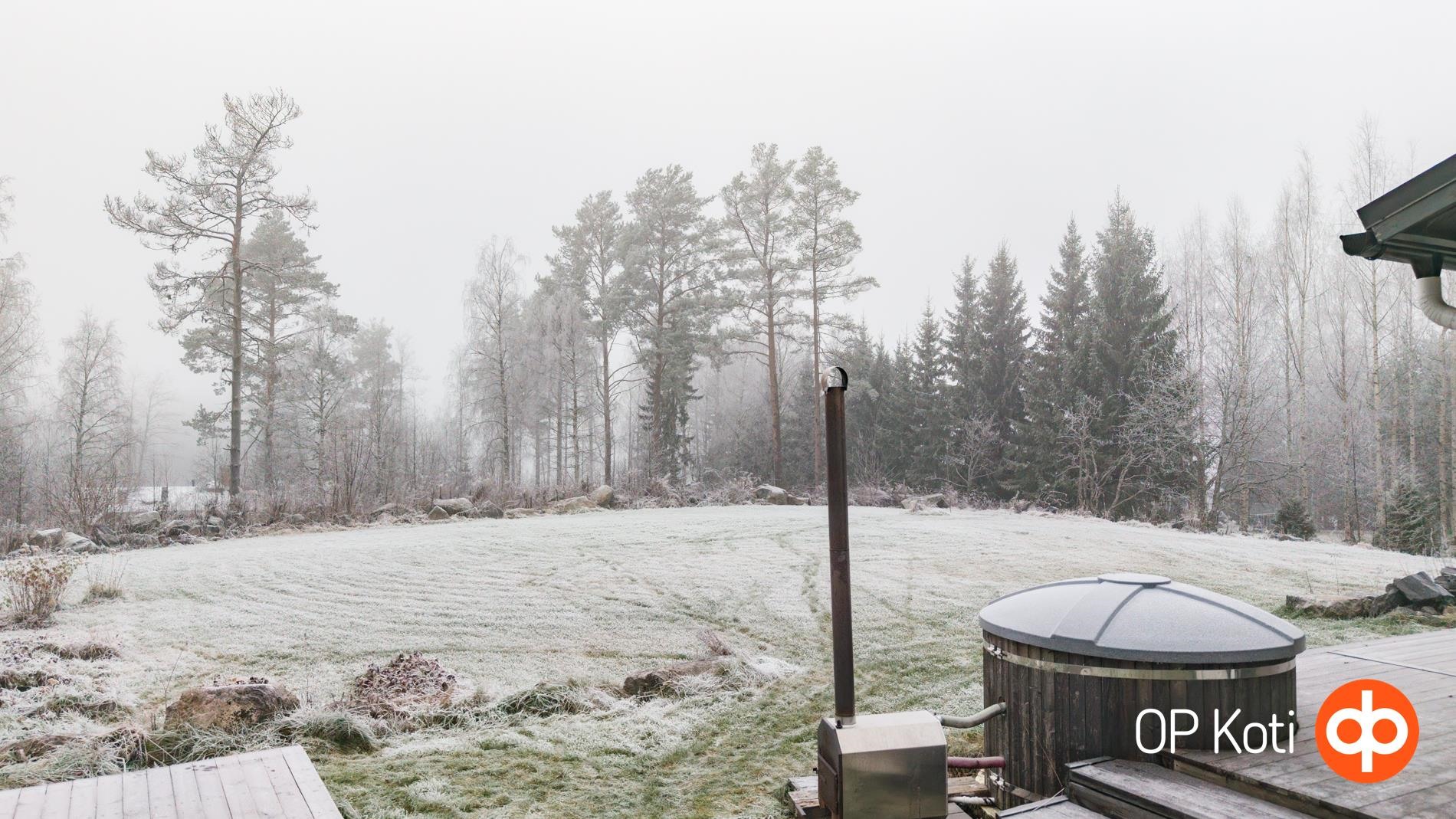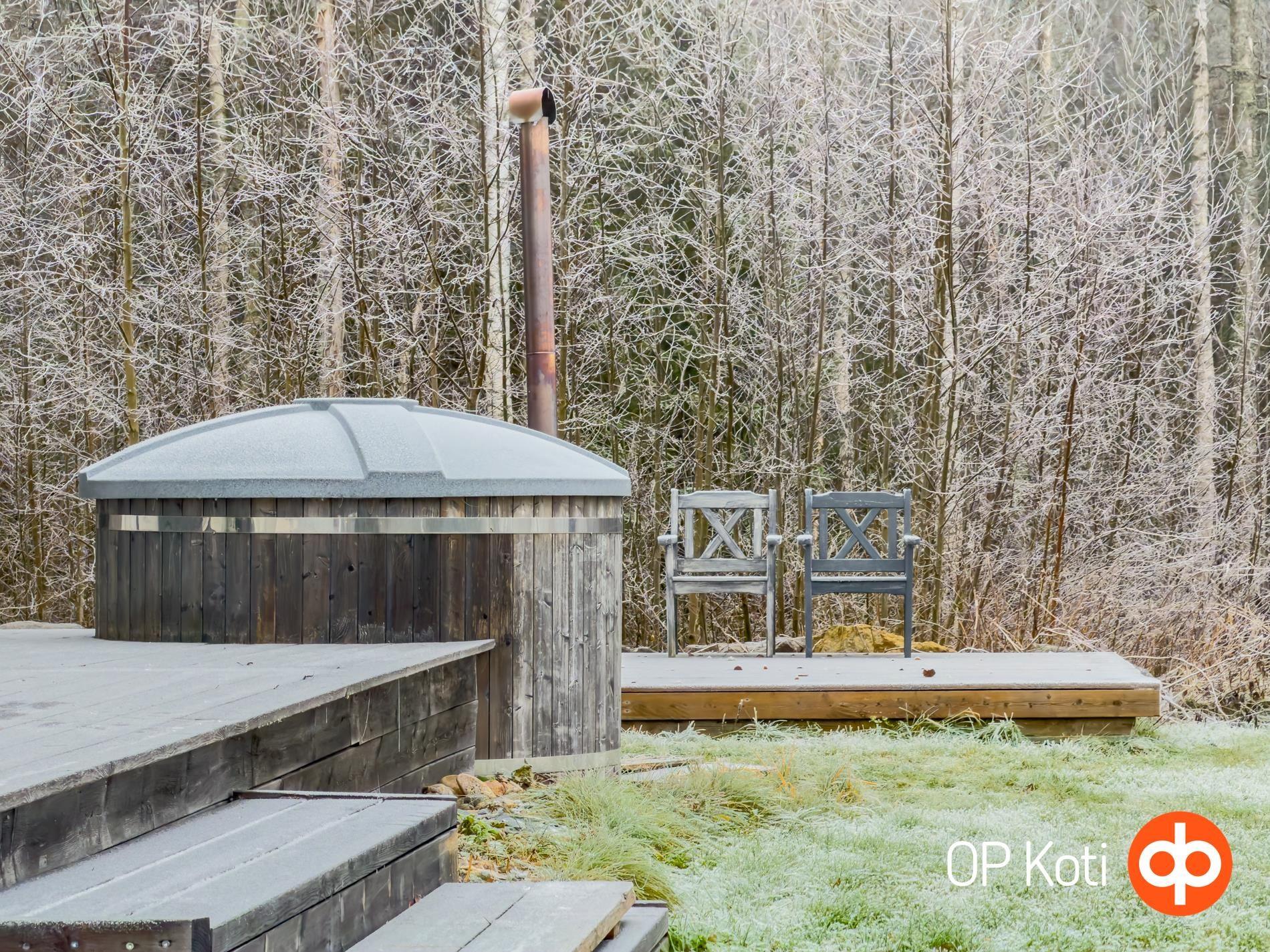 Suurelta, 4 800 m² tontilta avautuu järvinäköala. Pihalla on tilaa olla ja leikkiä ja sieltä löytyy mm. palju; täydellinen paikka rentoutua pitkän päivän päätteeksi.