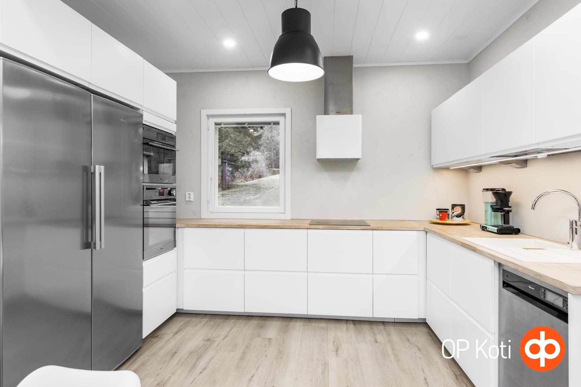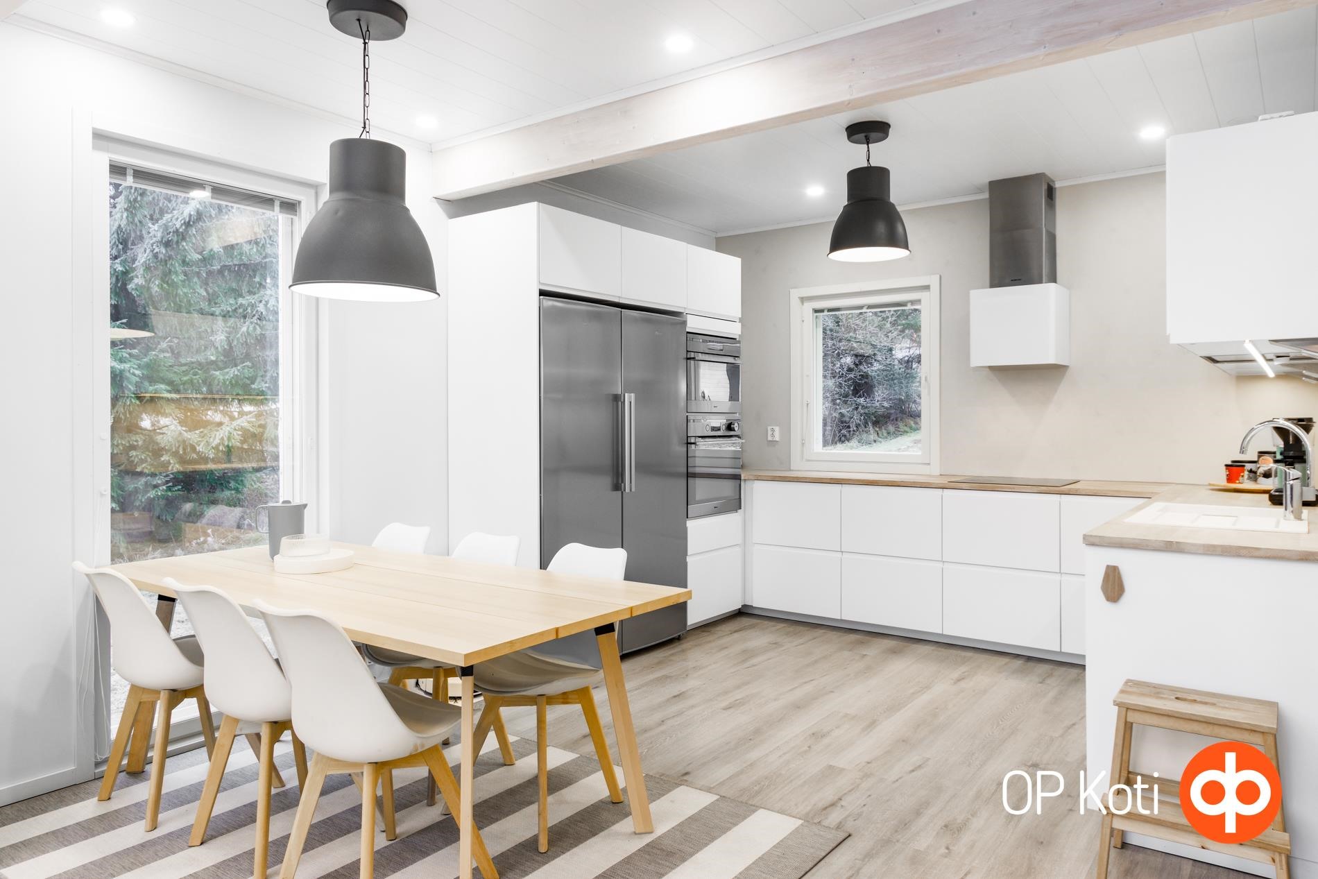 - Jääkaappi, pakastekaappi, erillisuuni, induktioliesi, liesituuletin, mikroaaltouuni ns. yhdistelmäuuni, astianpesukone, kaapistot, kiinteät valaisimet, pöytätasojen materiaali puu.