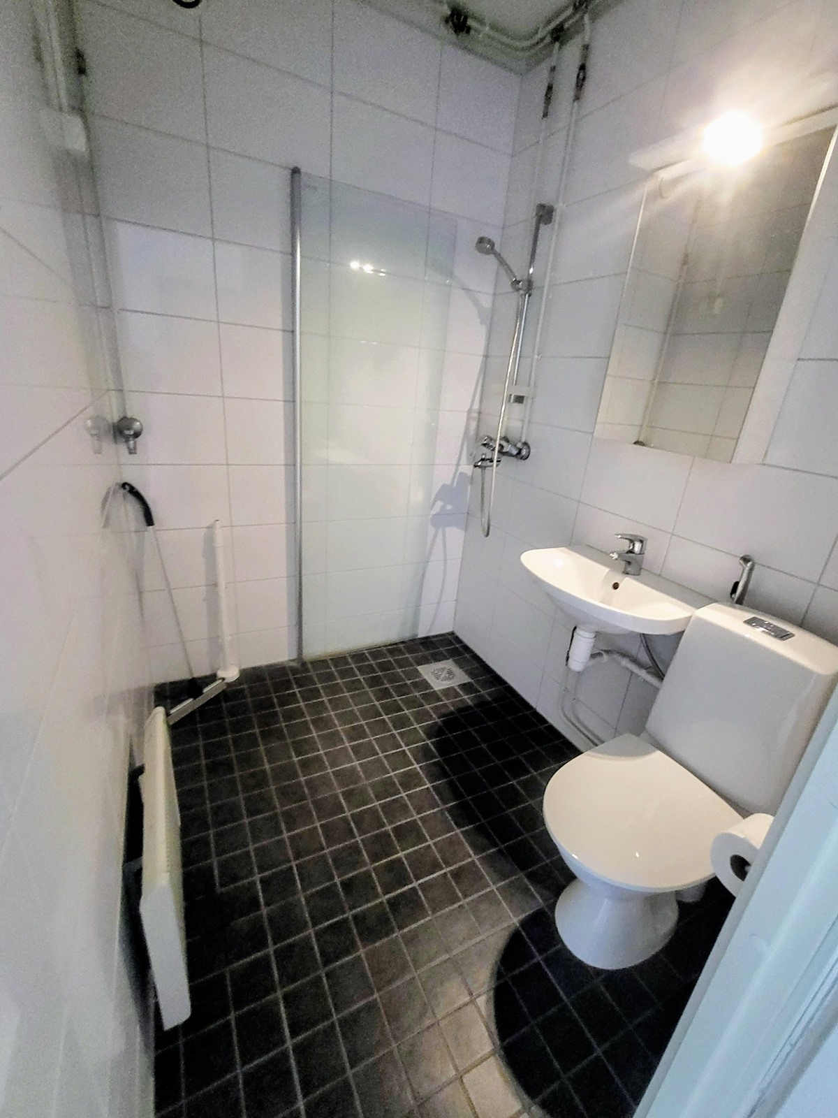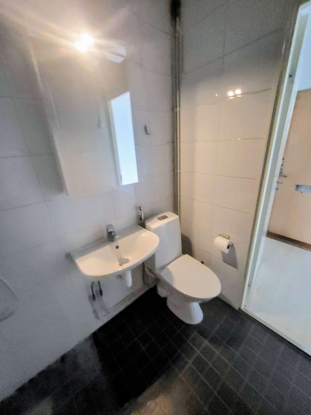 - Kylpyhuone, suihku, suihkuseinä, peilikaappi, pesukoneliitäntä, kiinteät valaisimet.