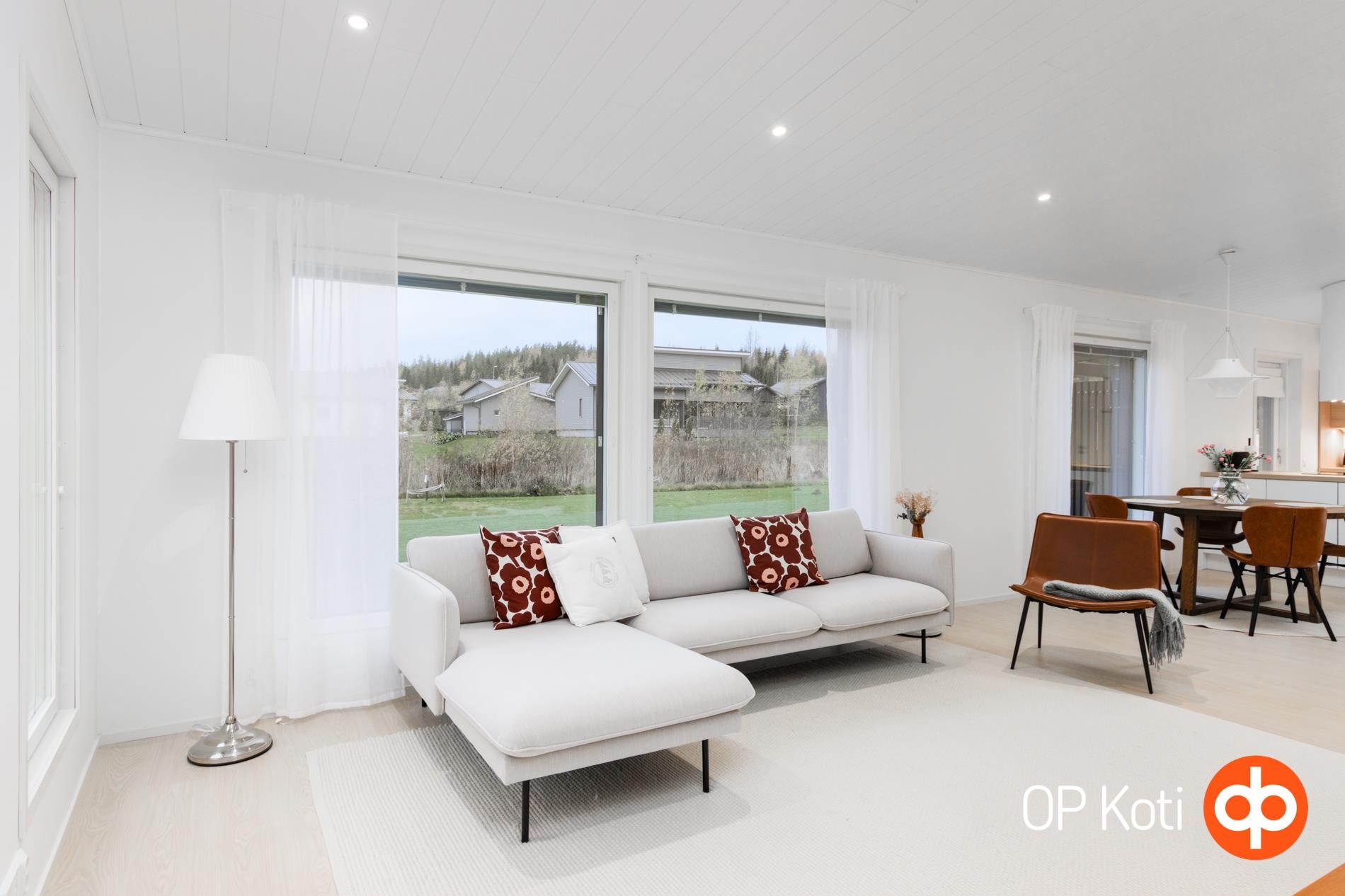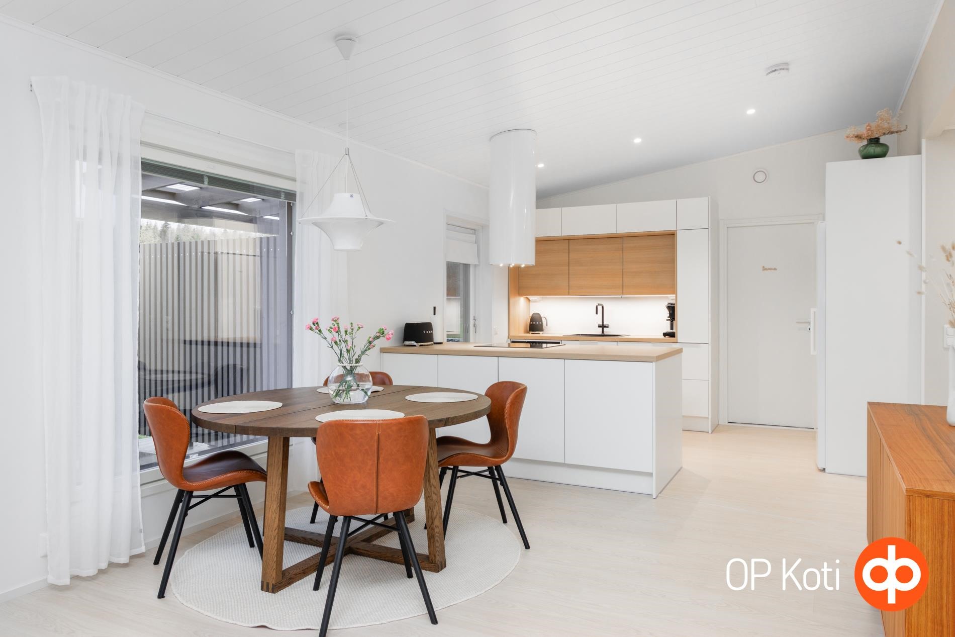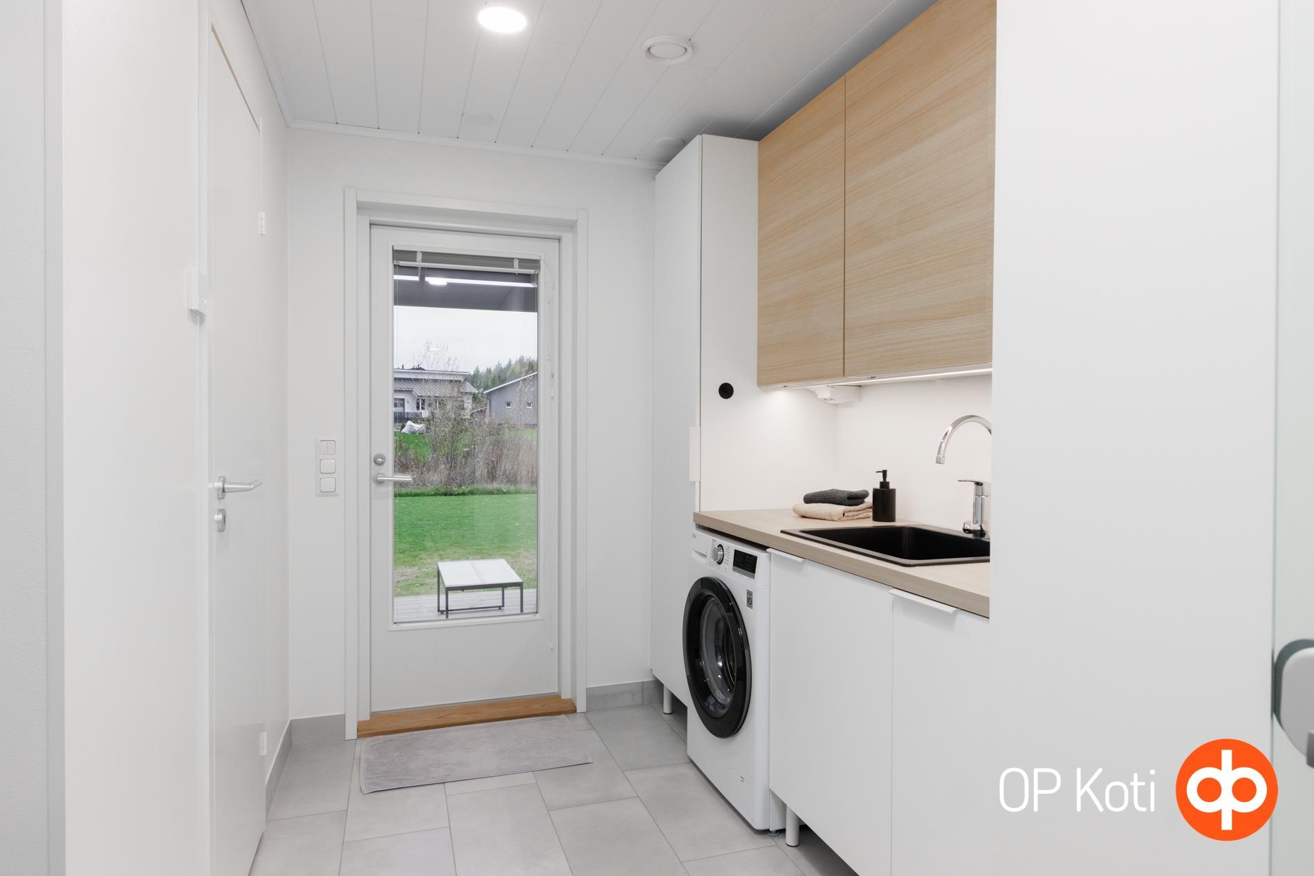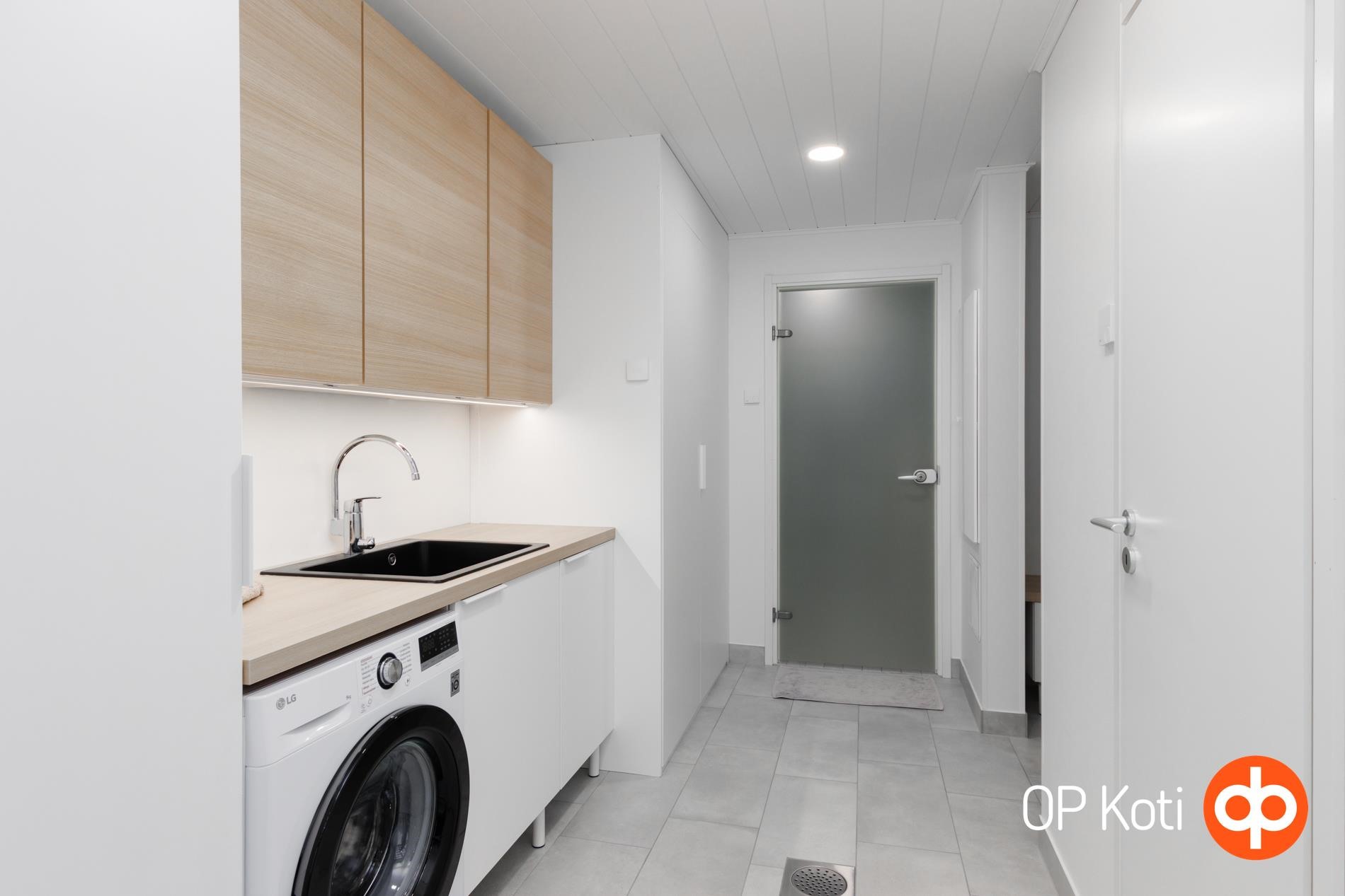 Nykyaikainen keittiö reiluine kaapistoineen, tasoineen ja ruokailutiloineen yhdistyy luontevasti olohuoneeseen, jossa on hyvin tilaa ja valo tulvii isoista ikkunoista. Makuuhuoneita on kolme ja isoimmassa muodostettu kätevä walk in closet säilytykseen. Kodinhoitohuone on tilava ja toimiva omalla sisäänkäynnillä, ehdottoman toimiva siis lemmikeille ja lapsille.