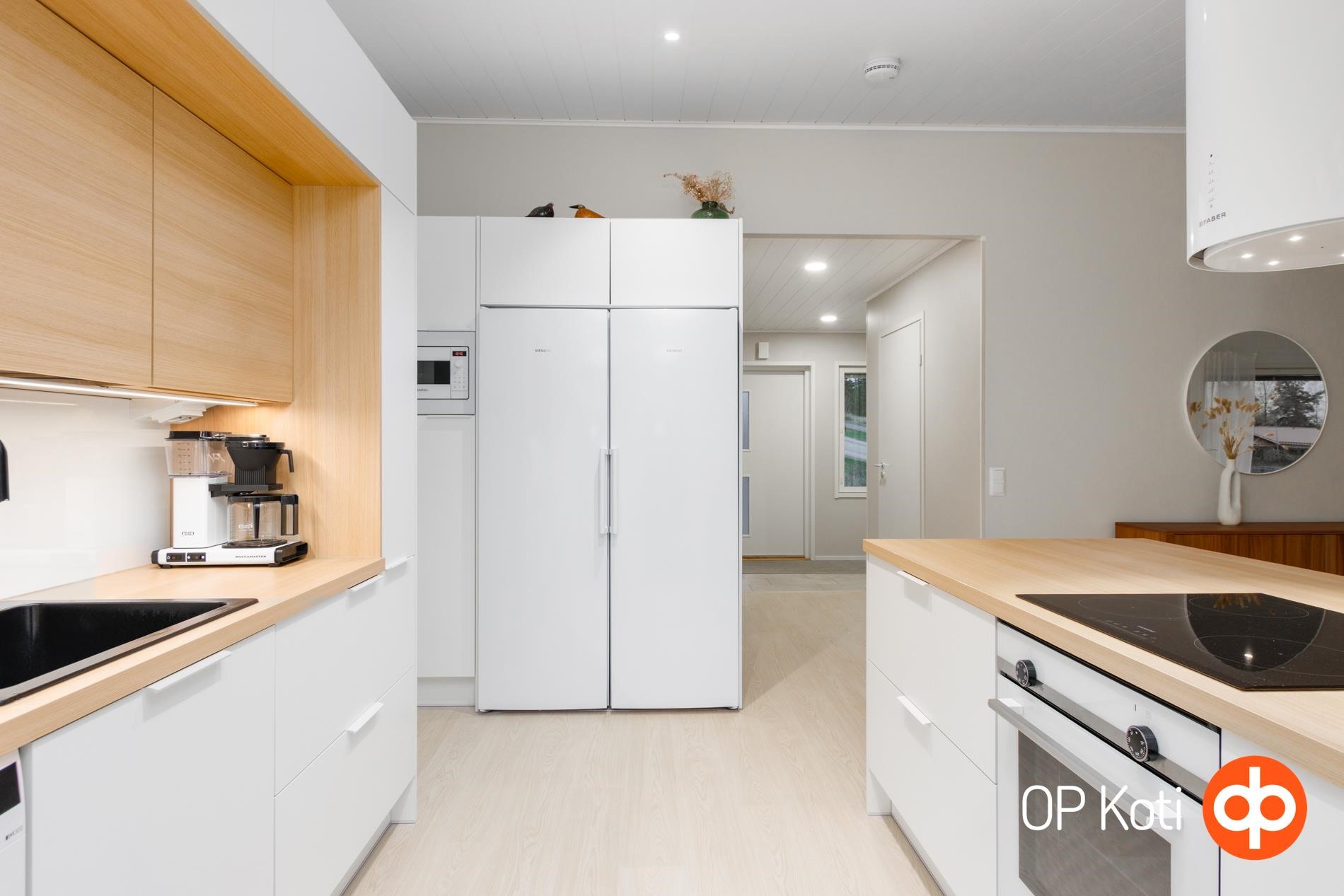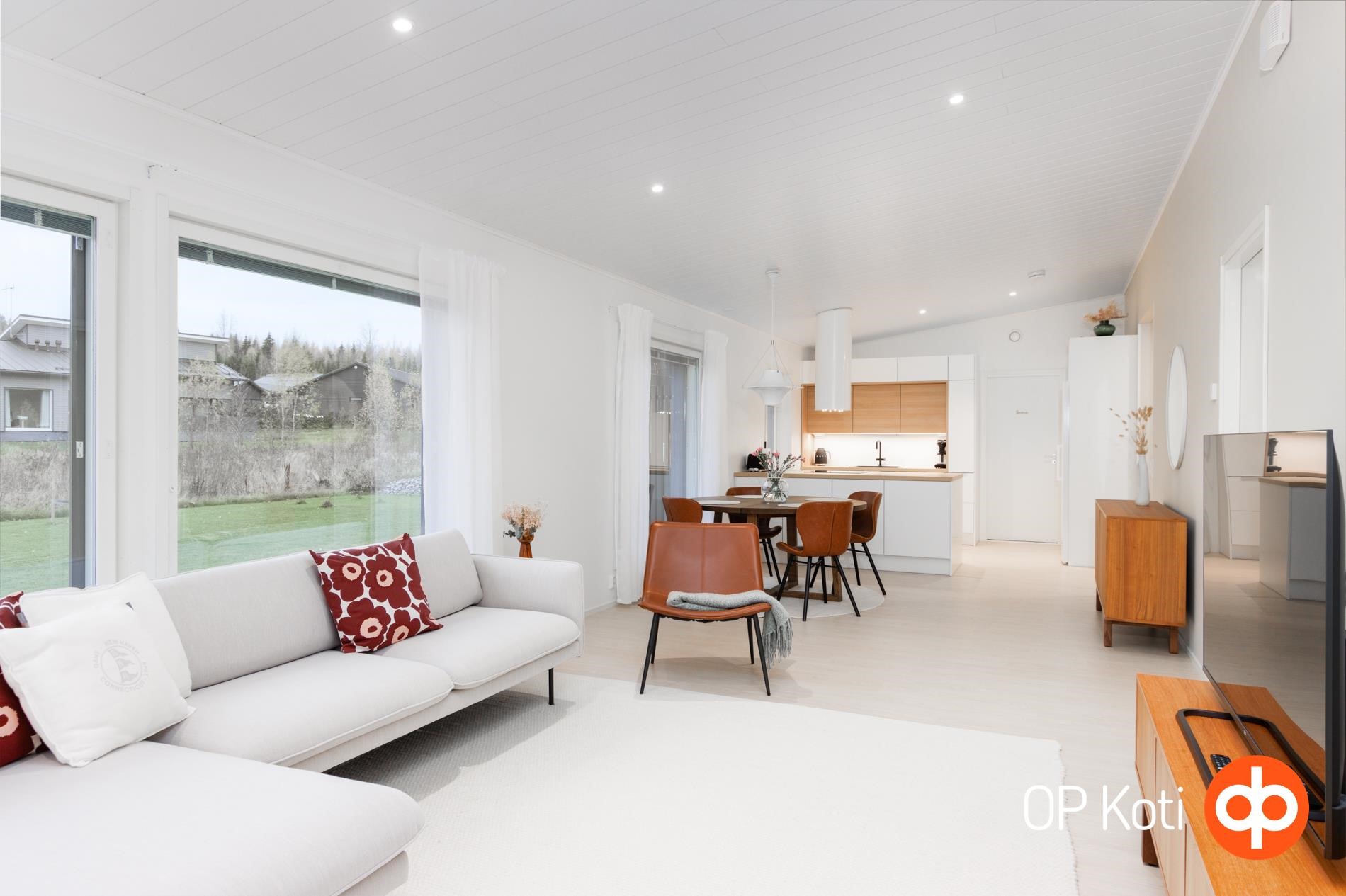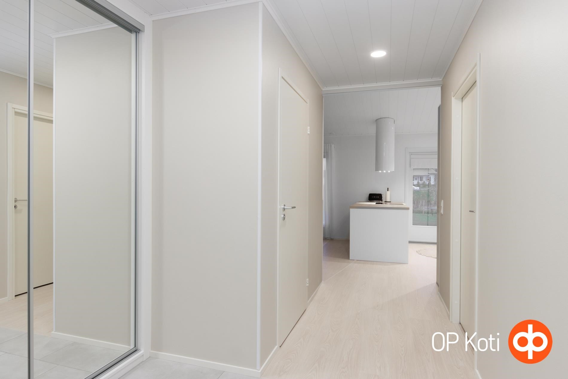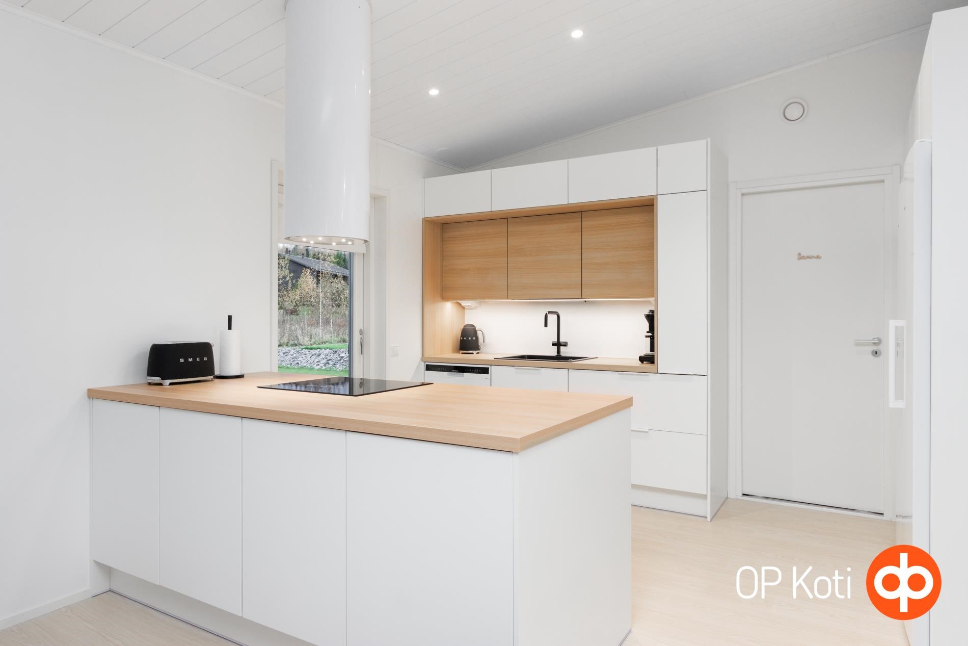 Nykyaikainen keittiö reiluine kaapistoineen, tasoineen ja ruokailutiloineen yhdistyy luontevasti olohuoneeseen, jossa on hyvin tilaa ja valo tulvii isoista ikkunoista. Makuuhuoneita on kolme ja isoimmassa muodostettu kätevä walk in closet säilytykseen. Kodinhoitohuone on tilava ja toimiva omalla sisäänkäynnillä, ehdottoman toimiva siis lemmikeille ja lapsille.