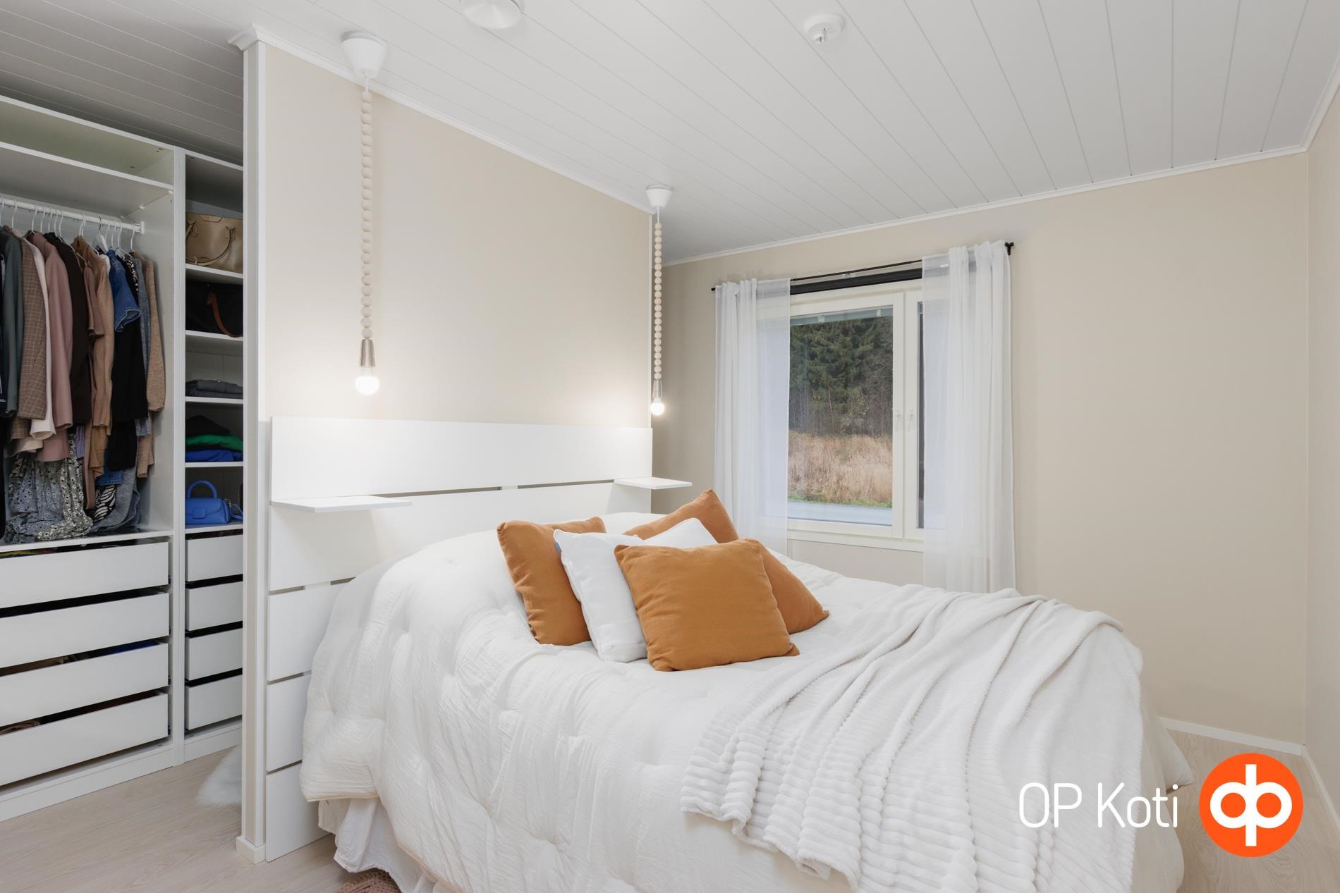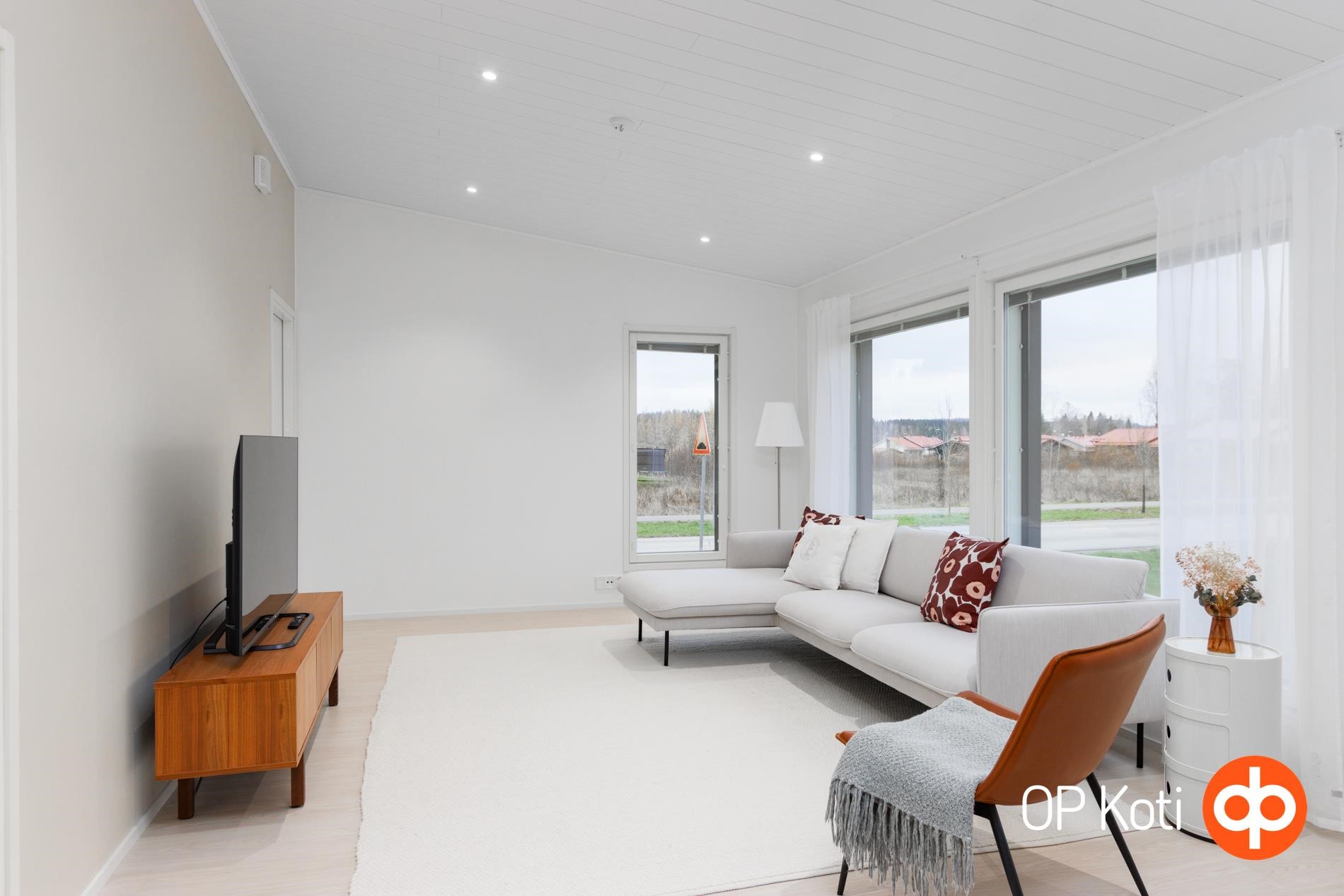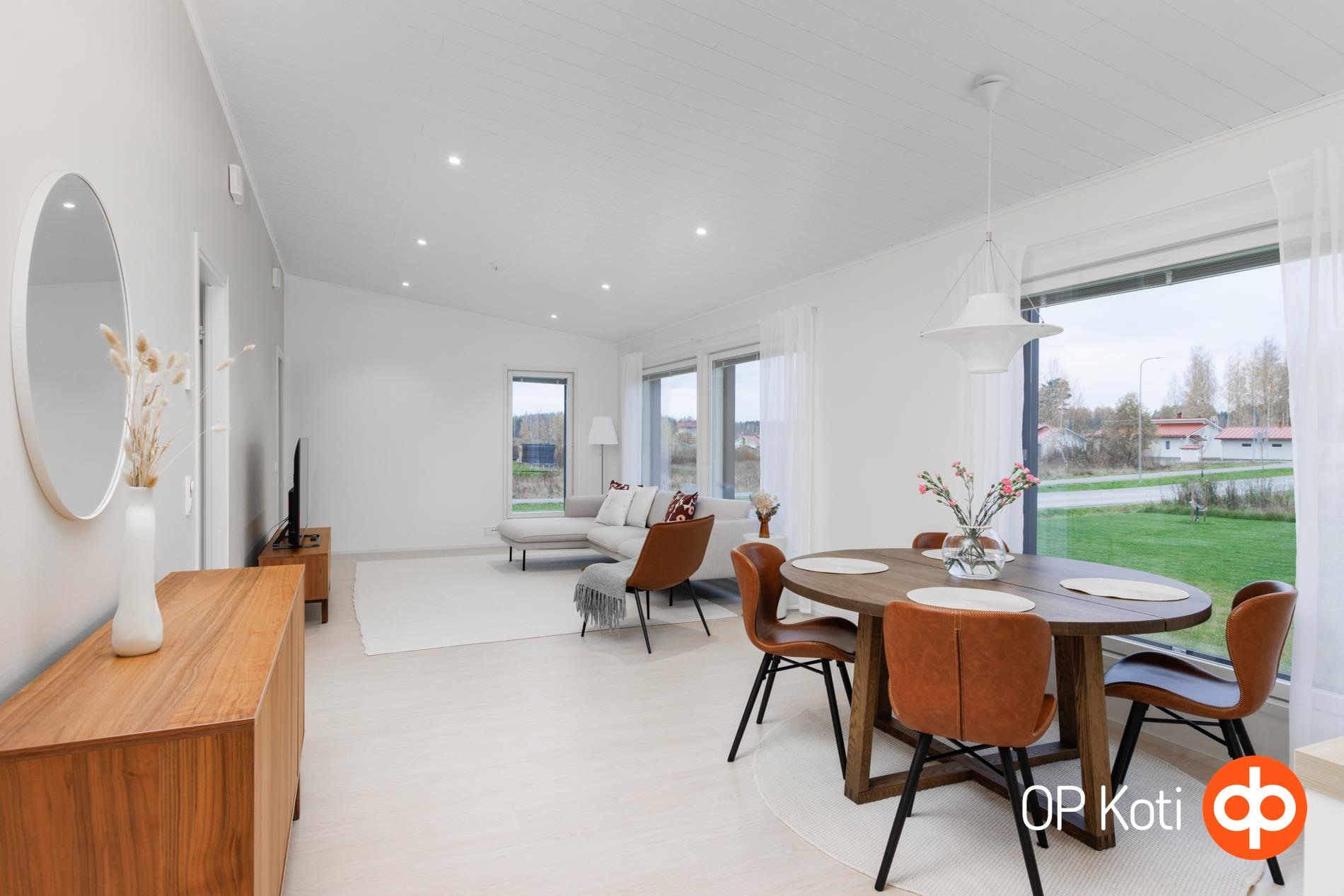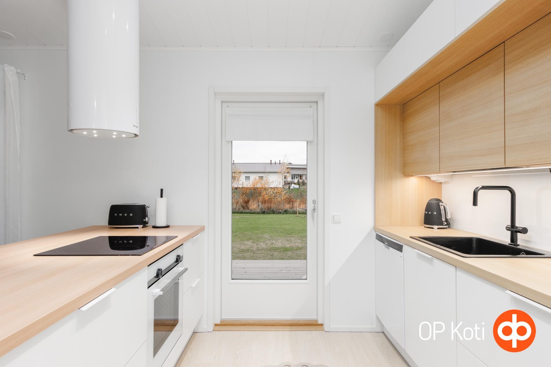 Nykyaikainen keittiö reiluine kaapistoineen, tasoineen ja ruokailutiloineen yhdistyy luontevasti olohuoneeseen, jossa on hyvin tilaa ja valo tulvii isoista ikkunoista. Makuuhuoneita on kolme ja isoimmassa muodostettu kätevä walk in closet säilytykseen. Kodinhoitohuone on tilava ja toimiva omalla sisäänkäynnillä, ehdottoman toimiva siis lemmikeille ja lapsille.