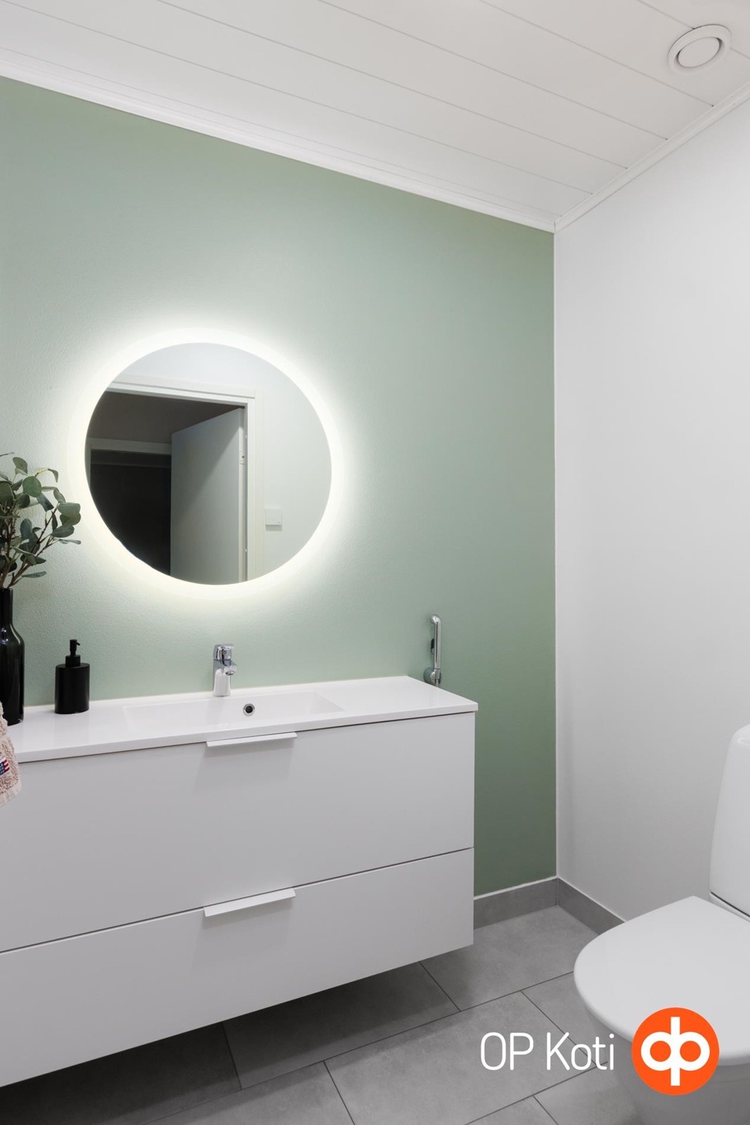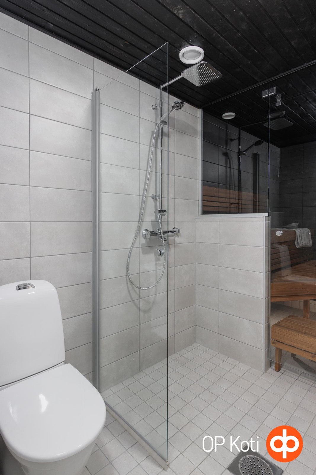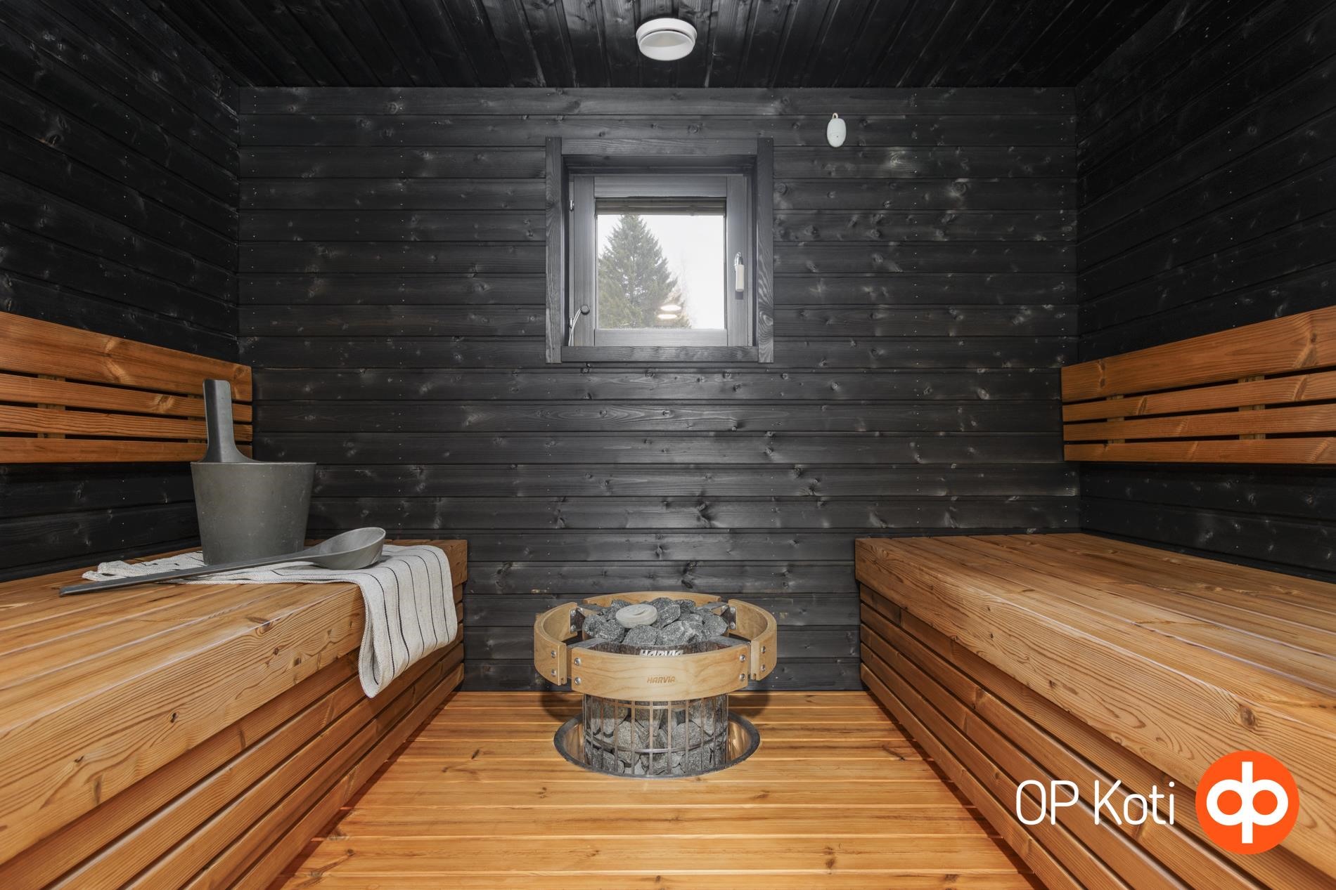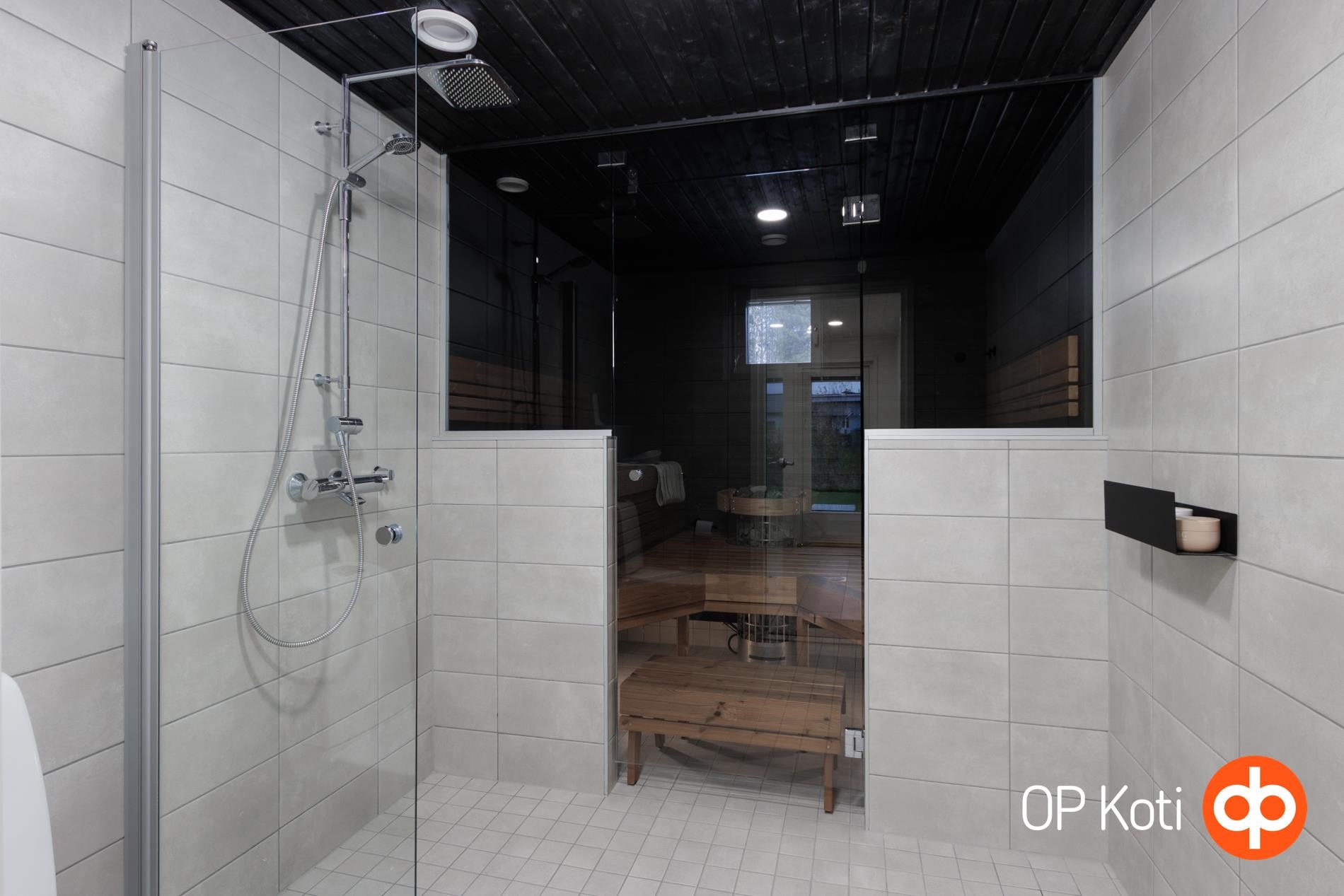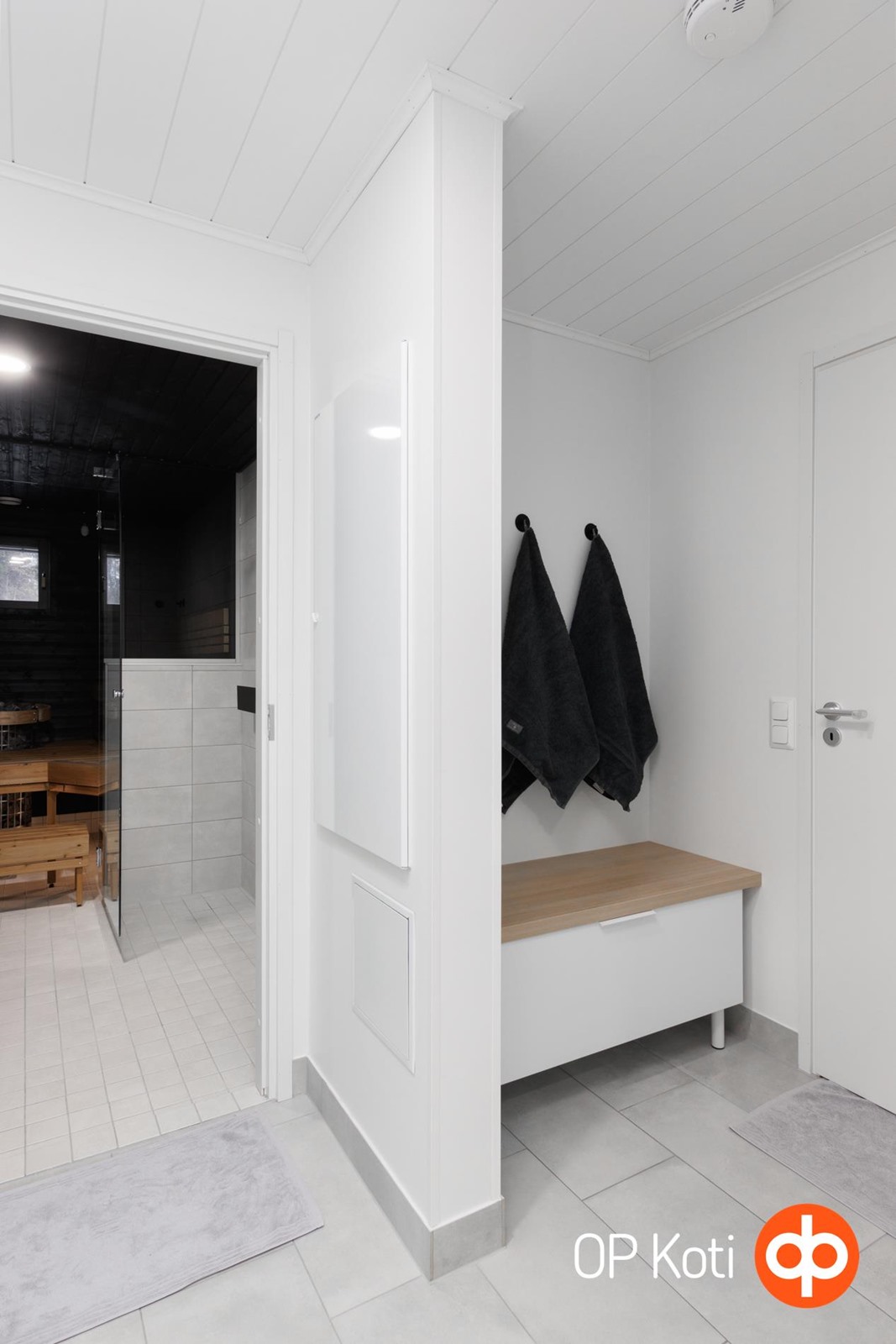 - Sauna, sähkökiuas, kylpyhuone, erillinen wc, suihku, peilit, kaapit, allaskaappi, pesukoneliitäntä, lattialämmitys, kiinteät valaisimet.