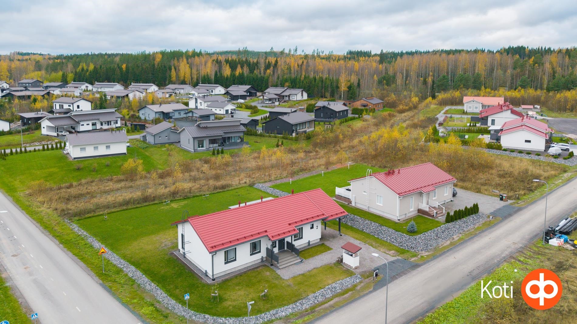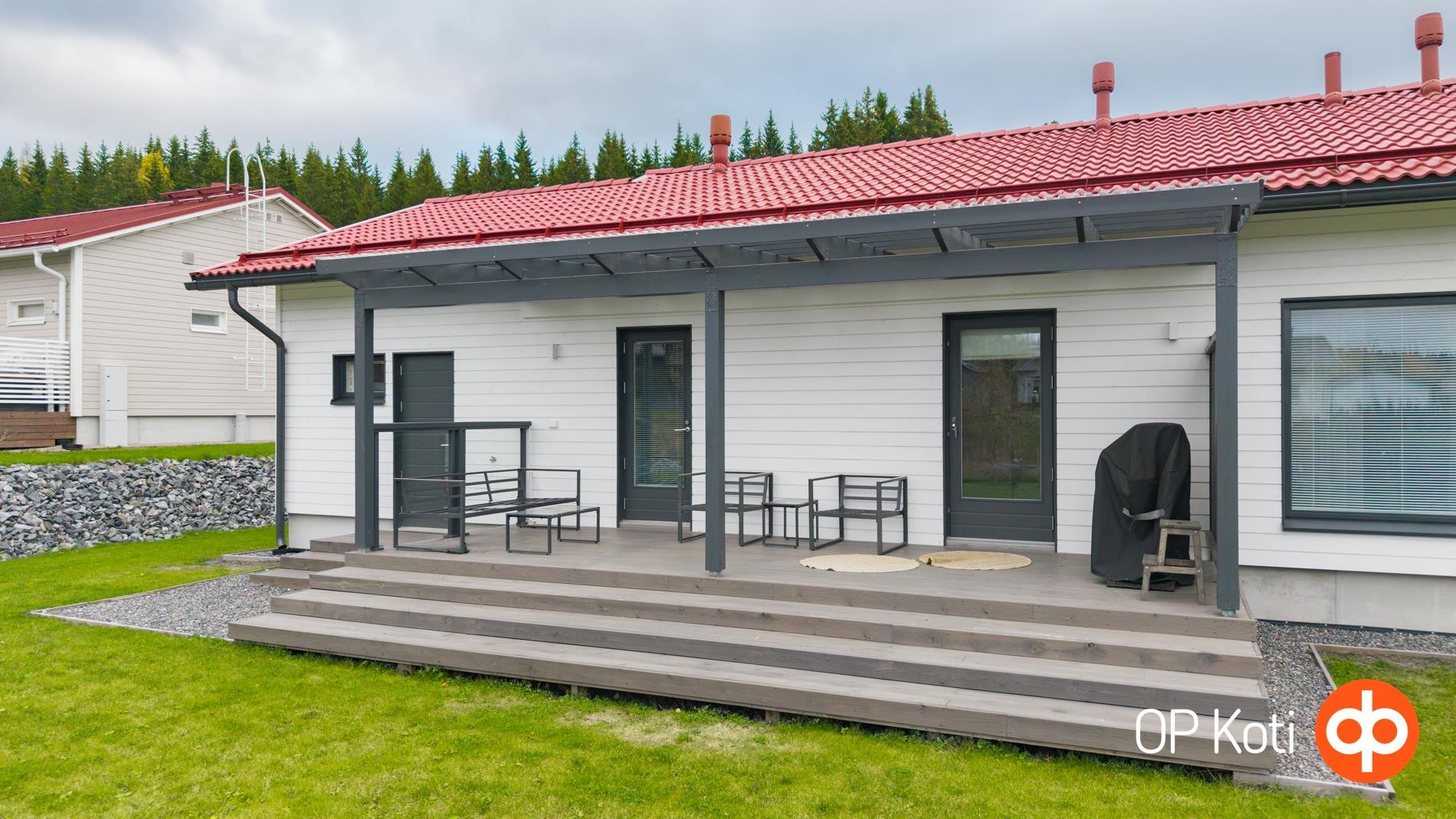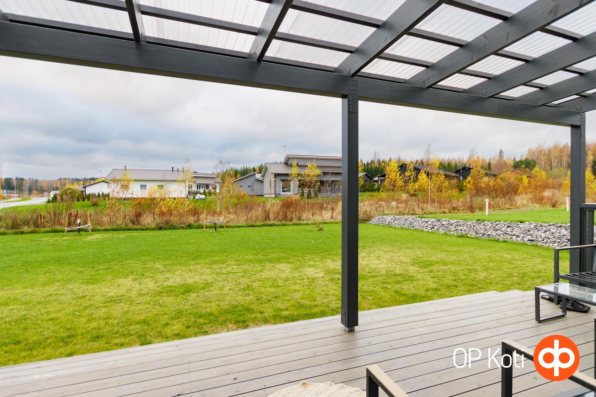 Kiva ja tilava katettu terassi sekä tasainen piha perheen yhteiseen oleskeluun. Tontti on oma ja rakennusoikeuttakin löytyy vielä vaikkapa piharakennukselle! Autolle löytyy oma katos ja varastotilaa erilisen varaston turvin.