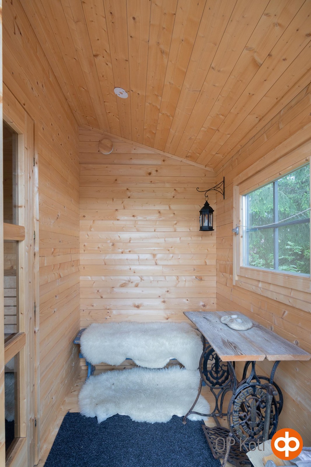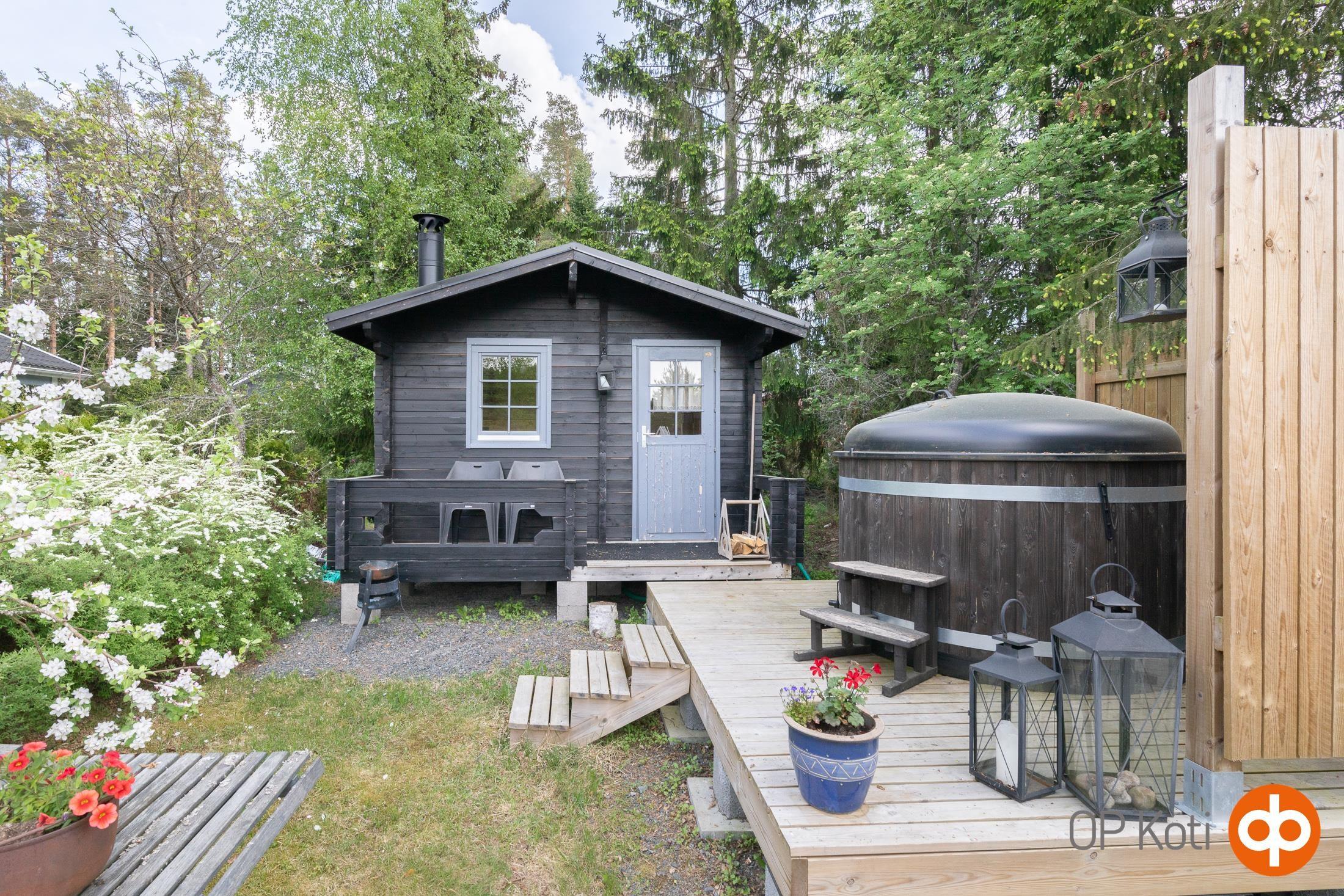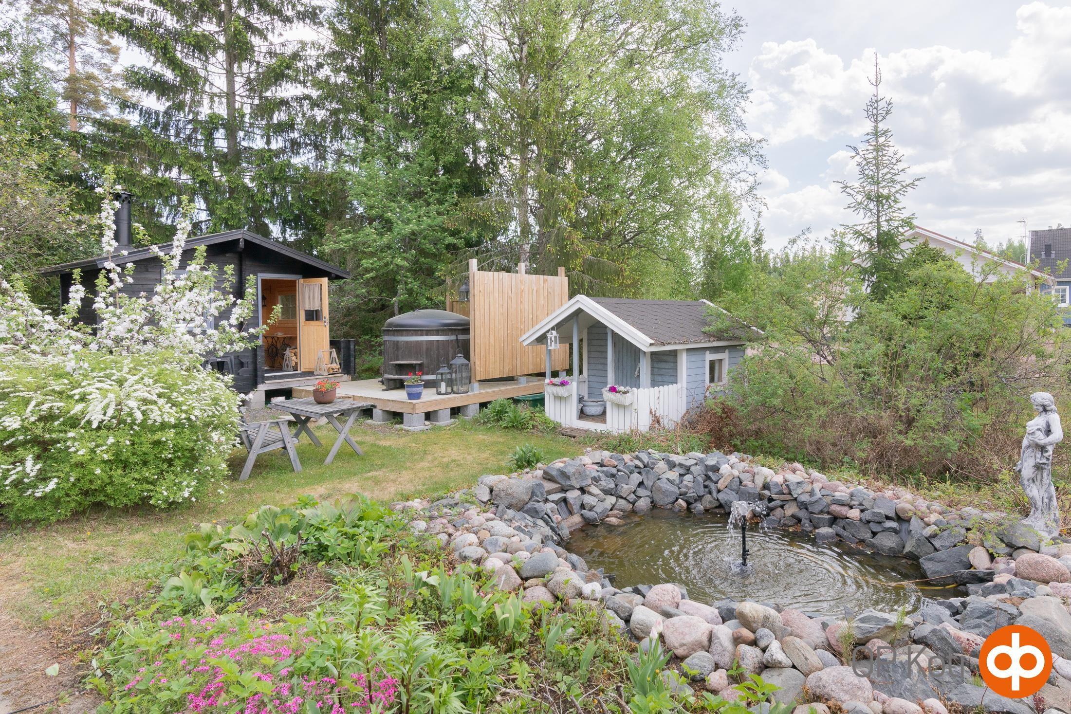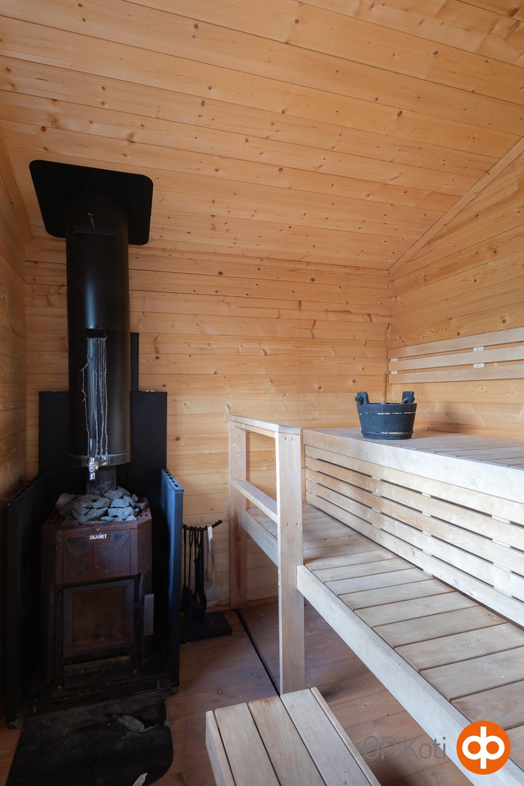 Idyllinen pihasauna ja sen vieressä palju tarjoavat rentoutumisen paikan.