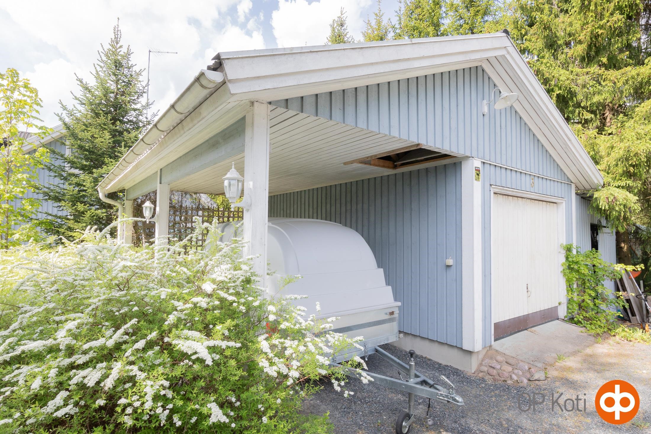 Pihalta löytyy myös autotallirakennus, joka lisää säilytystilaa ja suojaa menopeleille ja puutarhakoneille.