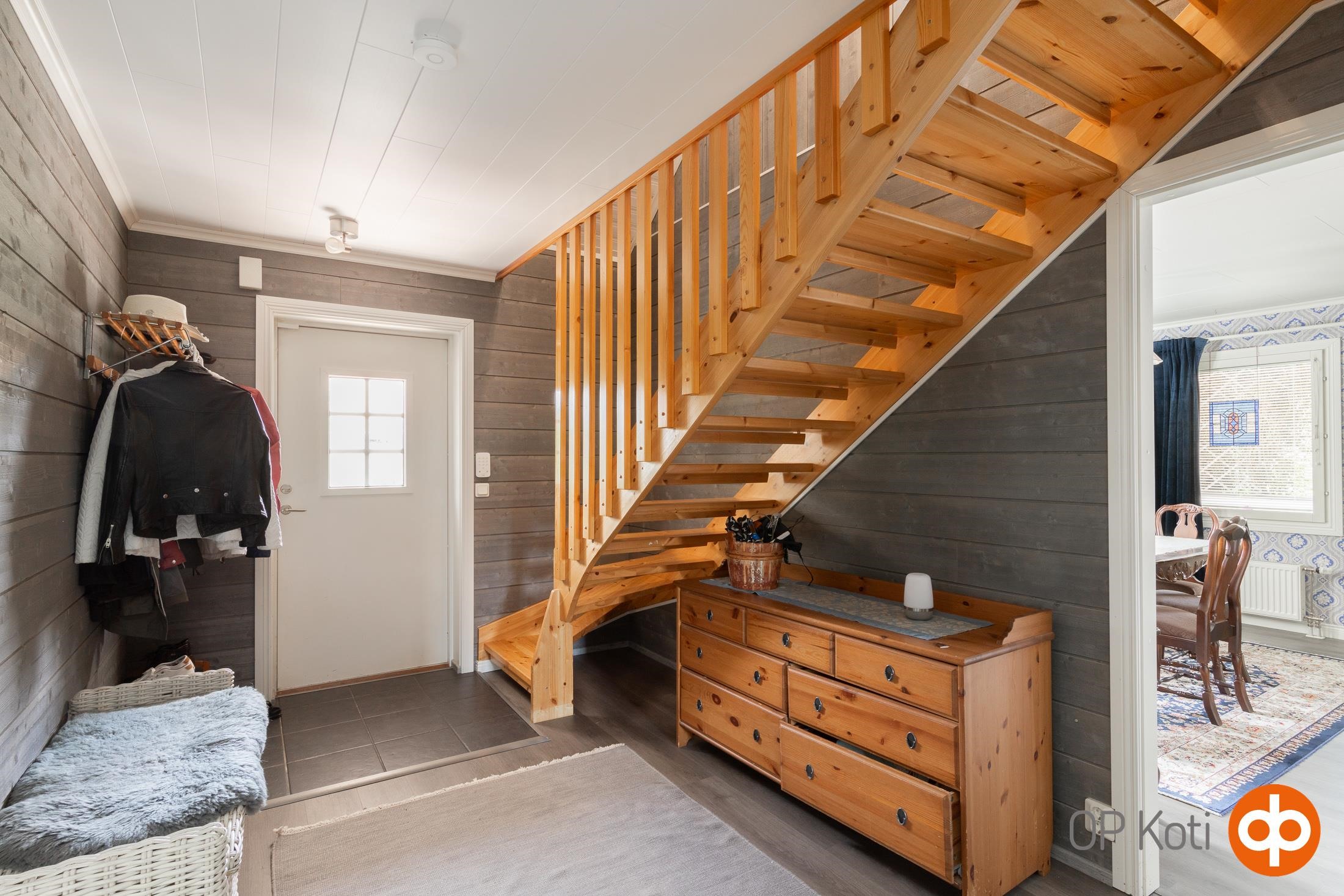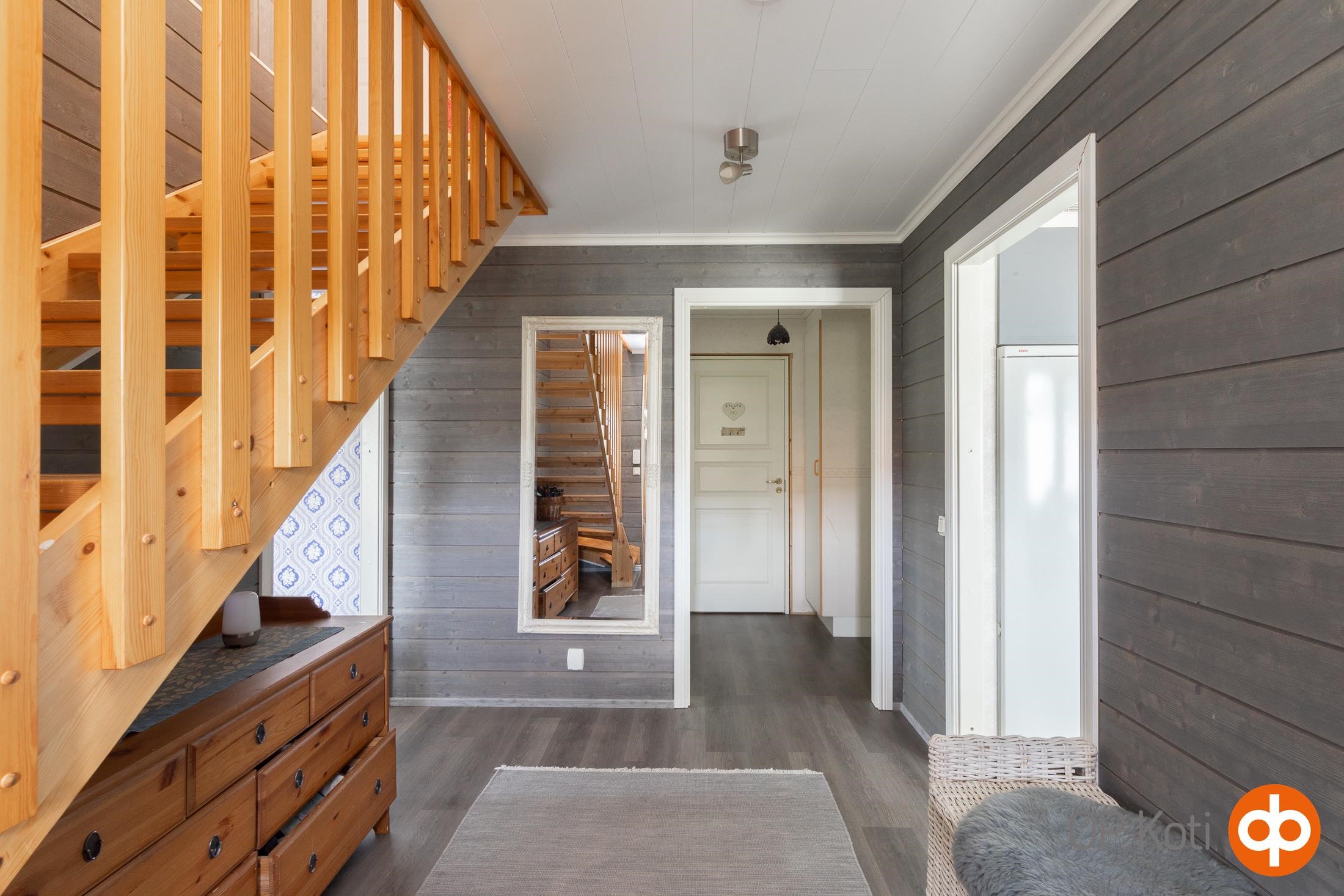 Tilava keittiö, käytännöllinen kodinhoitotila, sekä kulku remontoituihin kylpyhuoneeseen ja saunatiloihin. Olohuone ja takkahuone muodostavat avaran tilan perheen yhdessäoloon. Kaksi makuuhuonetta alakerrassa ja kaksi yläkerrassa. Yläkerran makuuhuoneita yhdistää viihtyisä aulatila, joka soveltuu erinomaisesti etätyötilaksi tai oleskeluun. Molemmissa kerroksissa on erilliset wc-tilat, jotka tuovat arkeen helppoutta ja mukavuutta.