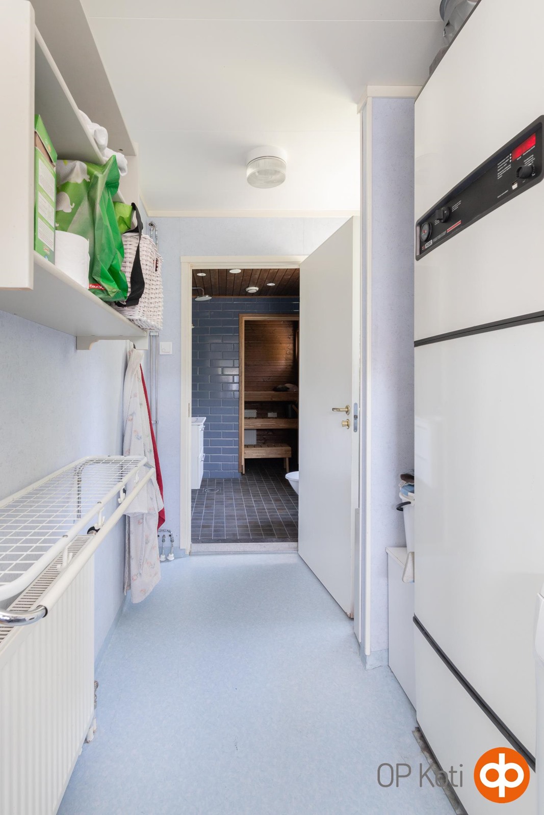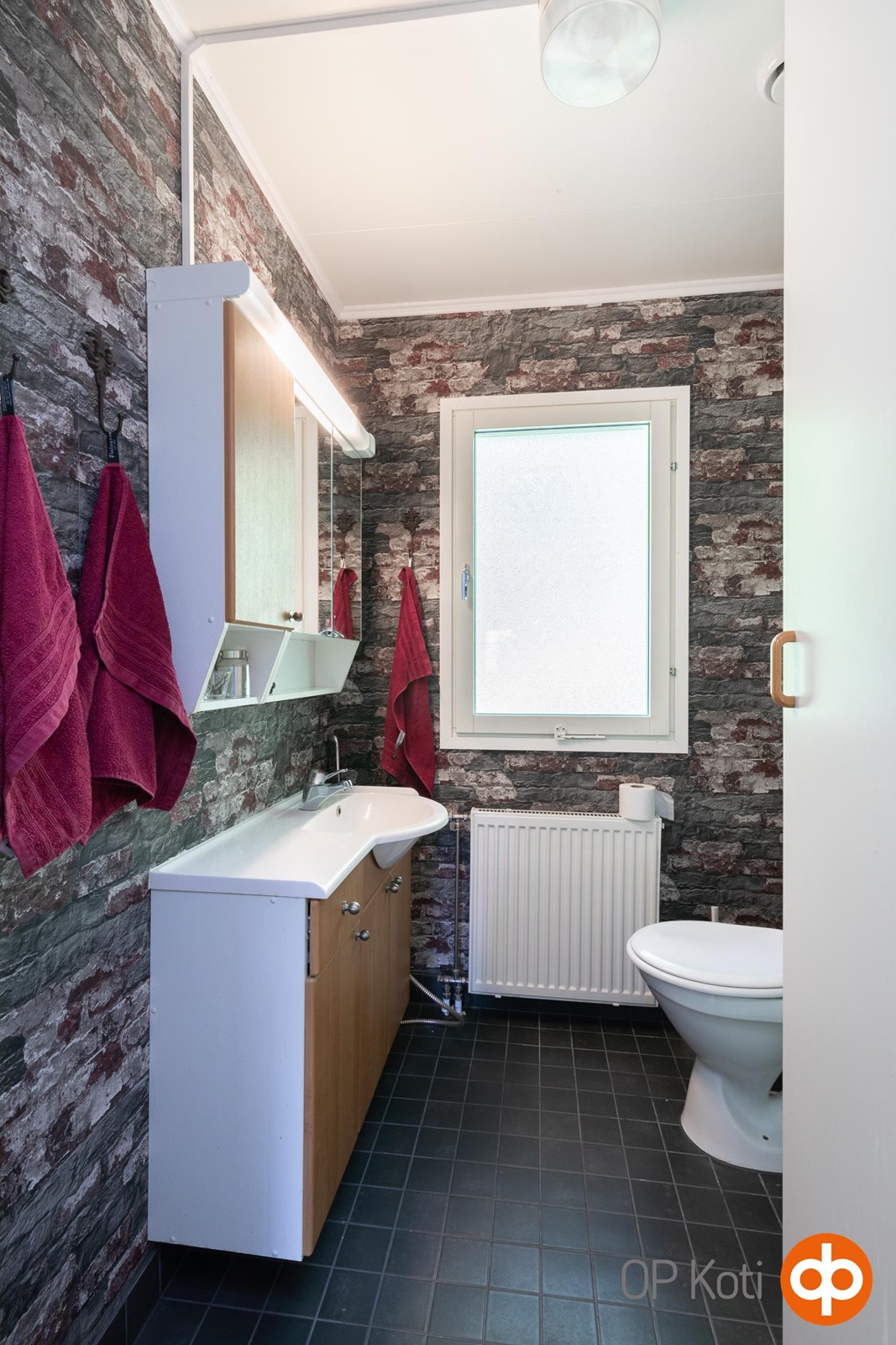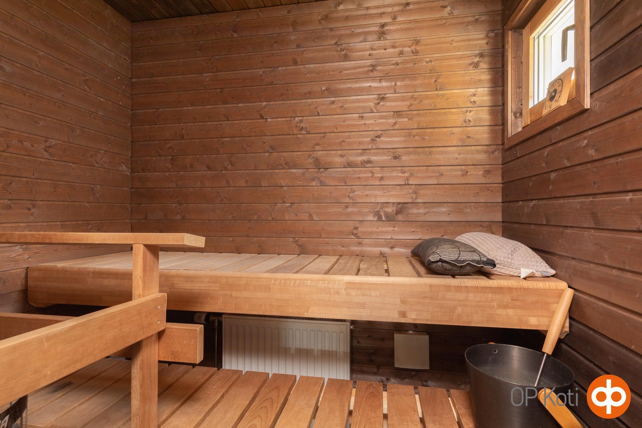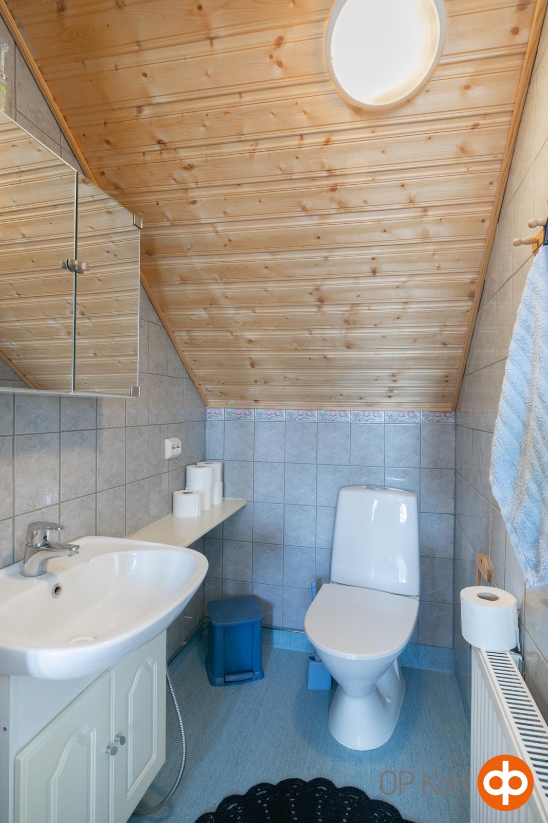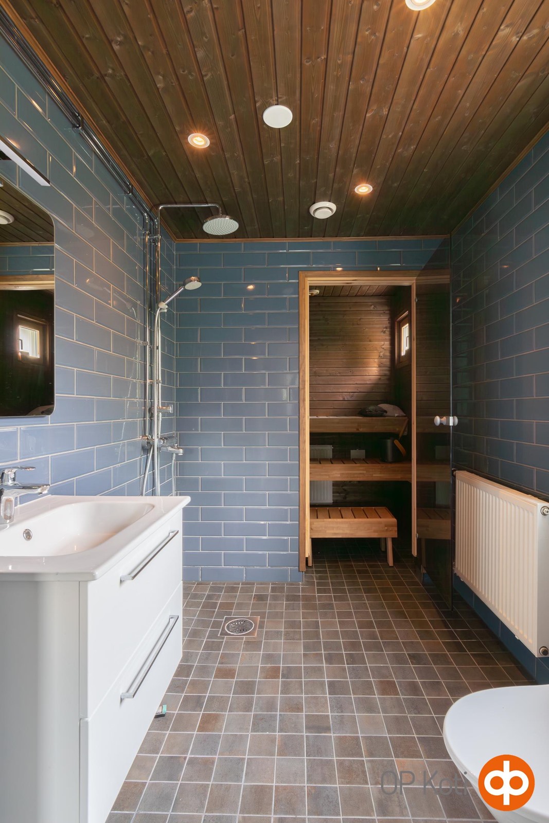 - Sauna, sähkökiuas, kylpyhuone, erillinen wc ala- ja yläkerrassa, suihku, peilikaappi, allaskaappi, pesukoneliitäntä kodinhoitohuoneessa, lattialämmitys alakerran wc + kylpyhuone, kiinteät valaisimet.