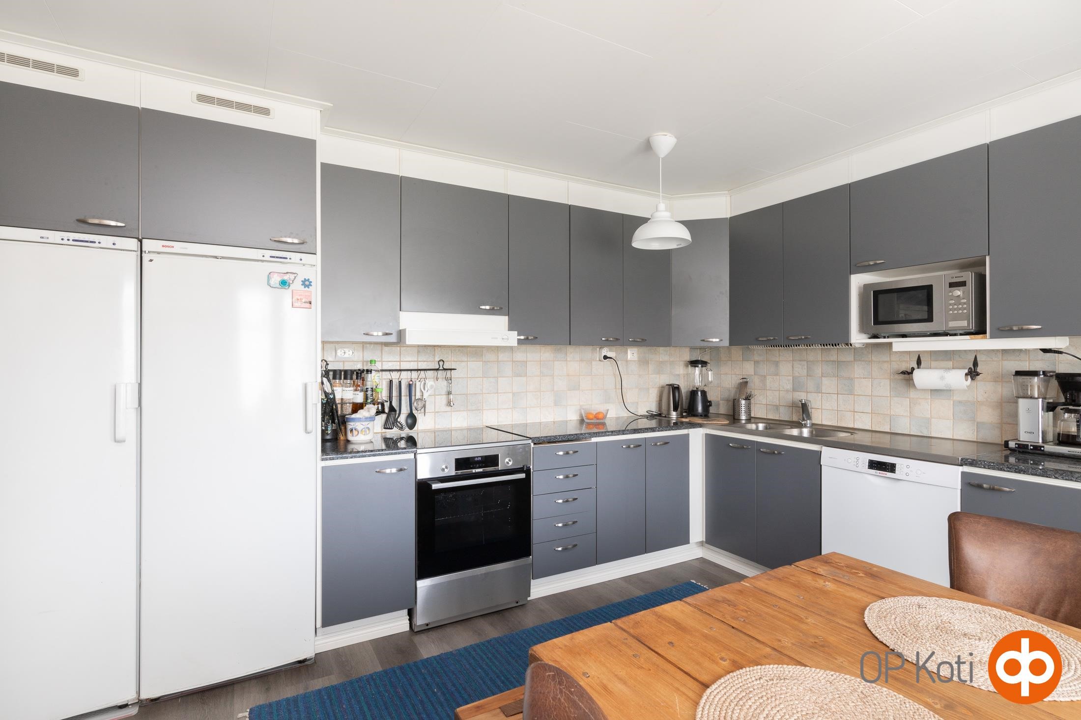 - Jääkaappi, pakastekaappi, sähköliesi 2024, liesituuletin hormi, astianpesukone, kaapistot, kiinteät valaisimet.