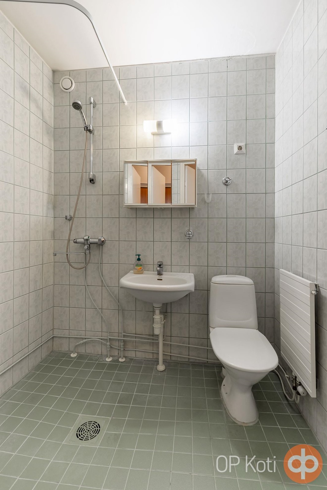 - Kylpyhuone, suihku, peilikaappi, pesukoneliitäntä, kiinteät valaisimet. Kylpyhuoneessa patteri