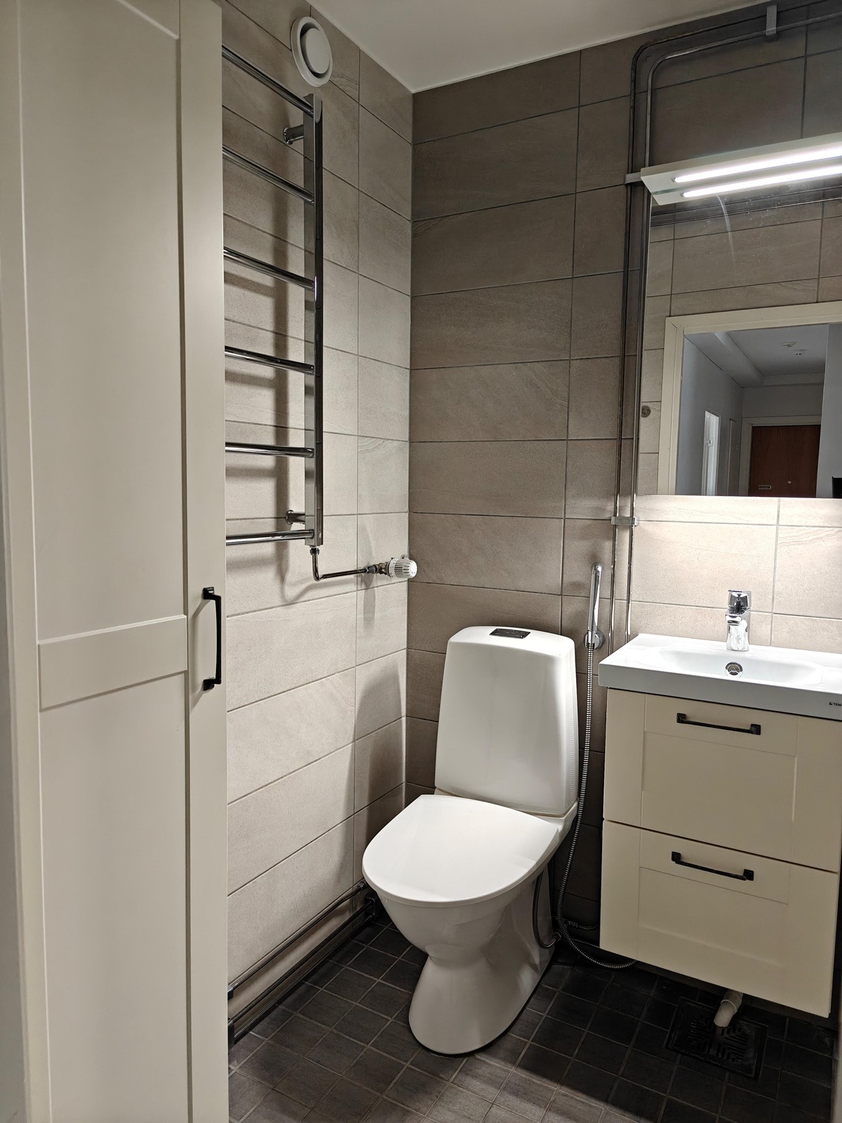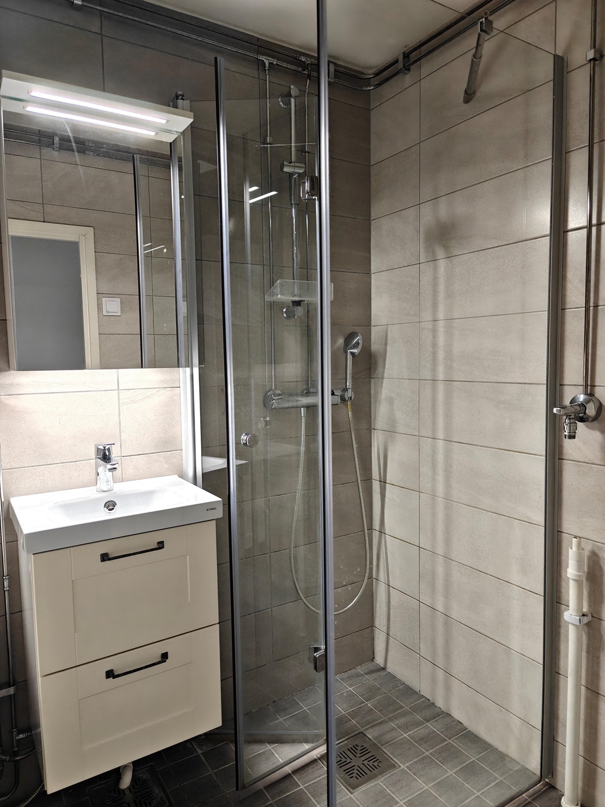 - Kylpyhuone, suihku, suihkuseinä, peilikaappi, kaapit, allaskaappi, pesukoneliitäntä, lattialämmitys, kiinteät valaisimet, Pyyhekuivain.