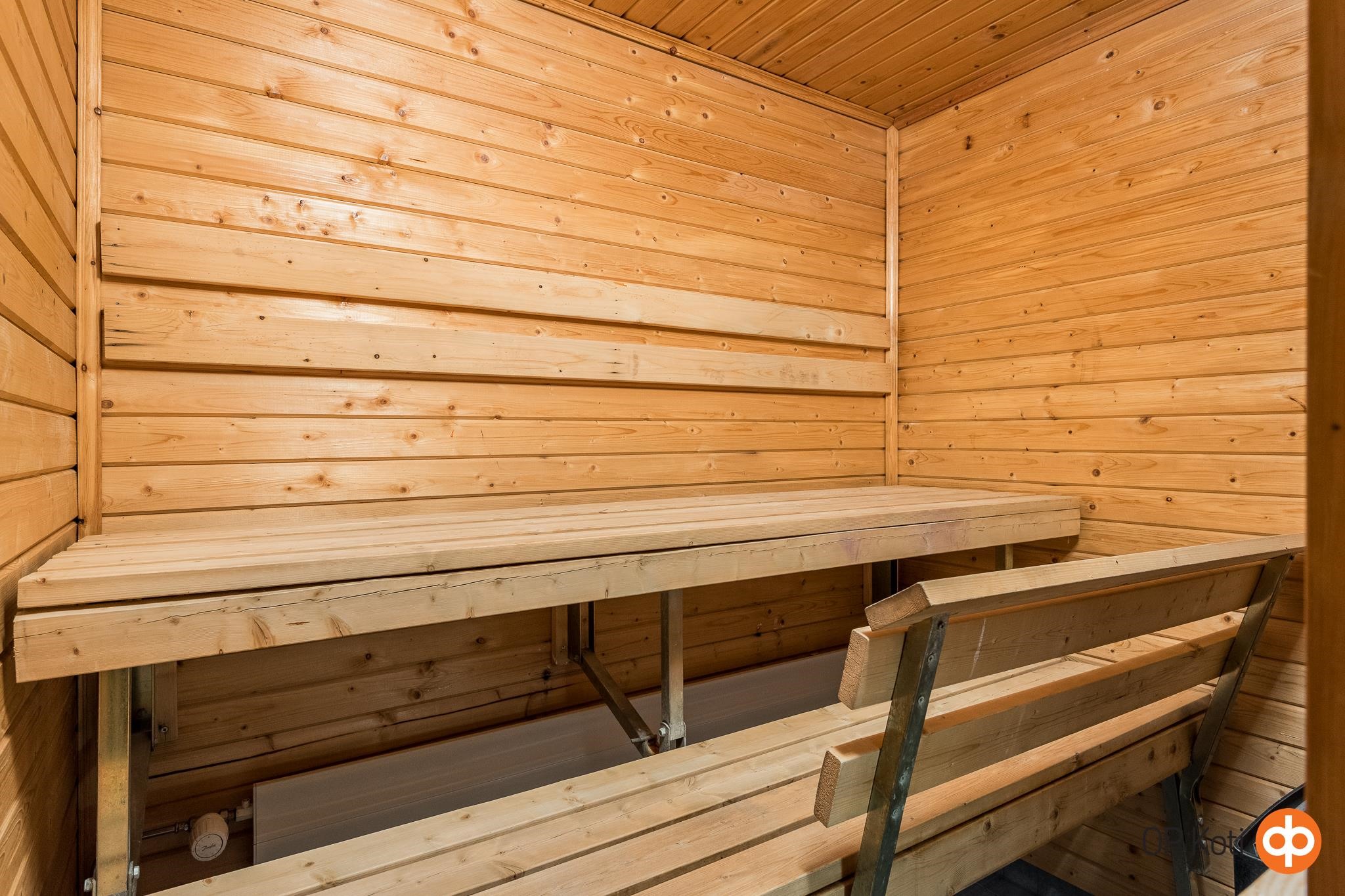 - Sauna, sähkökiuas, kylpyhuone, suihku, allaskaappi, pesukoneliitäntä, kiinteät valaisimet.