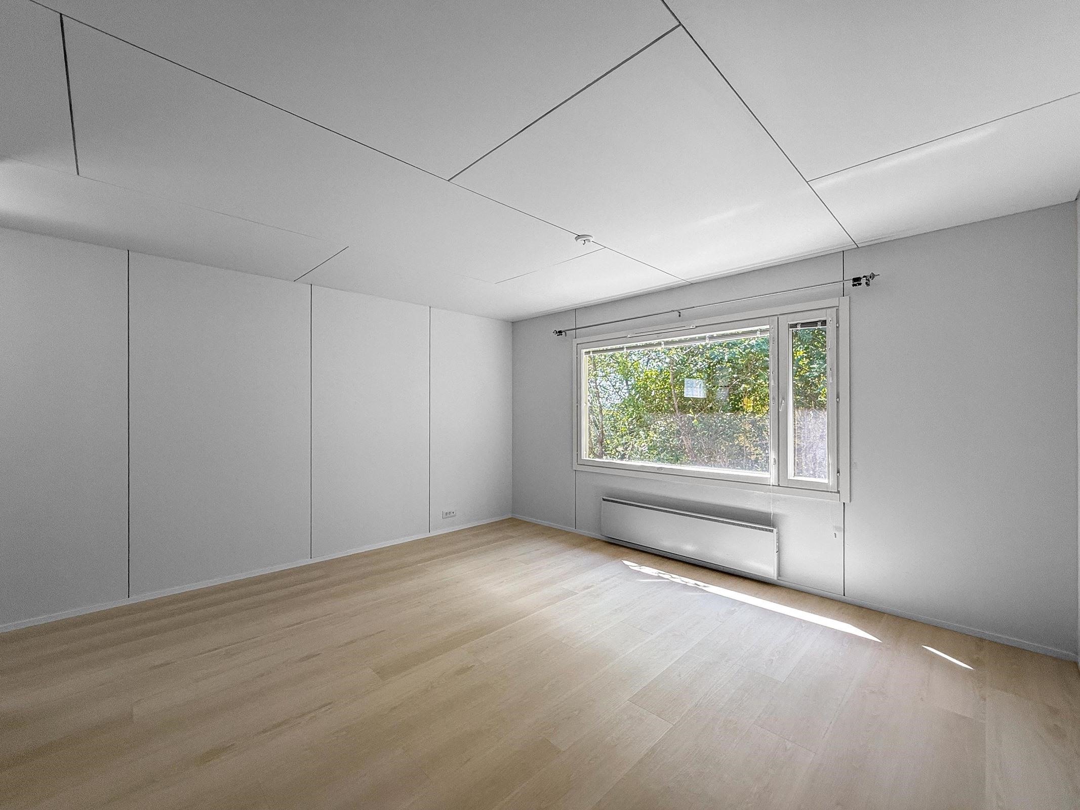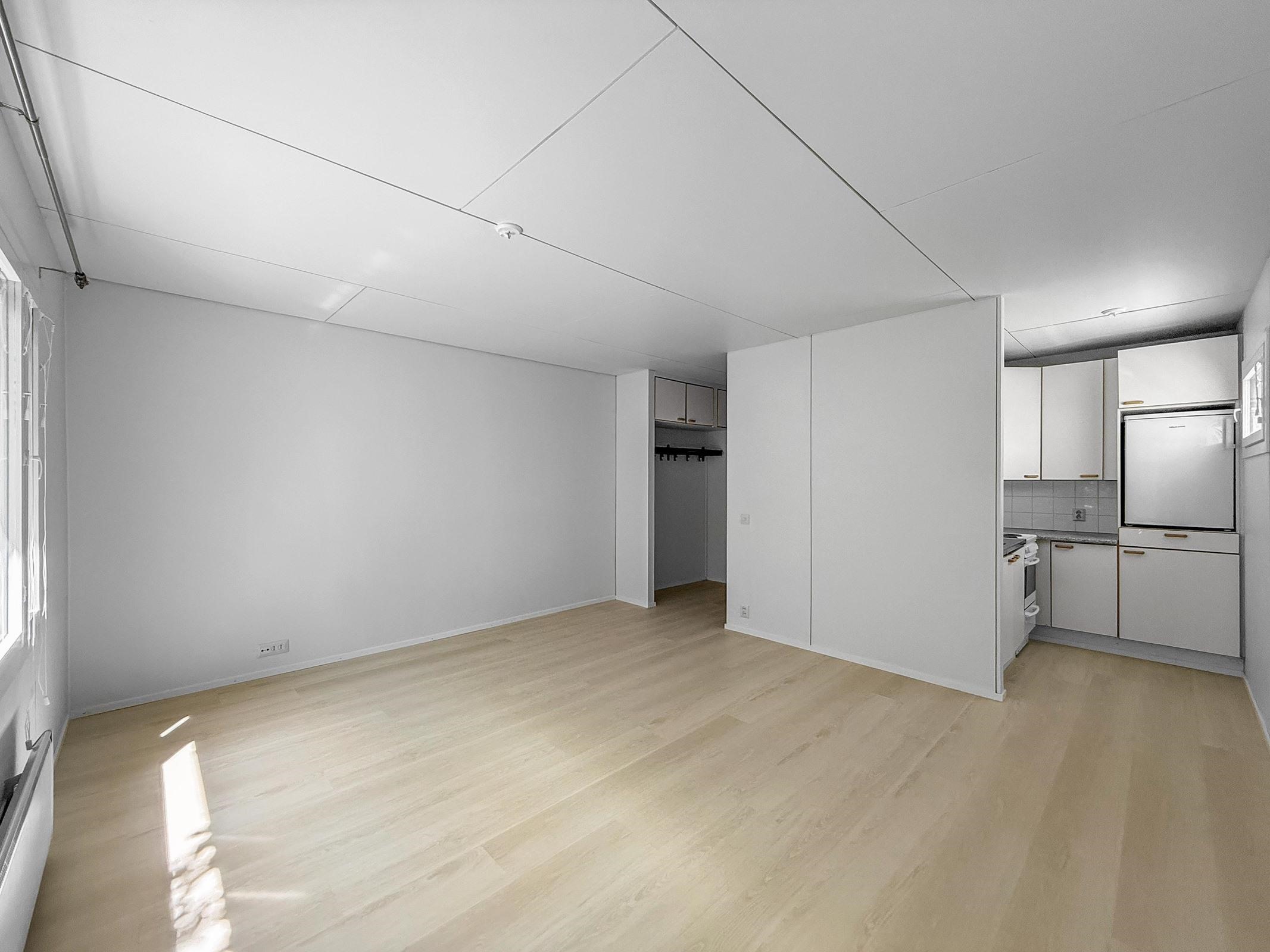 Olohuone/keittiö: Lattia laminaatti, seinät maalattu. Makuuhuone: Lattia laminaatti, seinät maalattu. Kylpyhuone: Laatoitettu.