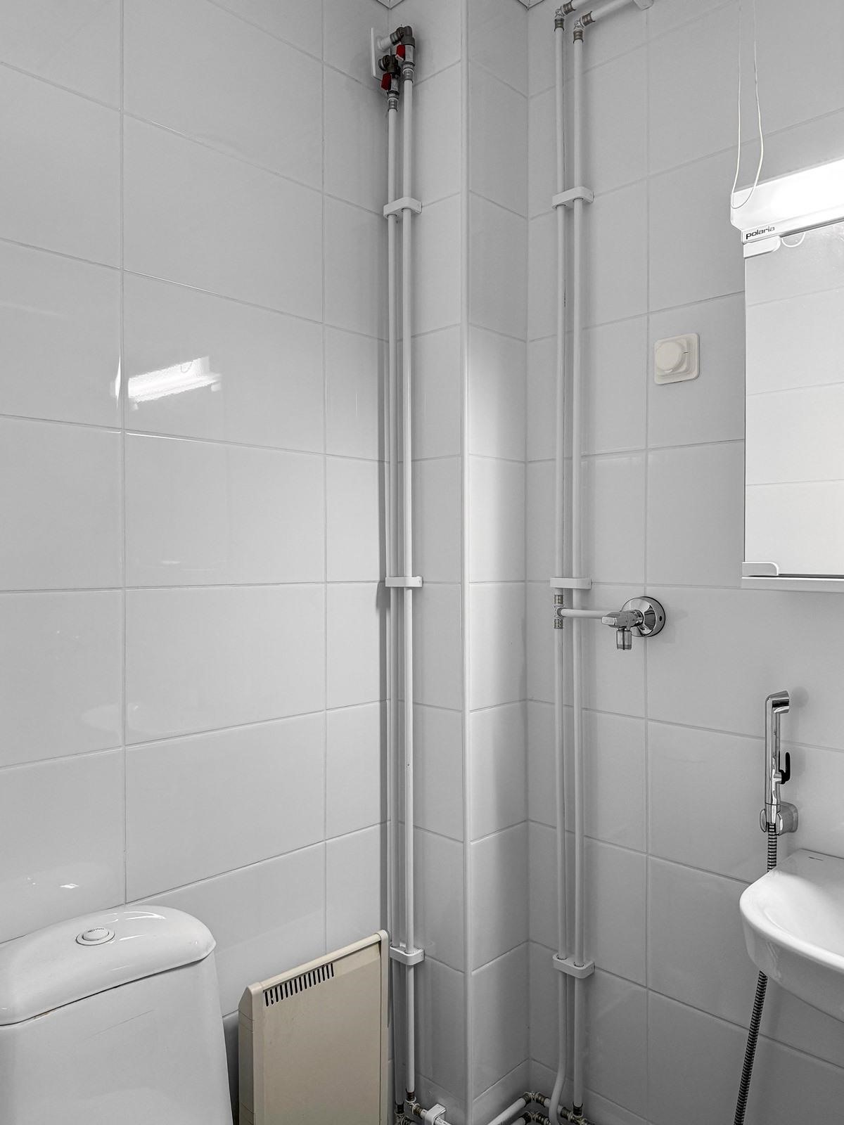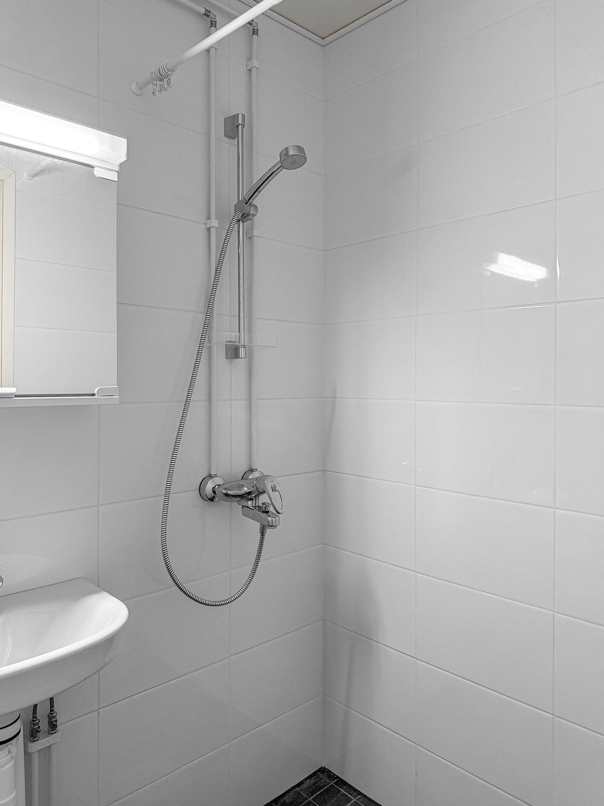 - Kylpyhuone, suihku, peilikaappi, pesukoneliitäntä, kiinteät valaisimet.