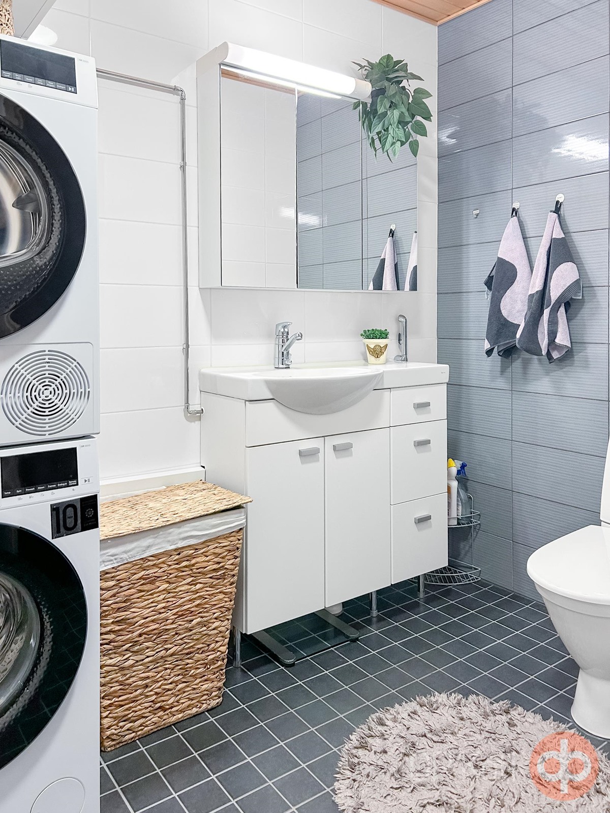 - Sauna, sähkökiuas, kylpyhuone, suihku, peilikaappi, allaskaappi, pesukoneliitäntä, lattialämmitys, kiinteät valaisimet.