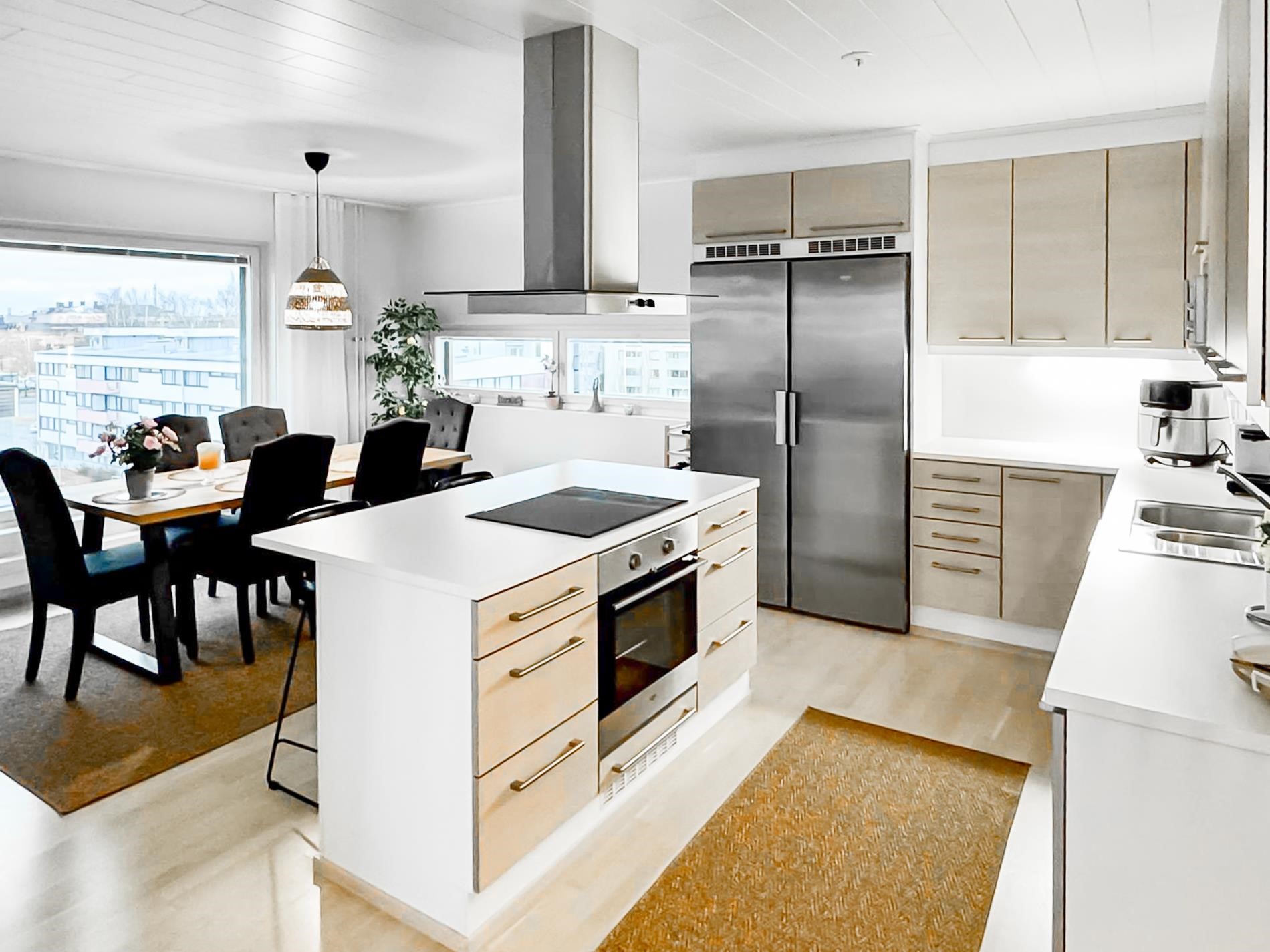 Asunnossa sinua ovat vastassa näkymät kolmeen ilmansuuntaan. Asunnossa on kolme huonetta, tilava keittiö ja ruokailutila, pesuhuone sekä oma sauna, joka kruunaa kodin. Tilavan keittiön yhteydessä oleva suuri saareke tarjoaa erinomaisesti lasku- ja työskentelytilaa, mikä tekee ruoanlaitosta ja yhdessäolosta helppoa. Asunnon parkettilattiat tuovat lämpöä ja tyylikkyyttä ja hyvät kaappitilat sekä tilava ruokailutila varmistavat, että säilytystilaa ja viihtyisyyttä riittää kaikille. Olohuoneesta on käynti lasitetulle parvekkeelle, joka toimii lisähuoneena ja jossa voit nauttia vaikka rauhallisista kahvihetkistä. Kesähelteillä ilmalämpöpumppu tuo kaivattua viilennystä, pitäen asunnon lämpötilan miellyttävänä.