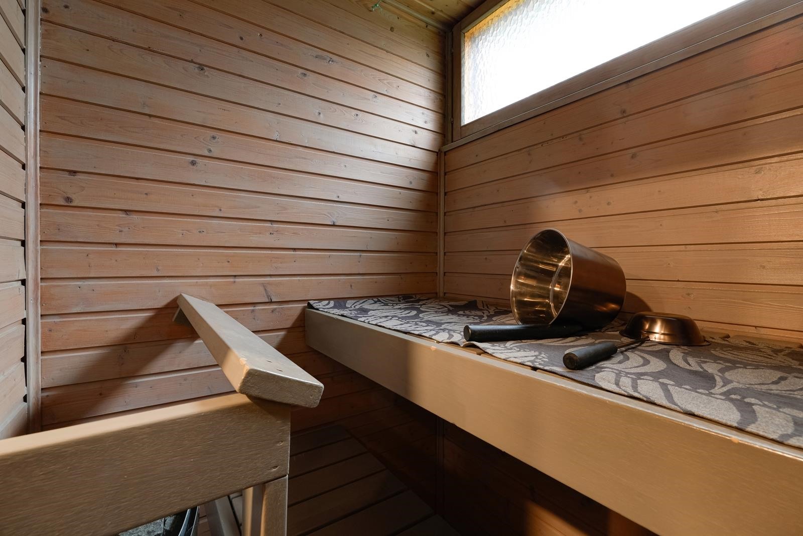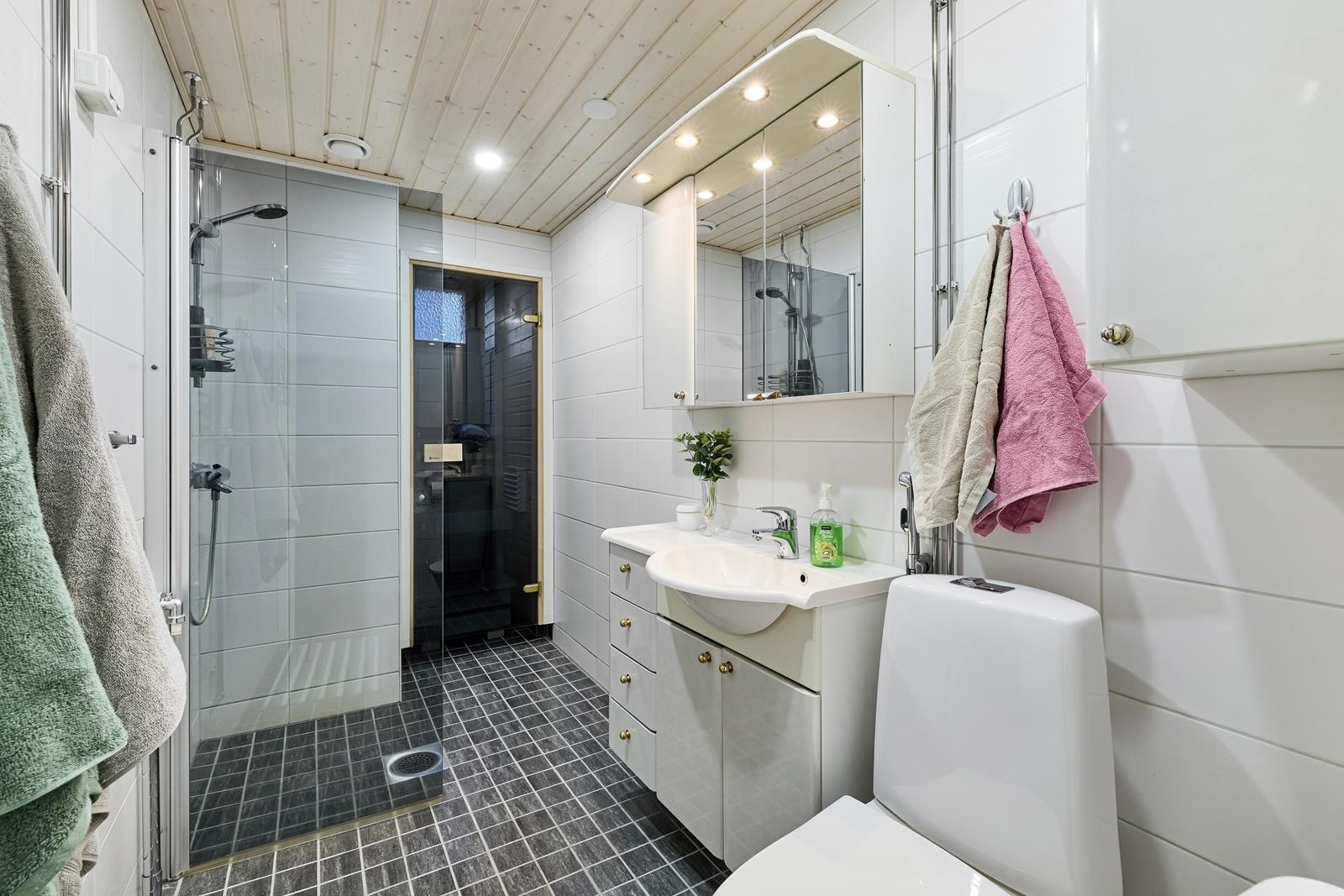 - Sauna, sähkökiuas, kylpyhuone, suihku, peilit, peilikaappi, allaskaappi, pesukoneliitäntä, lattialämmitys, kiinteät valaisimet. Kylpyhuone remontti tehty 2018.