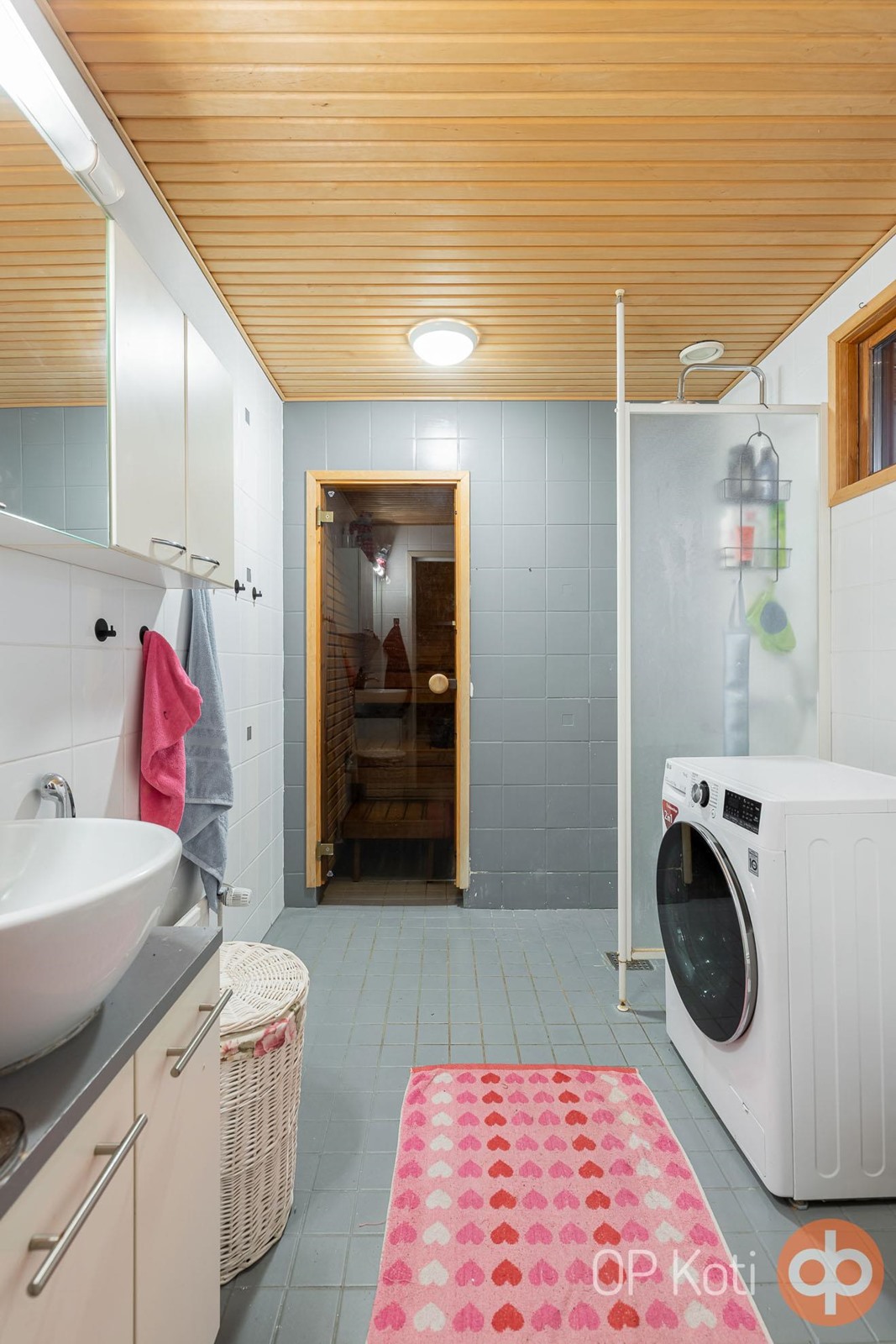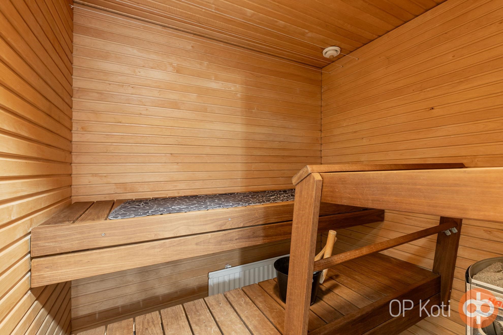 - Sauna, sähkökiuas, kylpyhuone, suihku, suihkuseinä, peilikaappi, kaapit, allaskaappi, pesukoneliitäntä, kiinteät valaisimet.