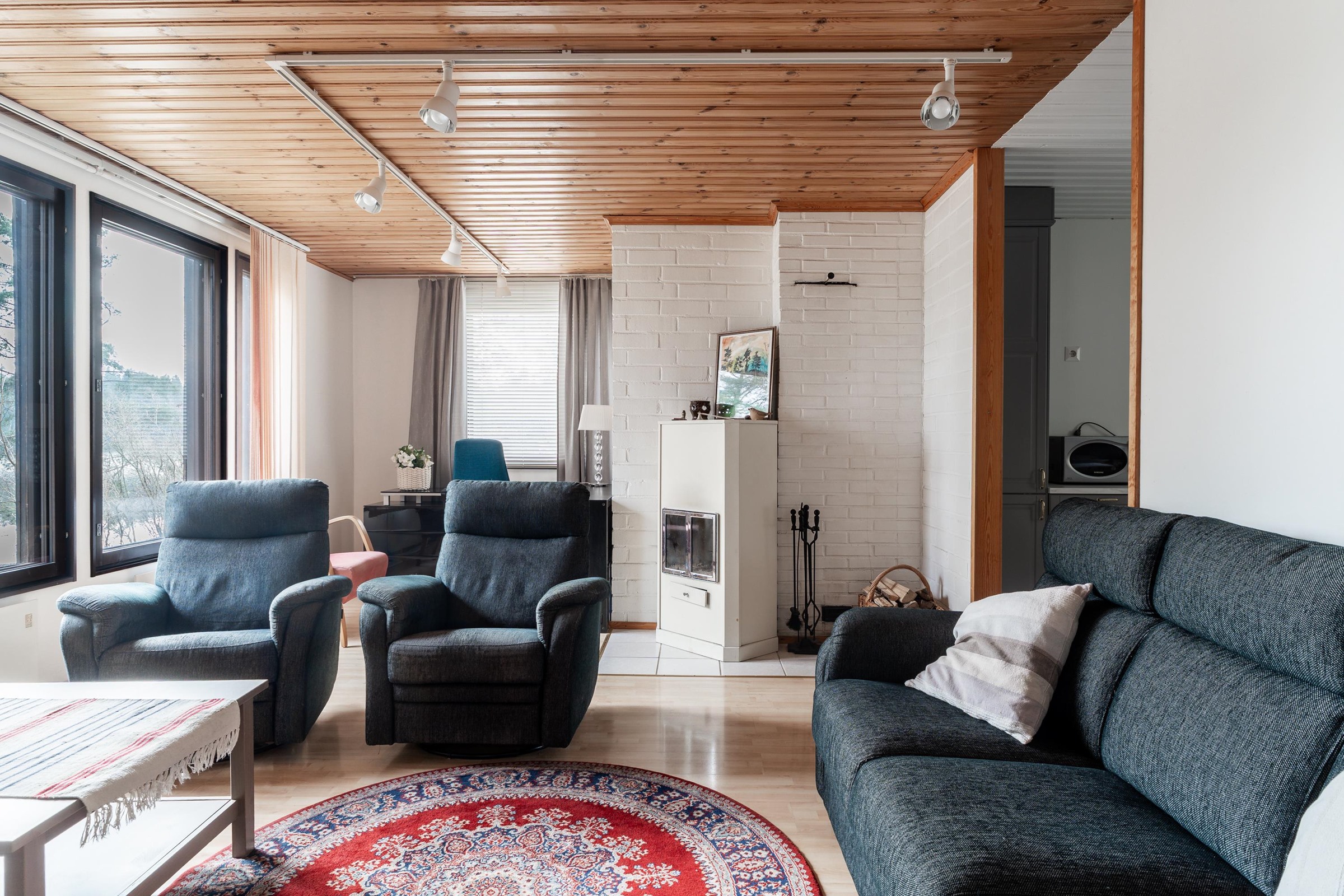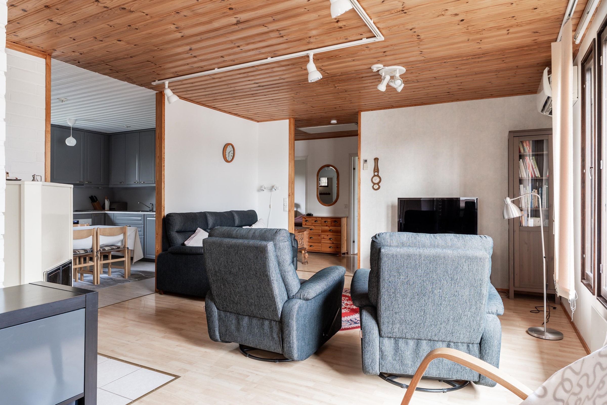 - Keittiö: Lattiat laminaatti / seinät maalattu. Olohuone: Lattiat laminaatti / seinät maalattu / tapetoitu. Makuuhuone 1: Muovimatto / seinät maalattu. Makuuhuone 2: Muovimatto / seinät maalattu. Sauna: Paneloitu. Kylpyhuone: Laatoitettu. Wc: Laatoitettu lattia ja puolet seinästä.
