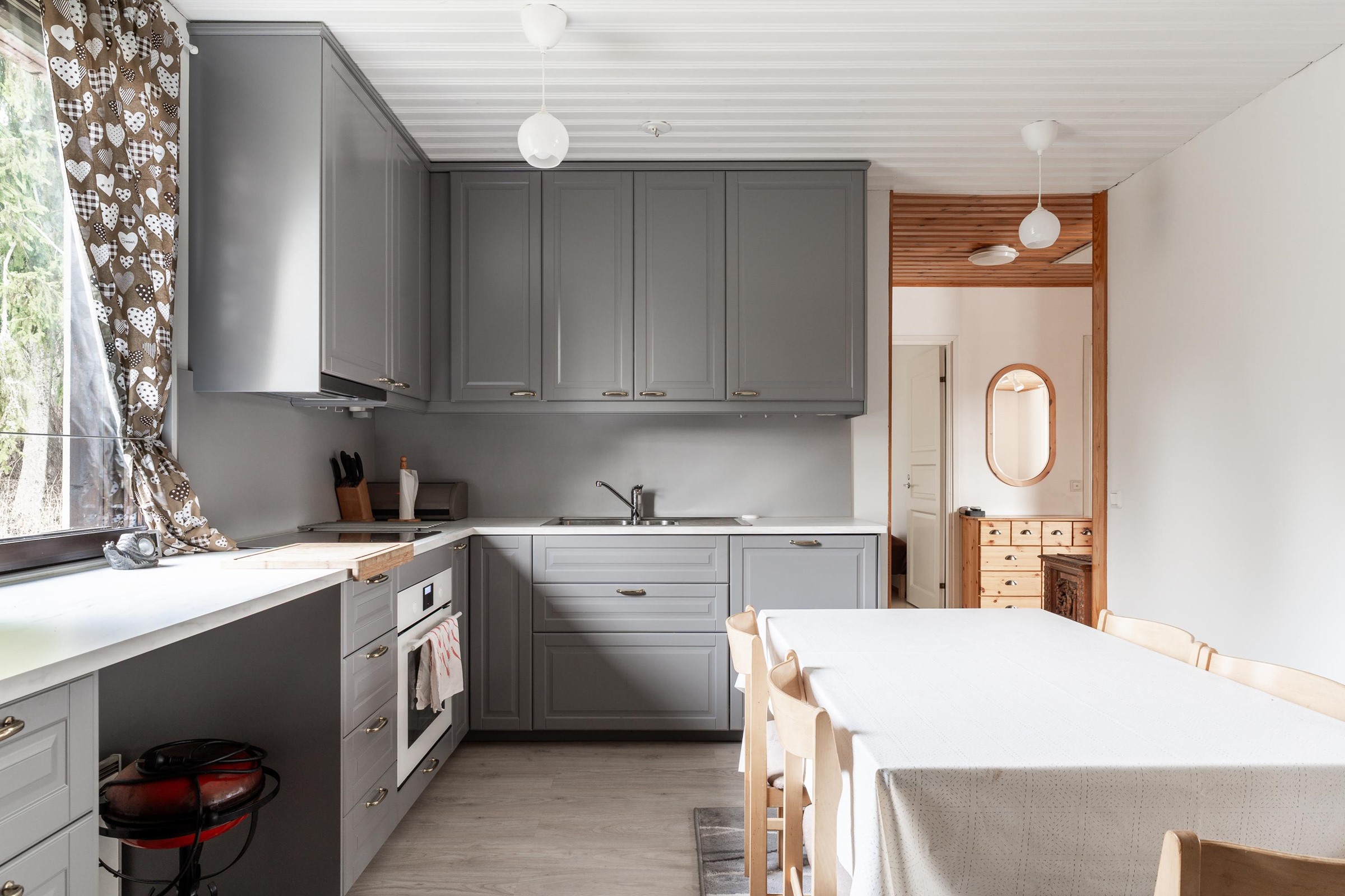 - Jääkaappipakastin, lattialiesi, erillisuuni, keraaminen liesi, astianpesukone, kaapistot, kiinteät valaisimet, pöytätasojen materiaali Laminaatti.