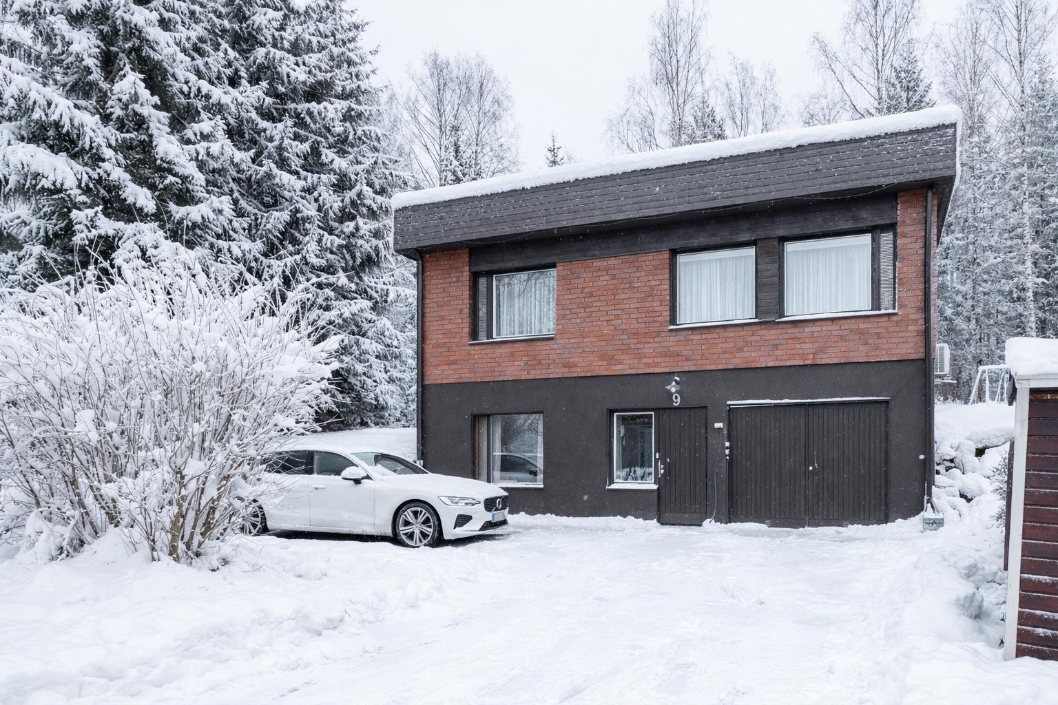 Tilaa on kahdessa kerroksessa sopivasti niin perhe-elämään kuin luovaan arkeen. Tiilirakenne takaa jykevyyden ja rauhan, ja isot ikkunat päästävät sisään juuri sopivasti valoa. Kellarista löytyy autotalli, jonne pääsee mukavasti sisätiloista.