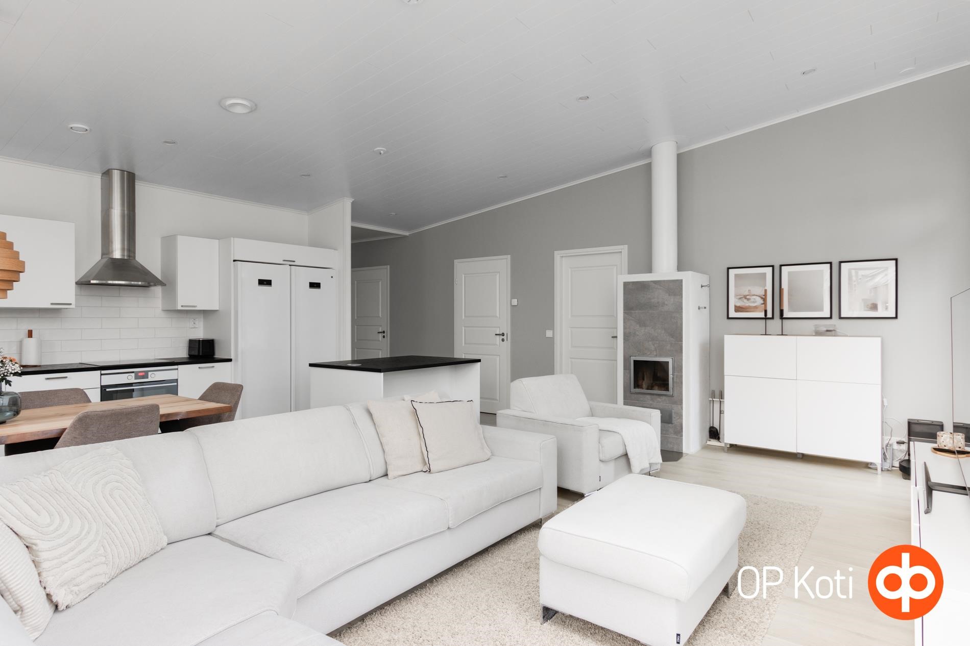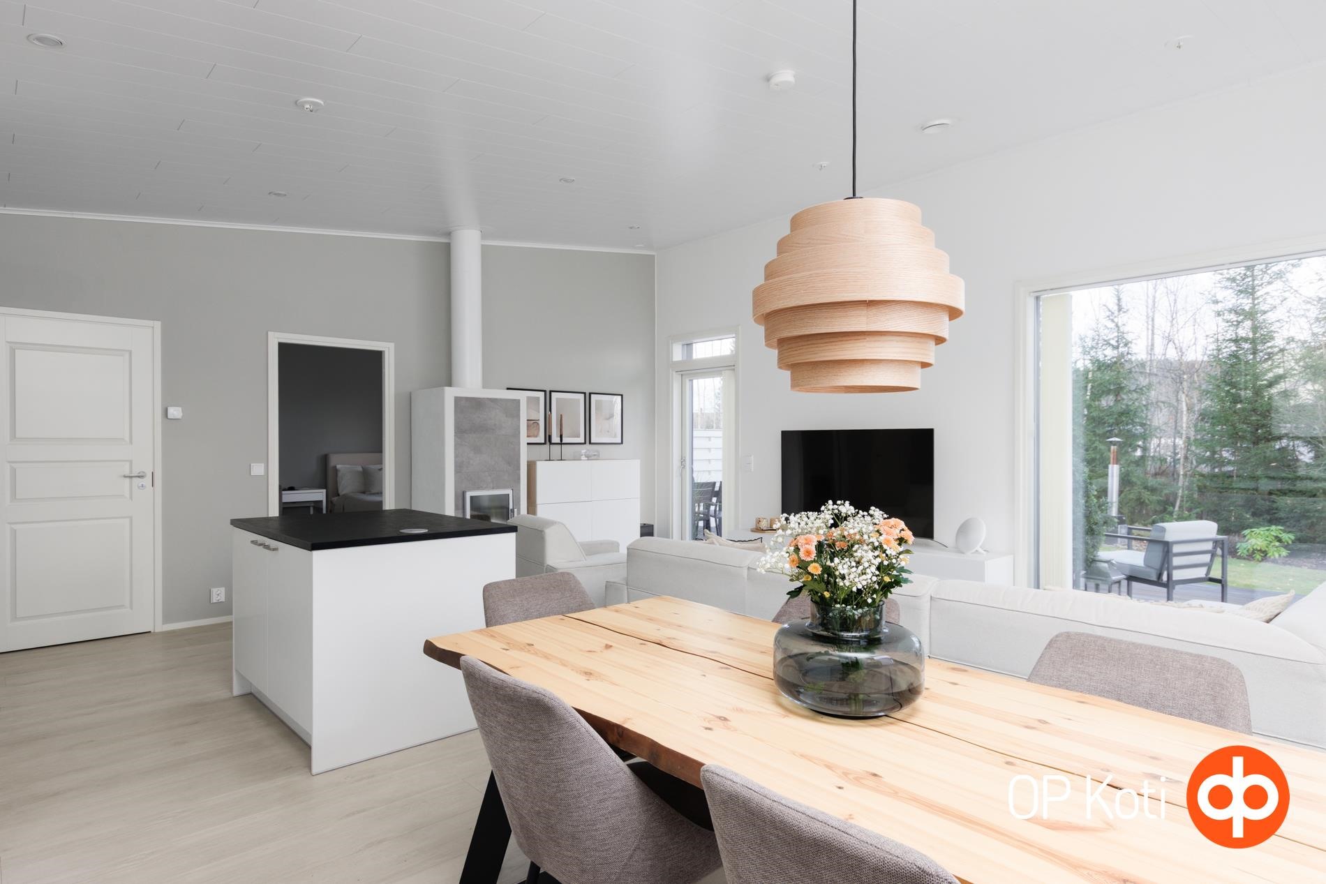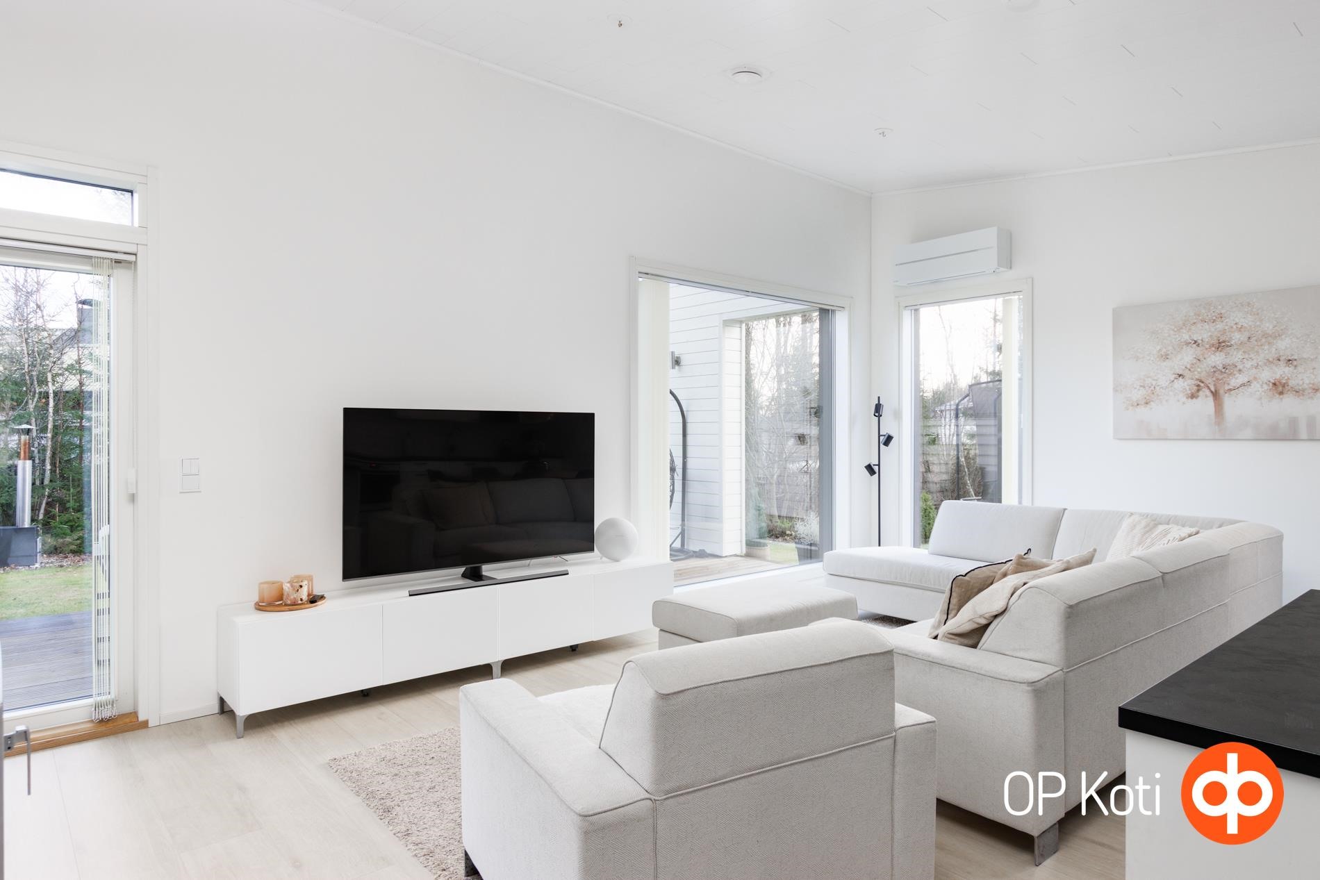 Valo tulvii sisään suurista ikkunoista ja olohuoneen korkea sisäkatto luo ihanan avaran tunnelman. Tyylikäs sisustus ja harmoniset sävyt tekevät kodista viimeistellyn ja viihtyisän.