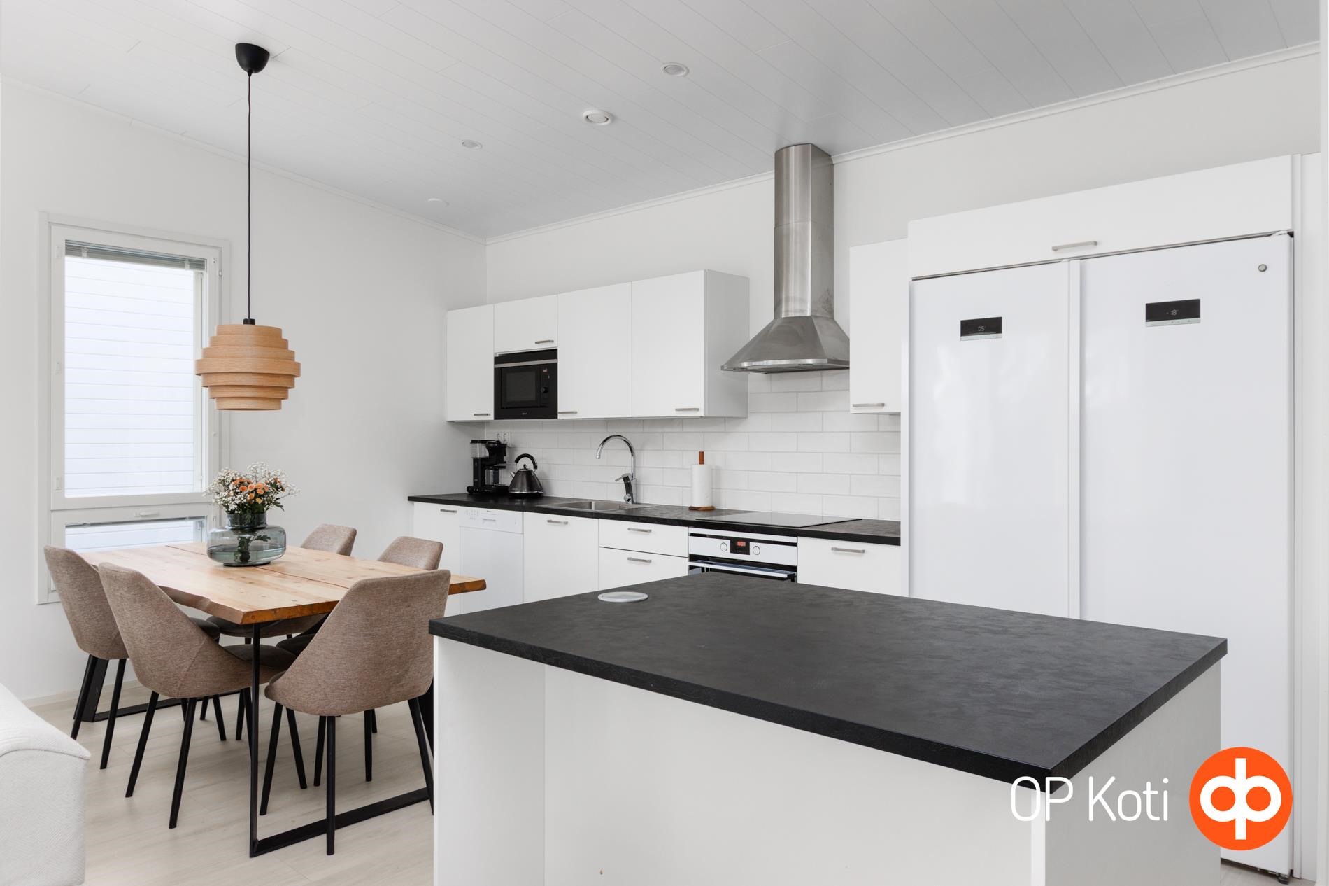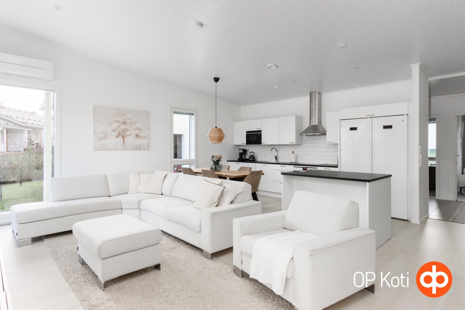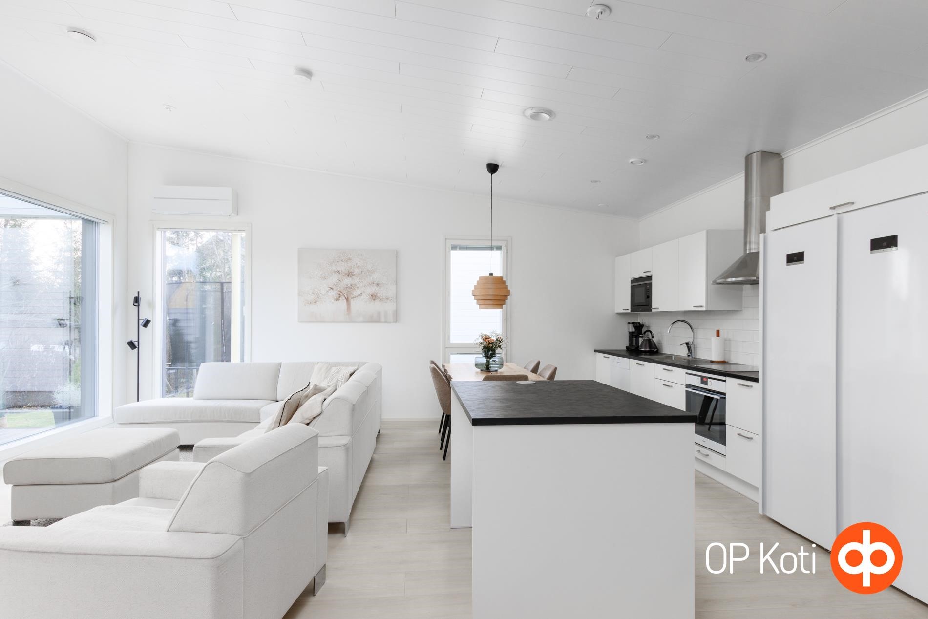 Valo tulvii sisään suurista ikkunoista ja olohuoneen korkea sisäkatto luo ihanan avaran tunnelman. Tyylikäs sisustus ja harmoniset sävyt tekevät kodista viimeistellyn ja viihtyisän.