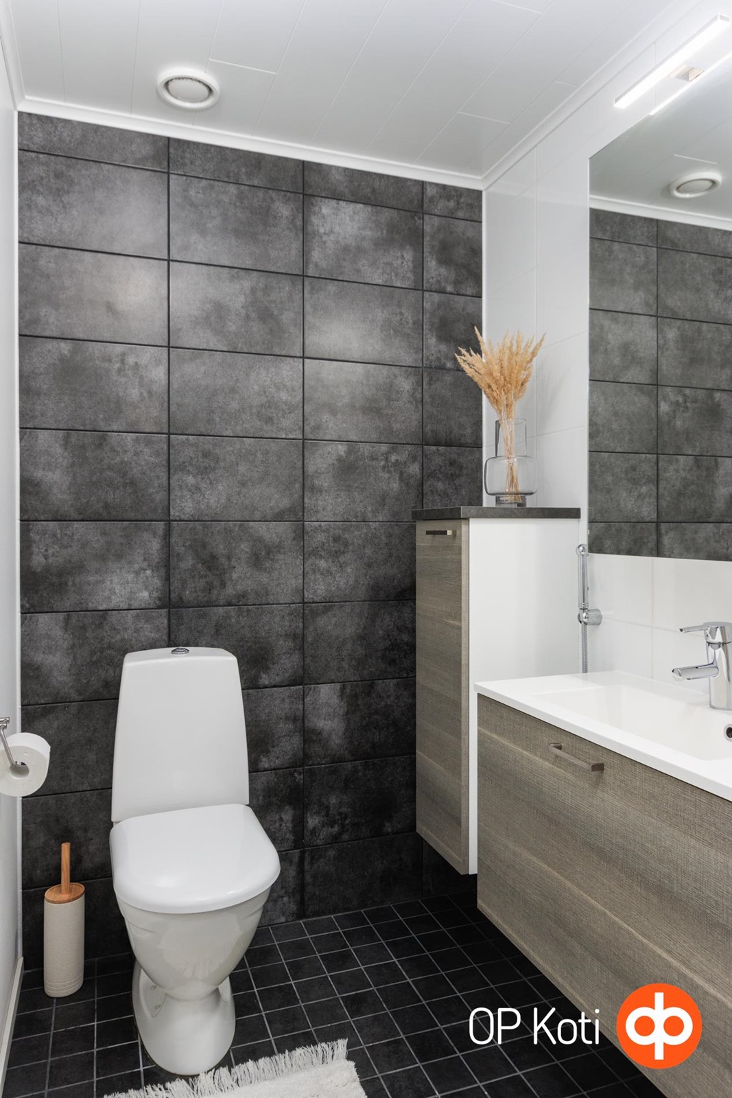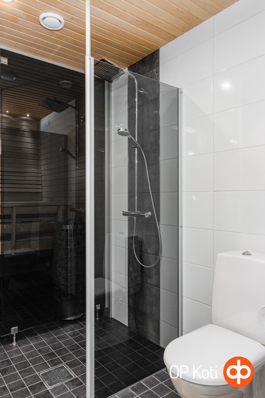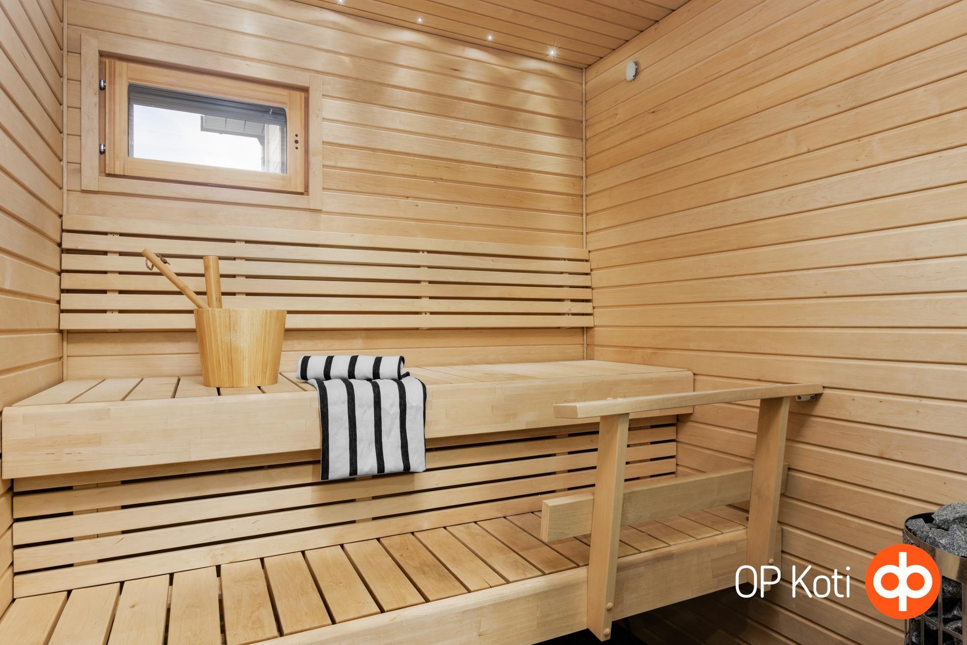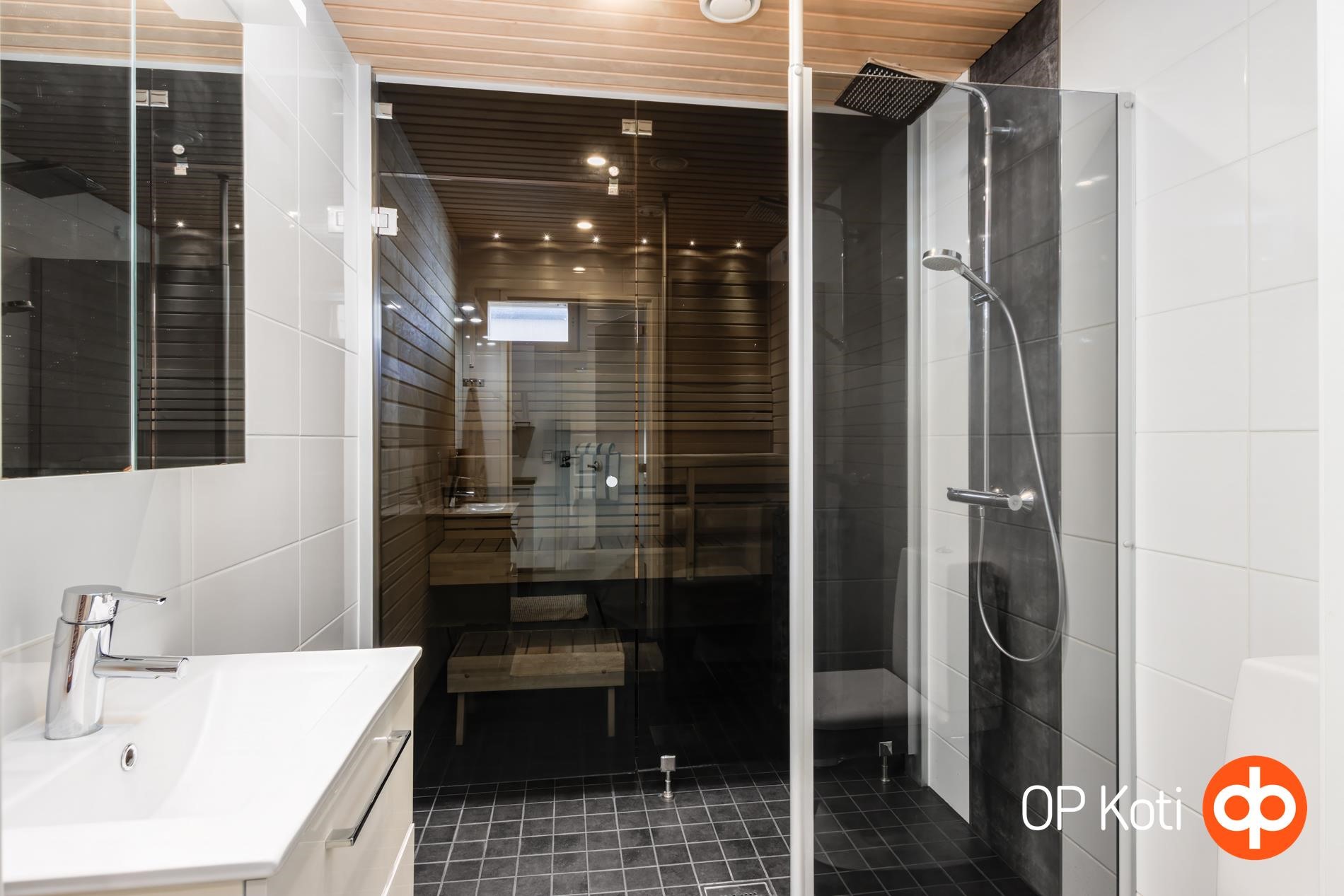 - Sauna, sähkökiuas, kylpyhuone, erillinen wc toinen kph:ssa, suihku, suihkuseinä, peilikaappi, kaapit, allaskaappi, pesukoneliitäntä, lattialämmitys, kiinteät valaisimet.