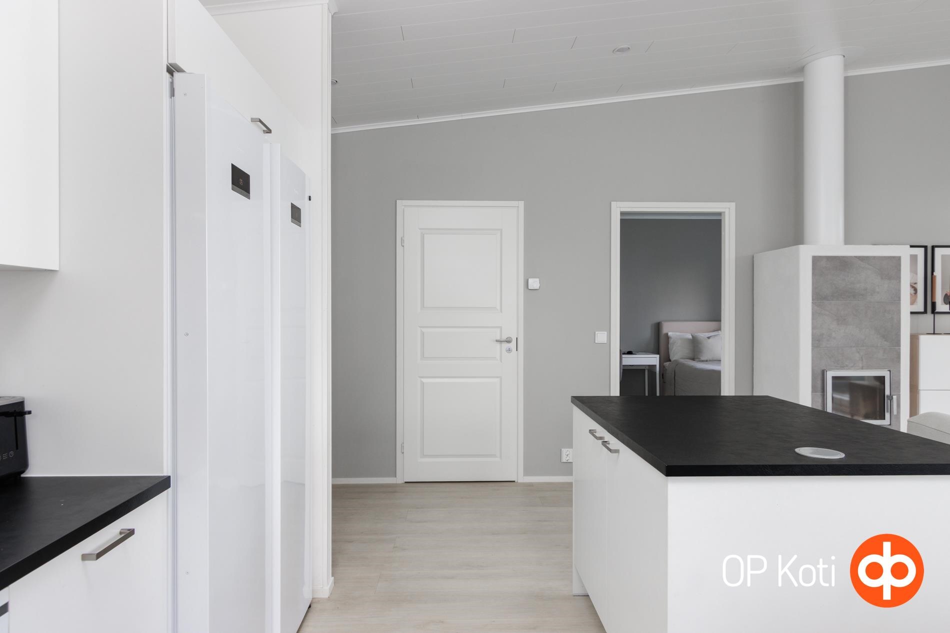 - Jääkaappi, pakastekaappi, erillisuuni integroitu, induktioliesi, liesituuletin, mikroaaltouuni integroitu, astianpesukone, kaapistot, kiinteät valaisimet, pöytätasojen materiaali laminaatti. Puustellin keittiö