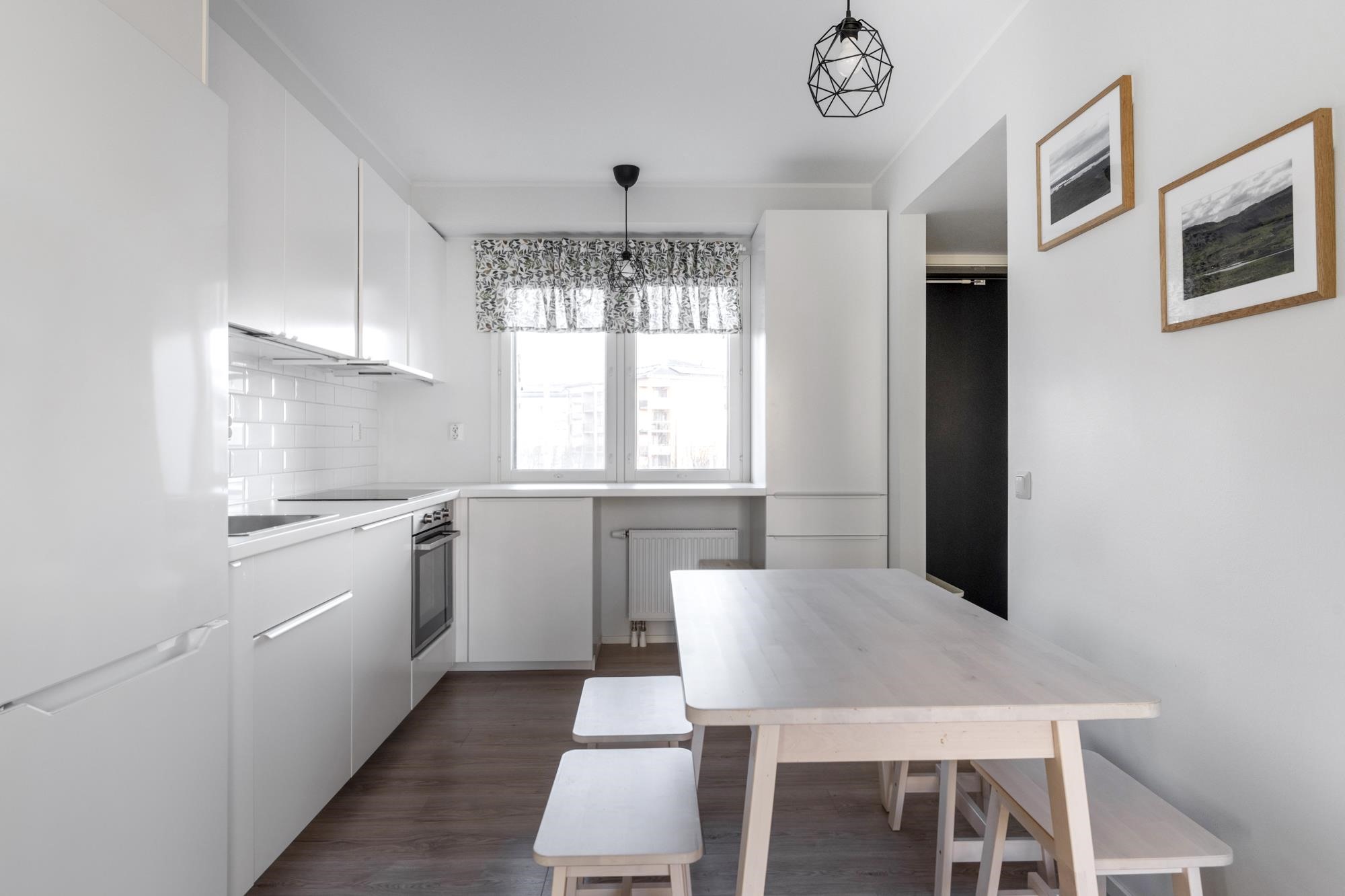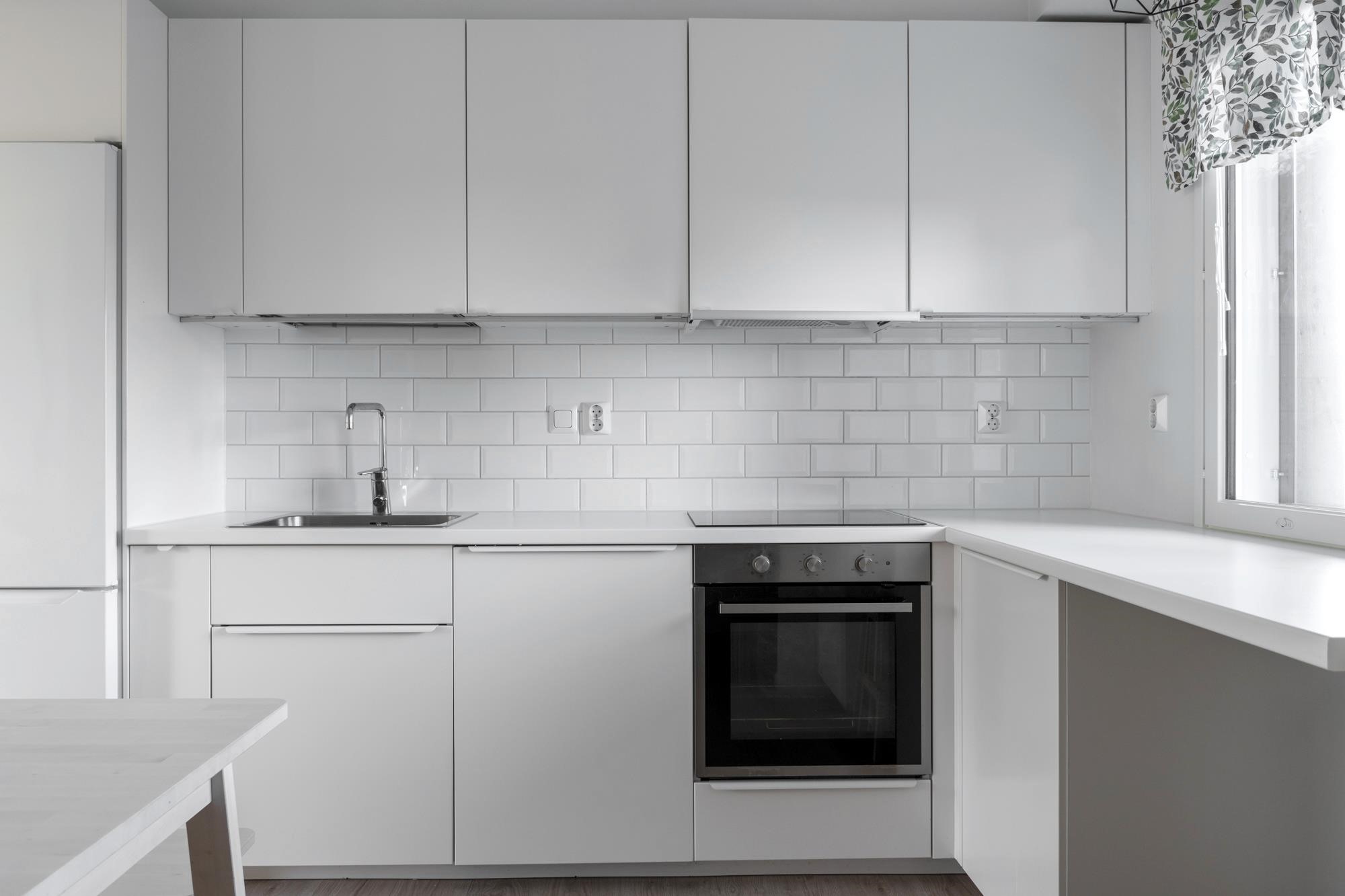 - Jääkaappipakastin, erillisuuni, induktioliesi, liesikupu, astianpesukone, kaapistot, kiinteät valaisimet.