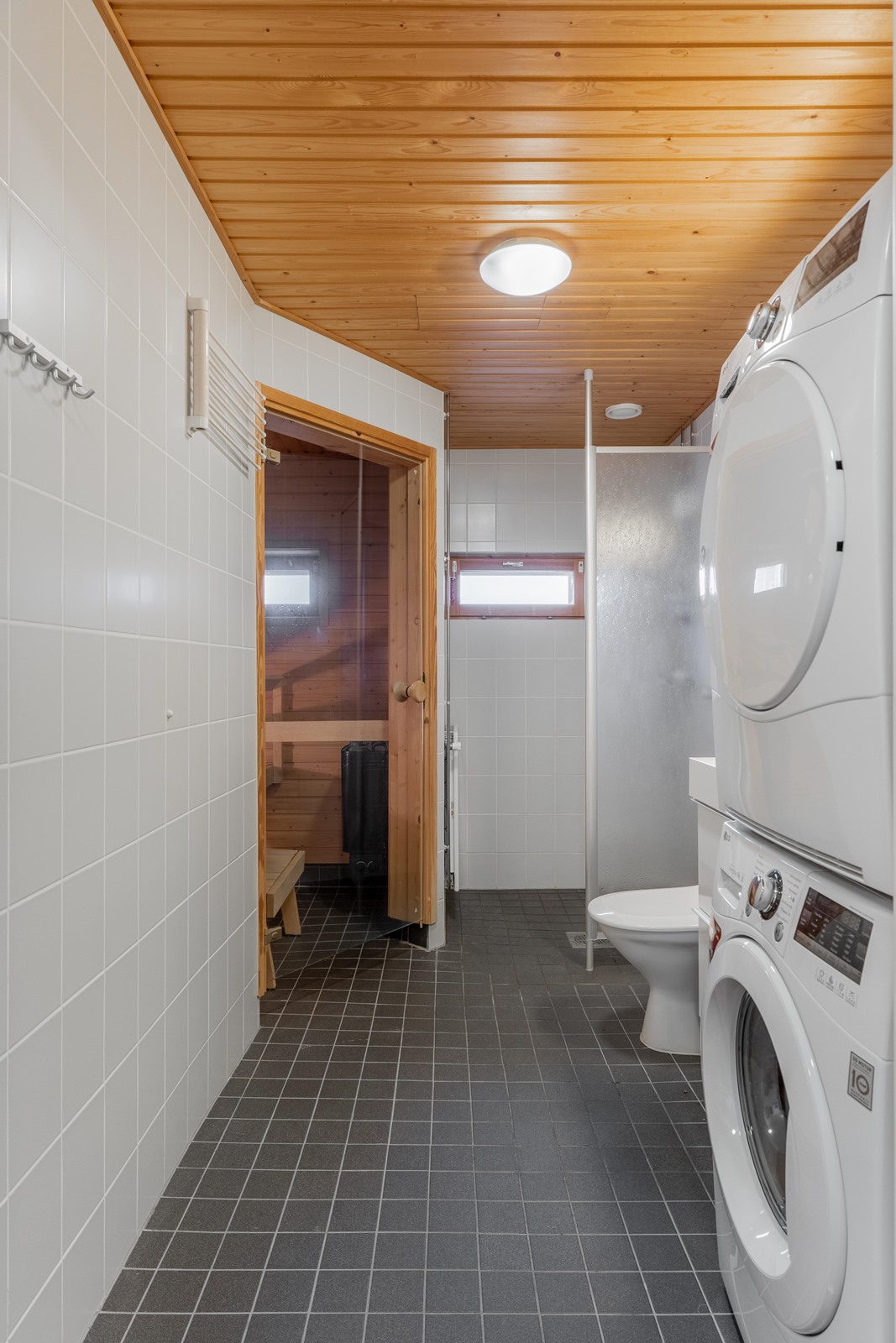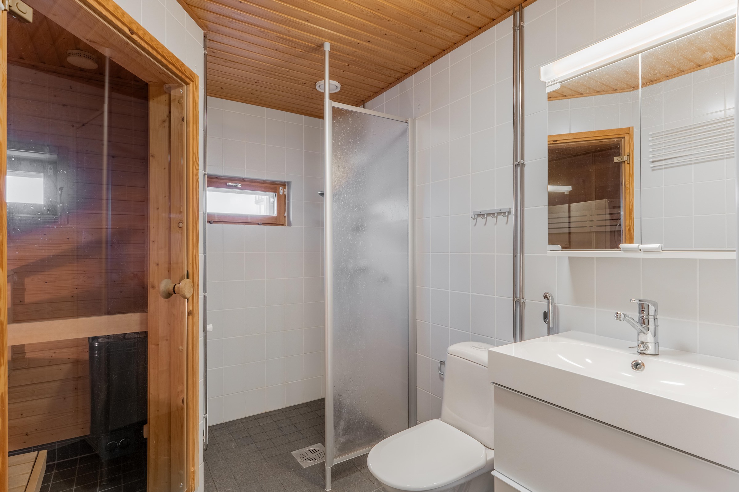 - Sauna lisäksi infapuna paneelit, sähkökiuas, kylpyhuone, erillinen wc, suihku, suihkuseinä, peilikaappi, kaapit, allaskaappi, pesukoneliitäntä, lattialämmitys, kiinteät valaisimet.