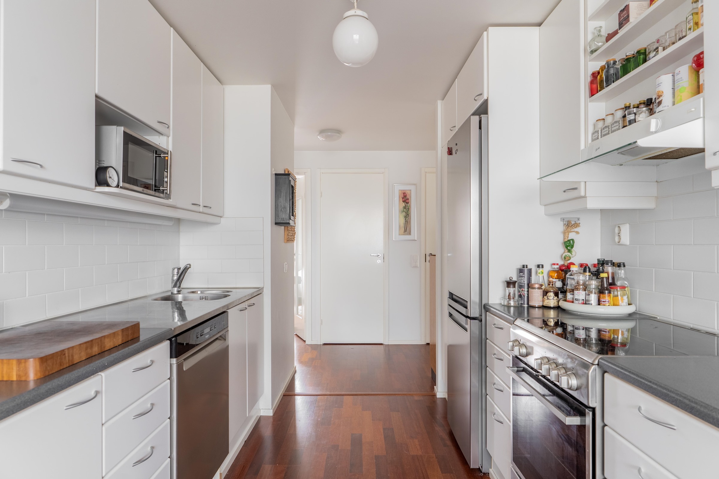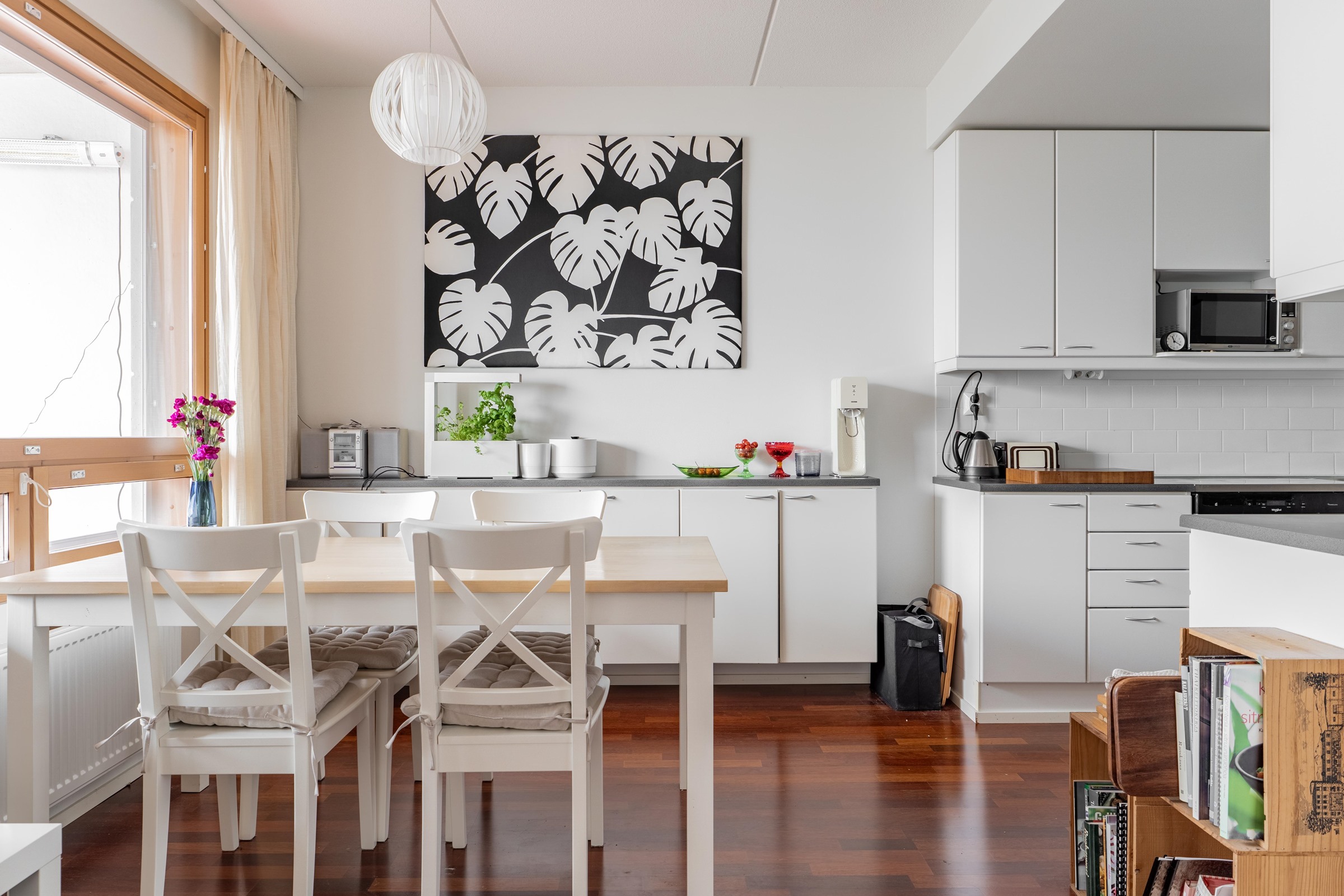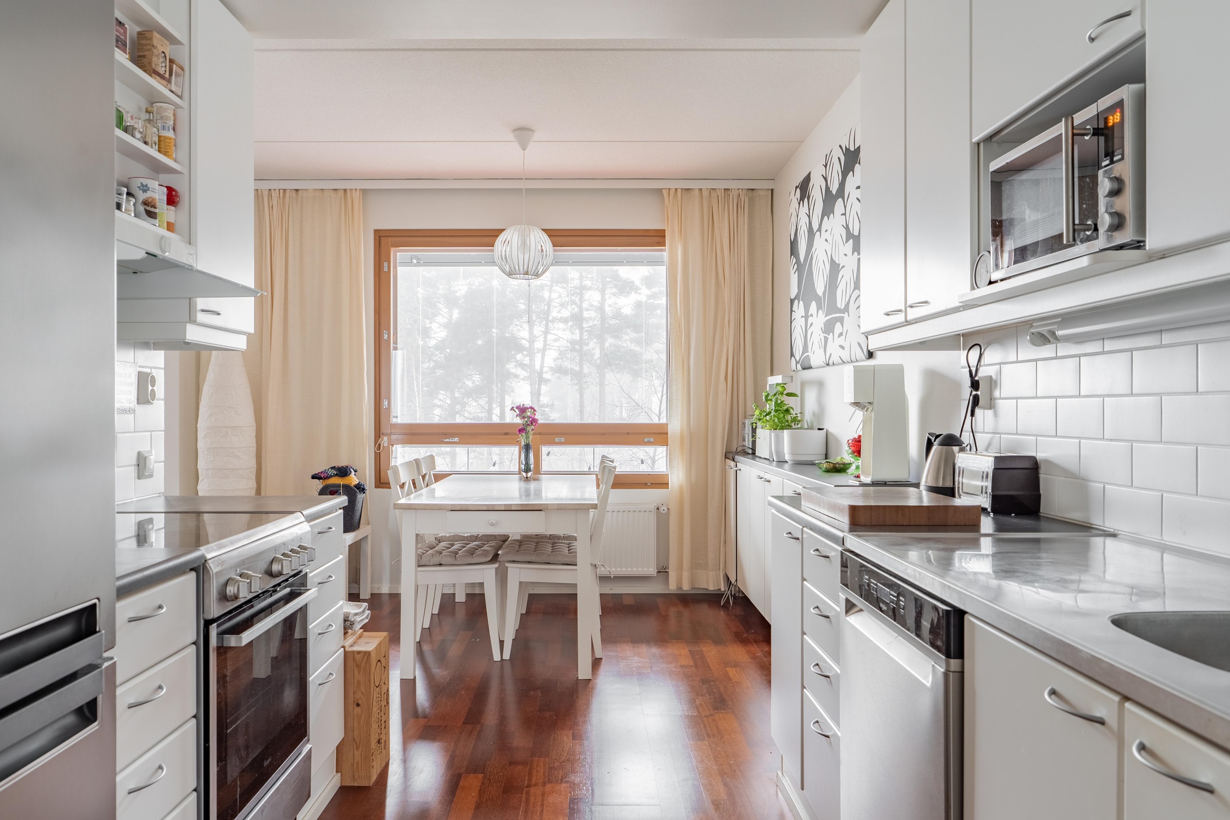 - Jääkaappipakastin, keraaminen liesi, liesituuletin, astianpesukone, kaapistot, kiinteät valaisimet.