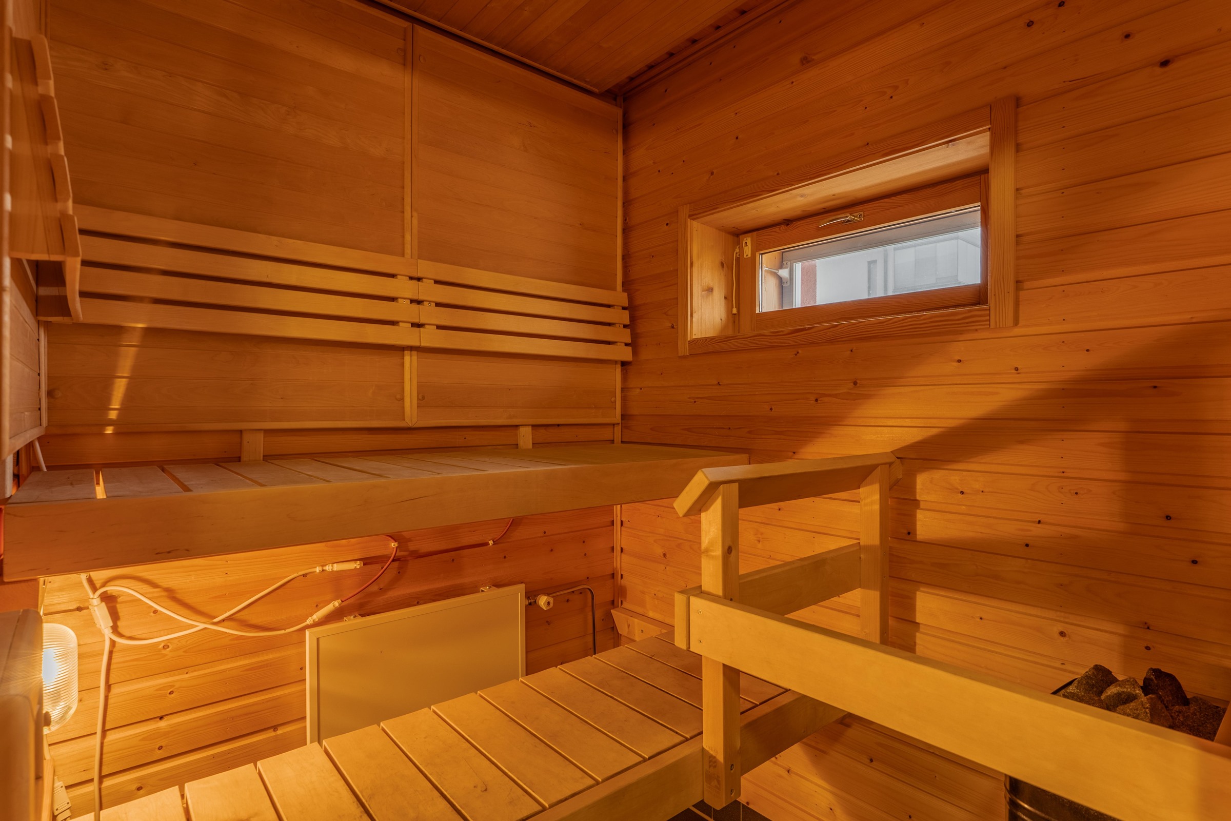 Asunnon mukavuuksiin kuuluu myös oma sauna, jossa on infrapunapaneelit, täydellinen paikka rentoutua ja palautua arjen kiireistä.