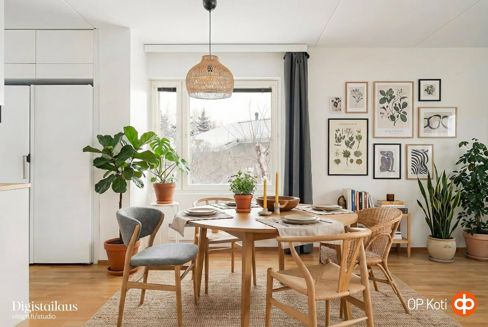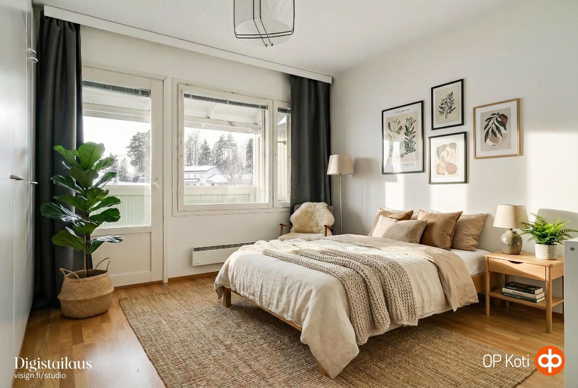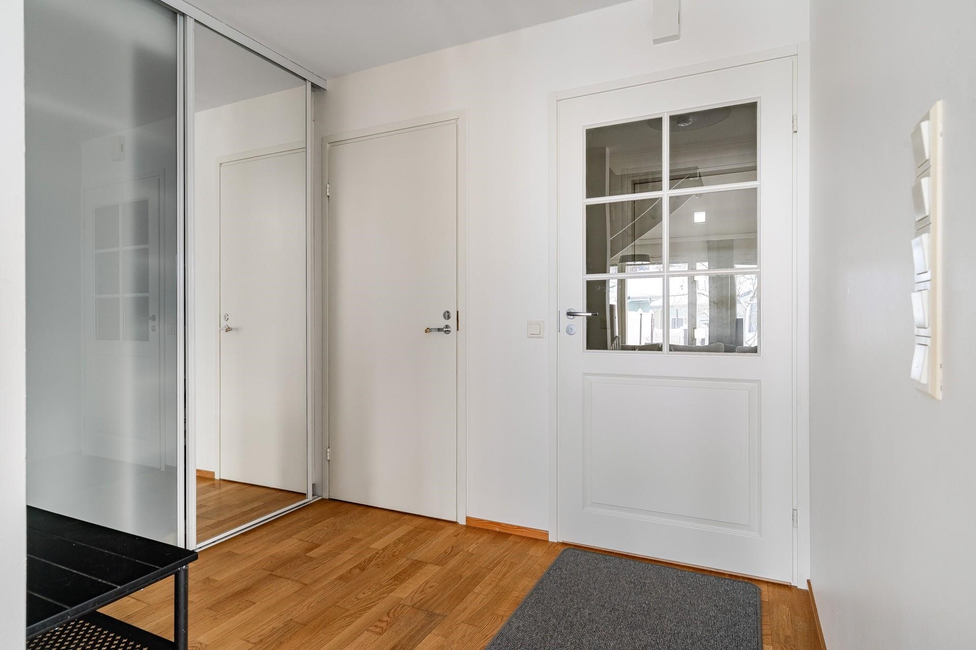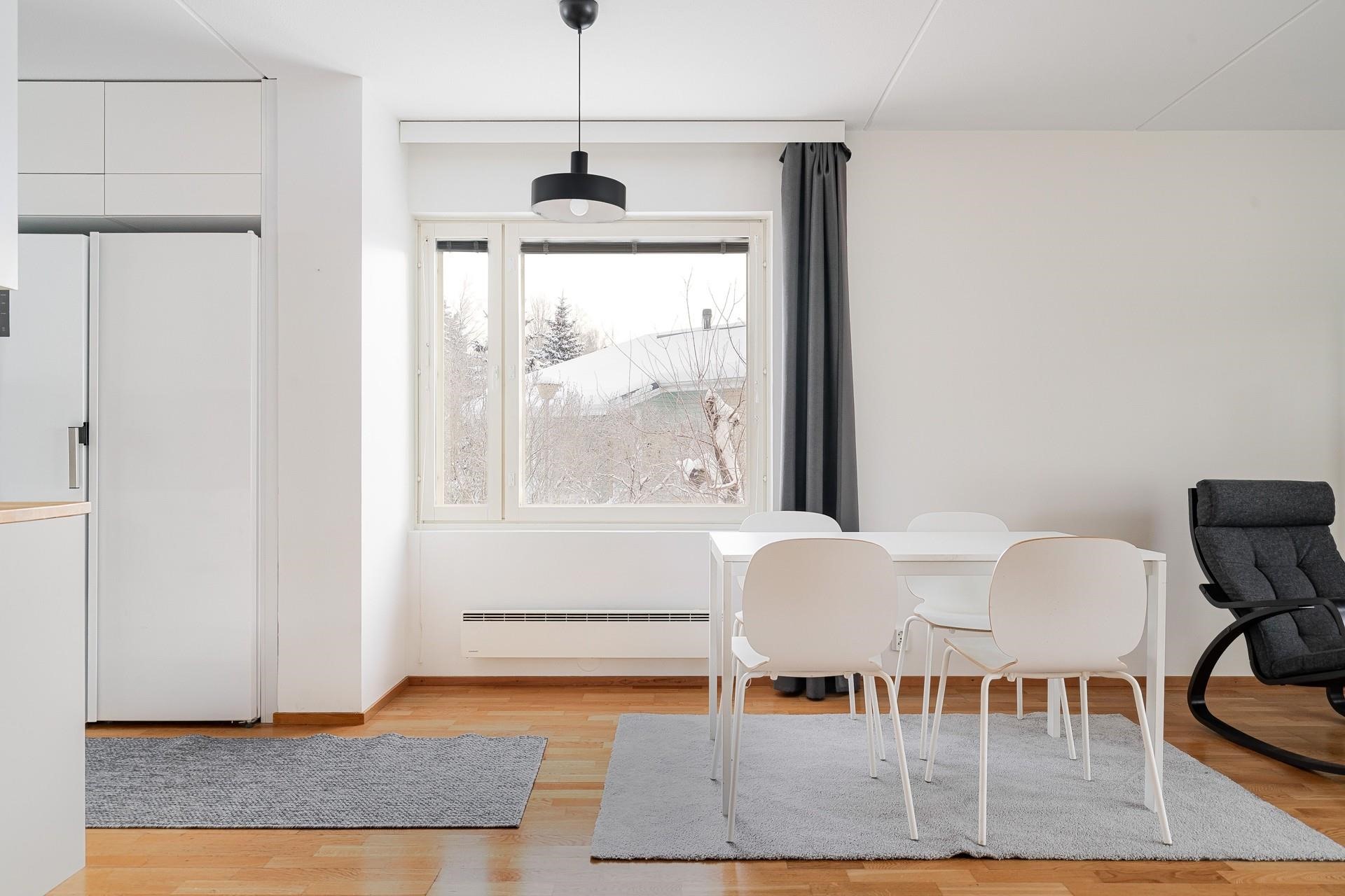 Asunnon vaalea ja ajaton ilme luo rauhallisen pohjan monenlaiseen sisustukseen. Tilavat huoneet, selkeä pohjaratkaisu ja luonnonvalo tekevät kokonaisuudesta avaran ja miellyttävän. Olohuoneesta on luonteva yhteys suojaisalle terassille ja omalle pihalle, jossa on helppo nauttia kesäpäivistä, aamukahveista tai rauhallisista illoista. Oma piha tuo arkeen kaivattua yksityisyyttä ja mahdollisuuden ulkoelämään aivan kotioven tuntumassa.