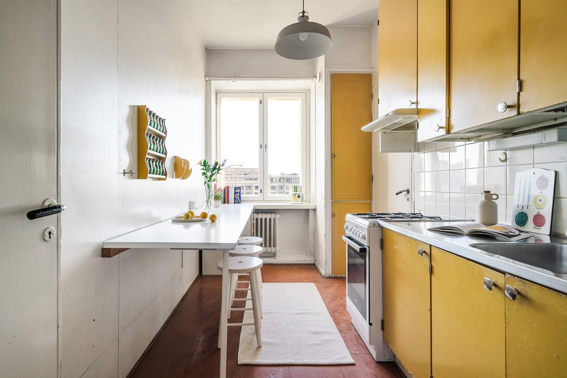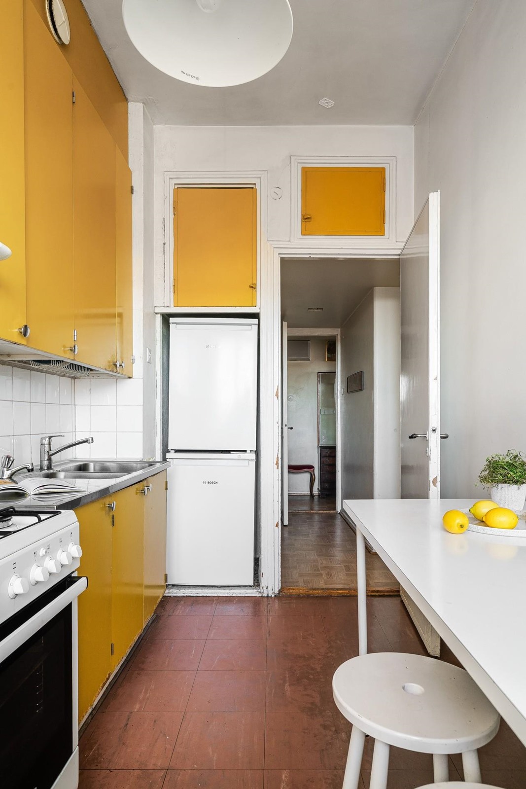 Asunto kaipaa pintojen päivitystä ja tarjoaa loistavan mahdollisuuden toteuttaa omia unelmia. Retrohenkisestä keittiöstä on kulku välivaraston kautta asunnon toiselle sisäänkäynnille, mistä pääsee taloyhtiön tuuletusparvekkeelle. Keittiötä voi halutessaan laajentaa purkamalla seinän viereiseen pieneen makuuhuoneeseen.