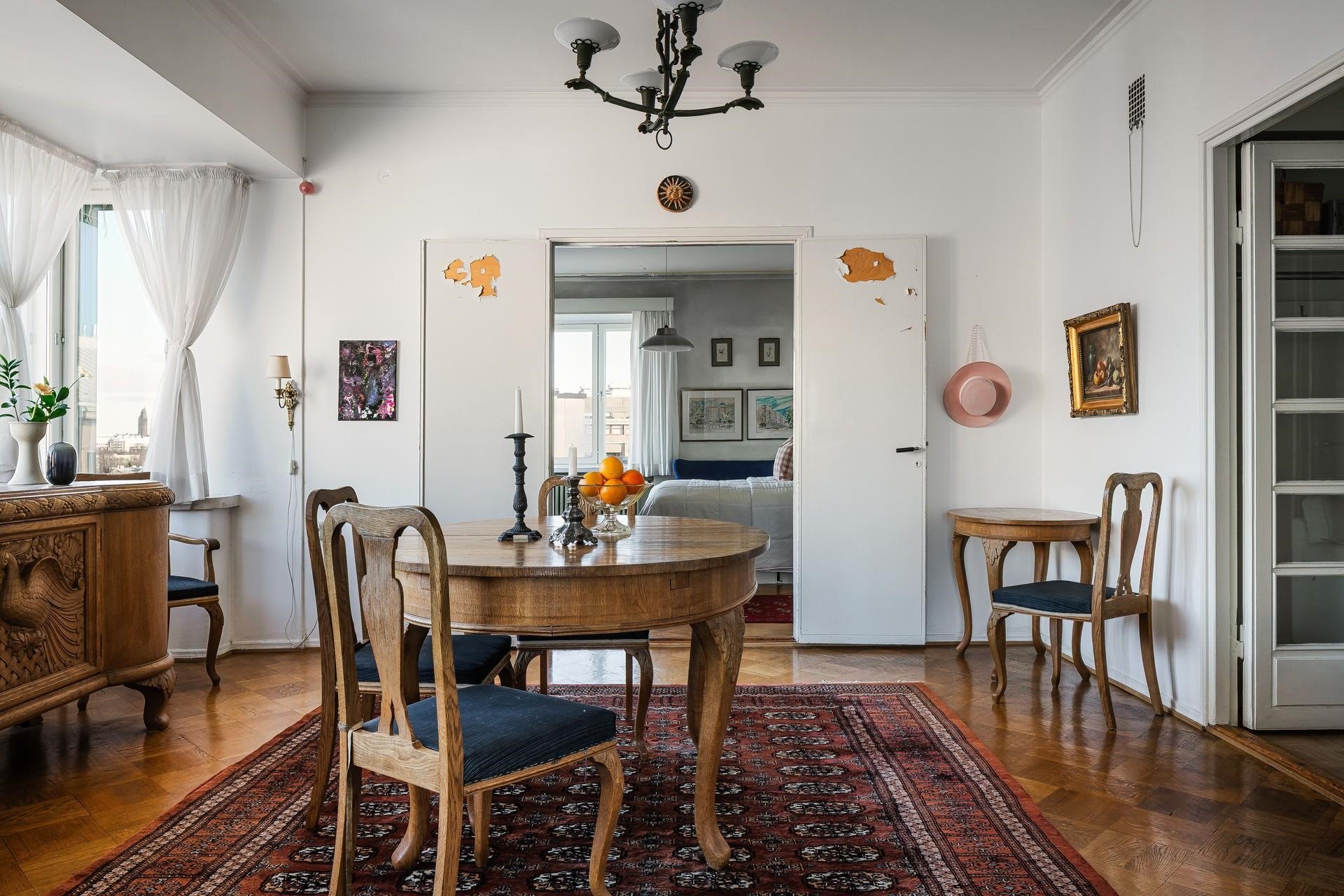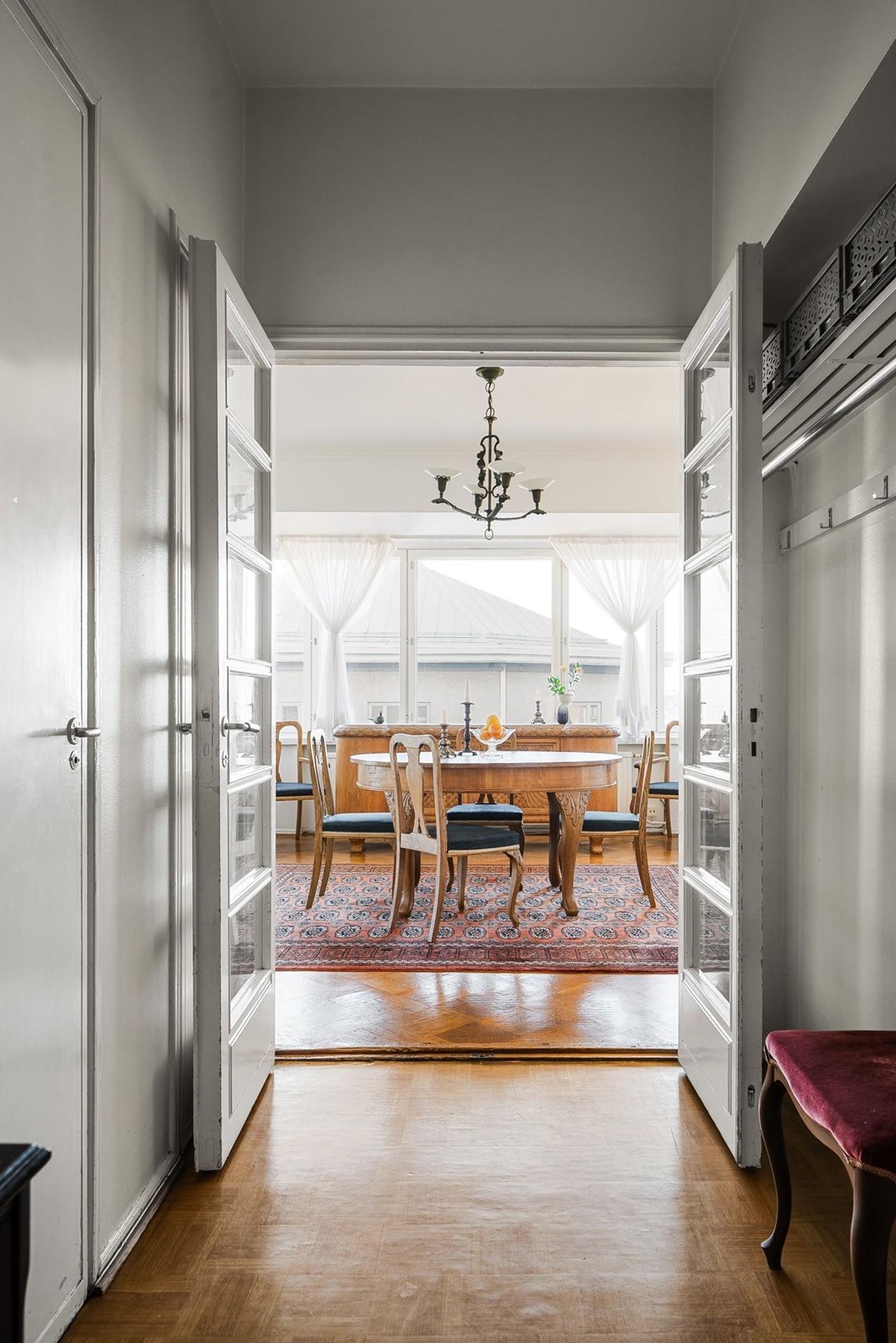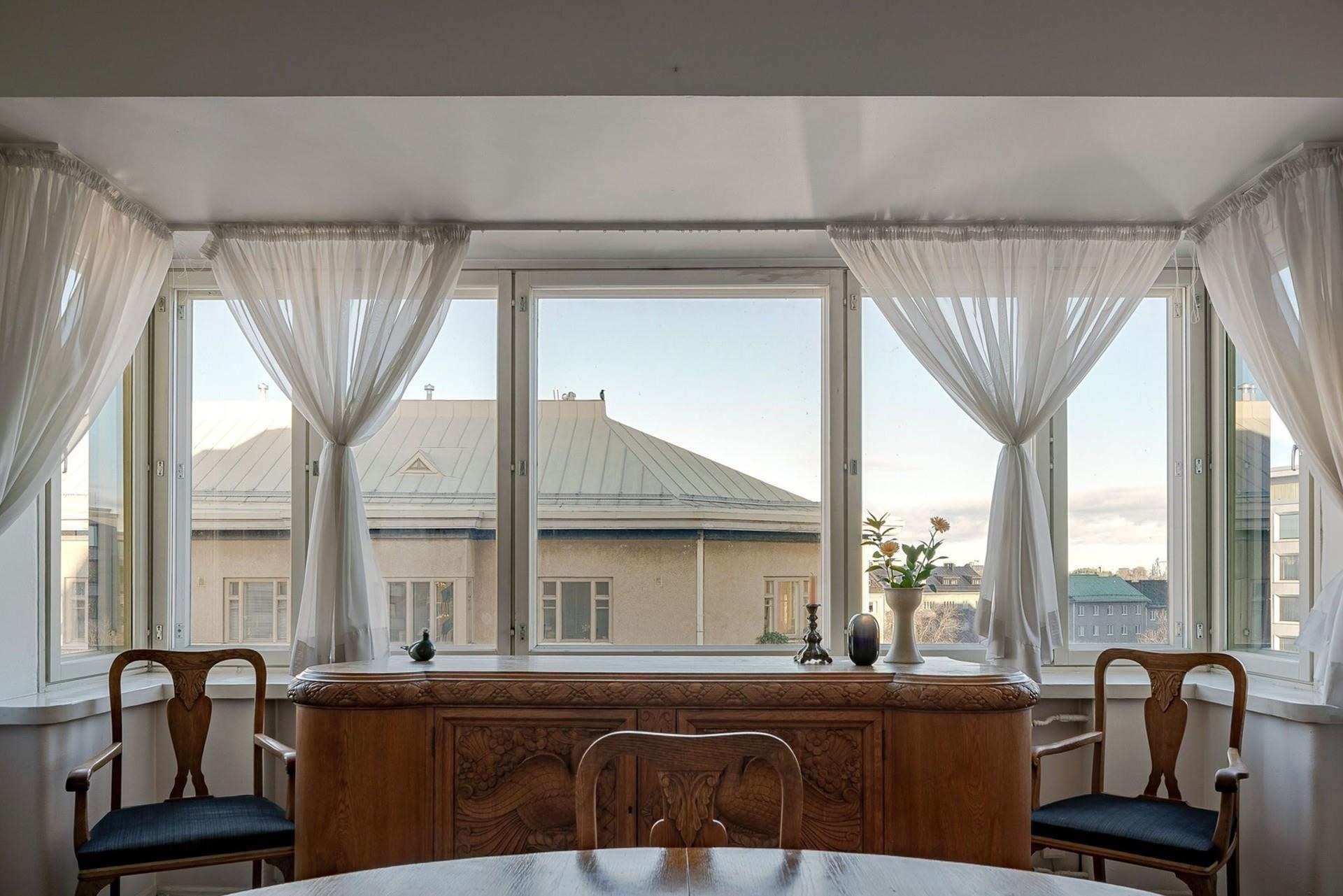 Astuessasi tähän kolmekymmentäluvun henkeä huokuvaan kotiin vastaasi tulvii luonnon valoa asunnon kolmeen ilmansuuntaan avautuvista ikkunoista. Tässä kodissa saat nauttia aamuauringon säteistä ja ilta-auringon lempeän valon hehkusta. Suurista ikkunoista avautuu kiehtovat näkymät eri puolille kaupunkia. Ilta-auringon puolella oleva romanttinen avoparveke sekä ikkunat tarjoavat esteettömät näkymät yli Töölöntorin. Kaupungin syke on lähellä, mutta korkeuksissa nautitaan omasta rauhasta.