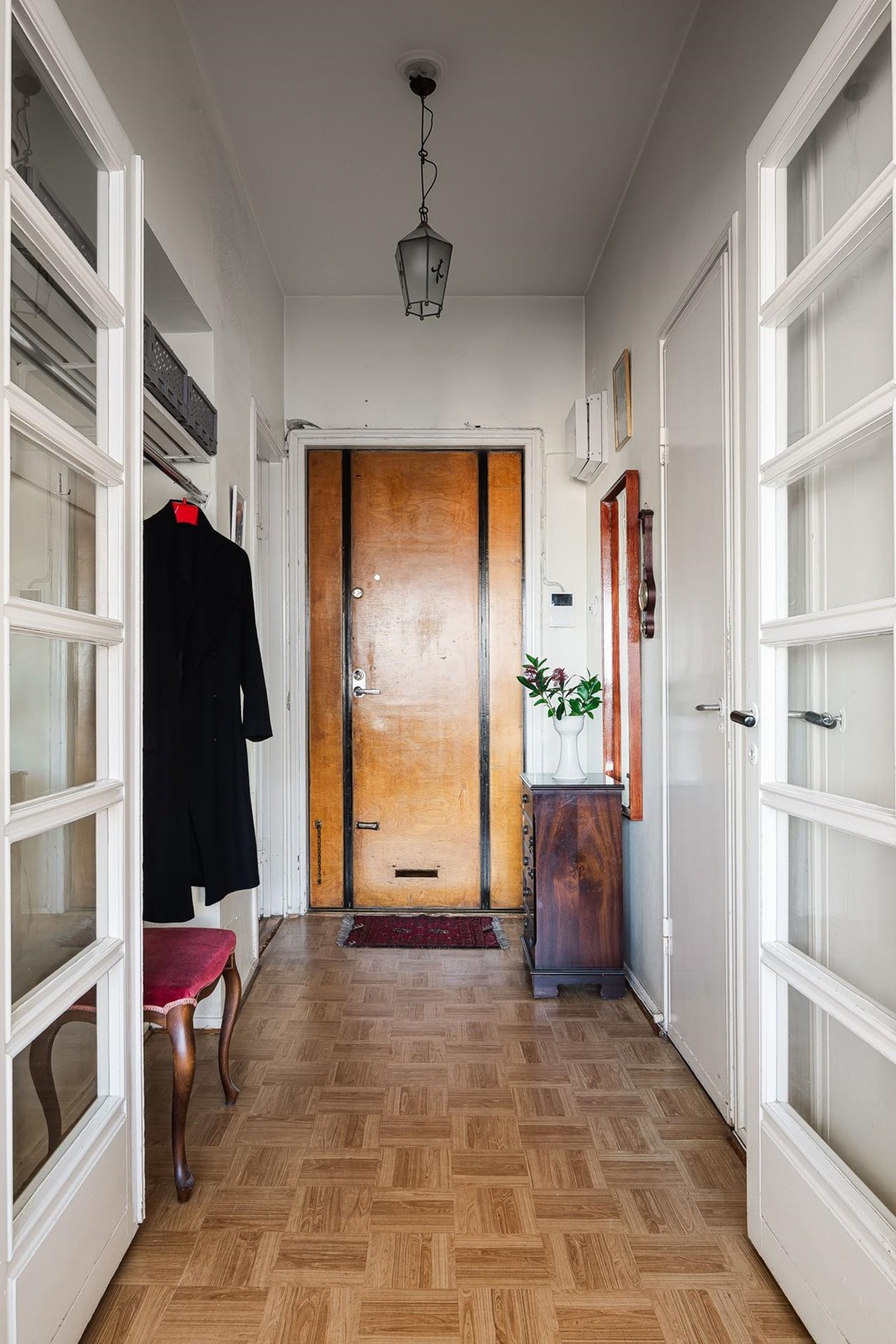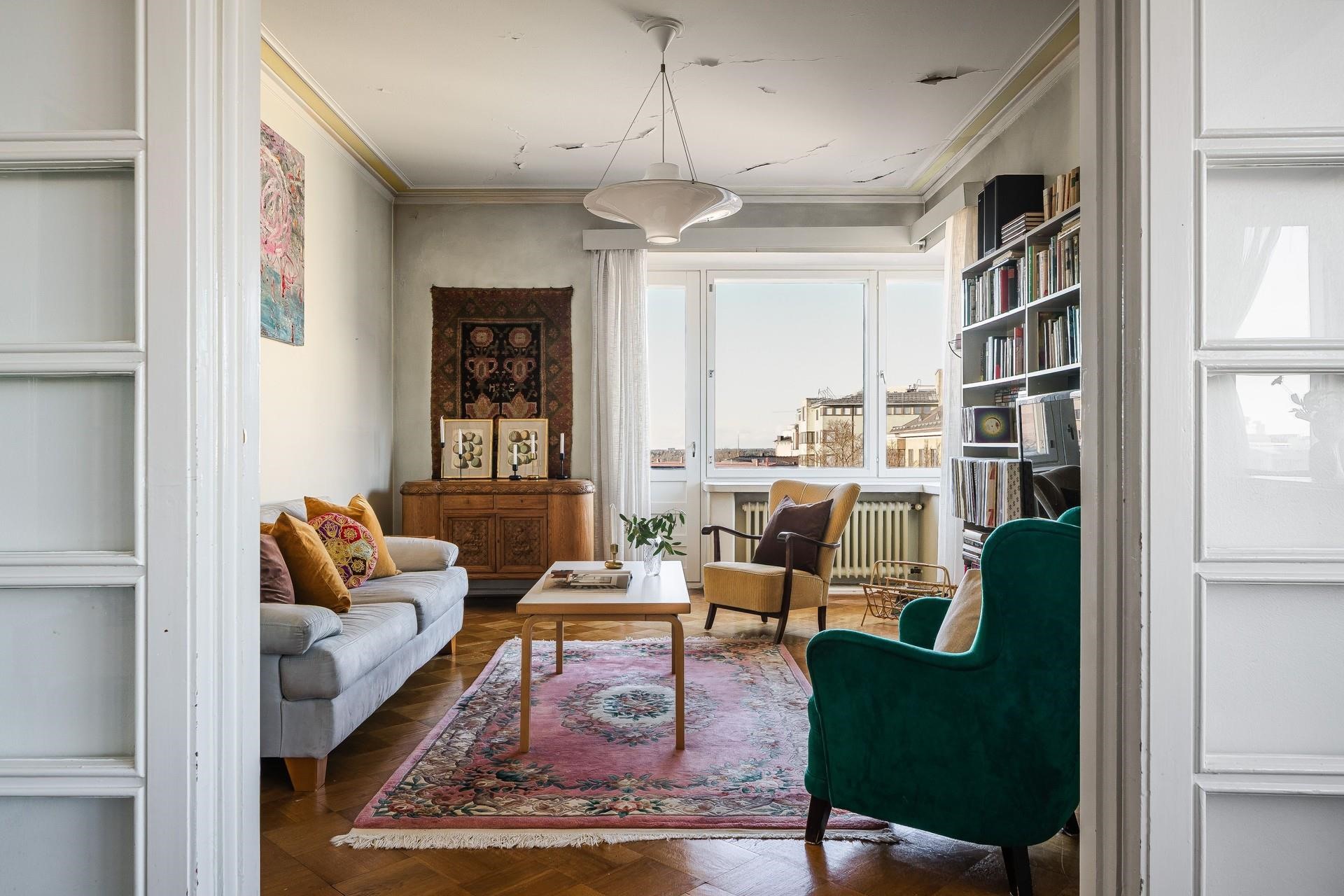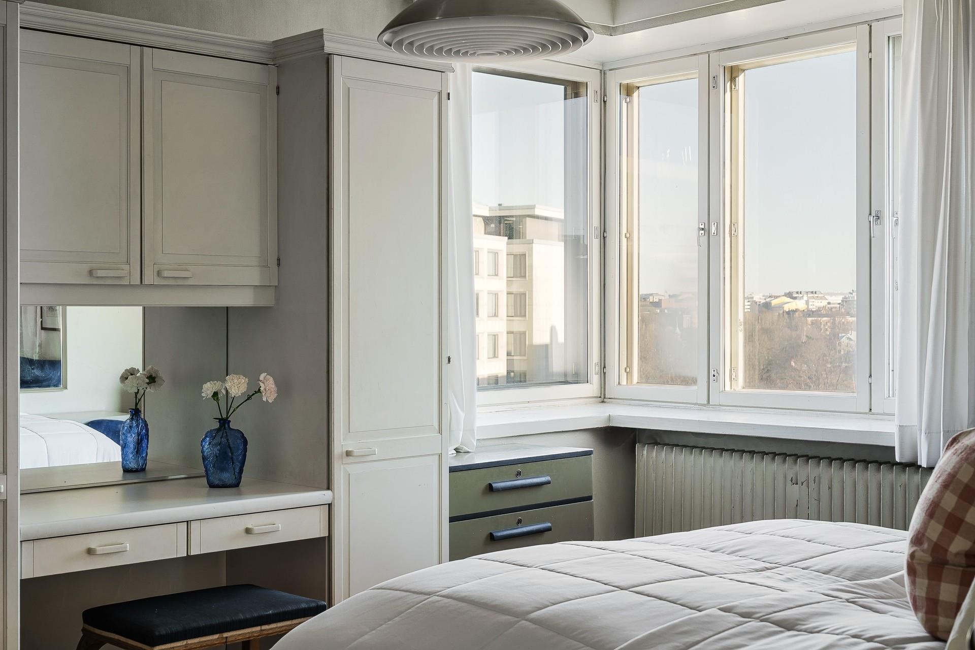 Astuessasi tähän kolmekymmentäluvun henkeä huokuvaan kotiin vastaasi tulvii luonnon valoa asunnon kolmeen ilmansuuntaan avautuvista ikkunoista. Tässä kodissa saat nauttia aamuauringon säteistä ja ilta-auringon lempeän valon hehkusta. Suurista ikkunoista avautuu kiehtovat näkymät eri puolille kaupunkia. Ilta-auringon puolella oleva romanttinen avoparveke sekä ikkunat tarjoavat esteettömät näkymät yli Töölöntorin. Kaupungin syke on lähellä, mutta korkeuksissa nautitaan omasta rauhasta.