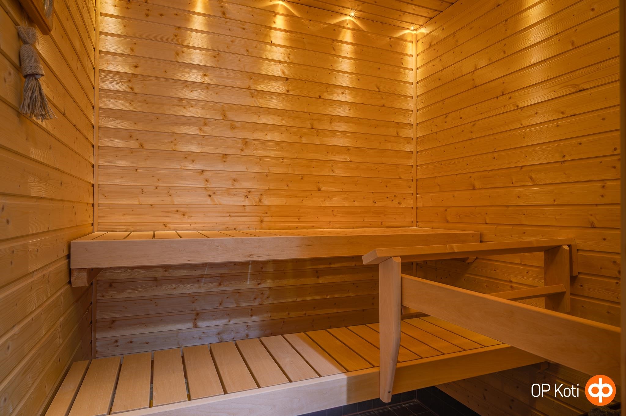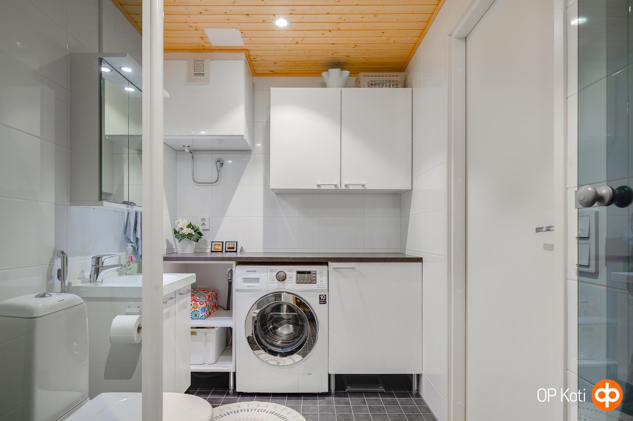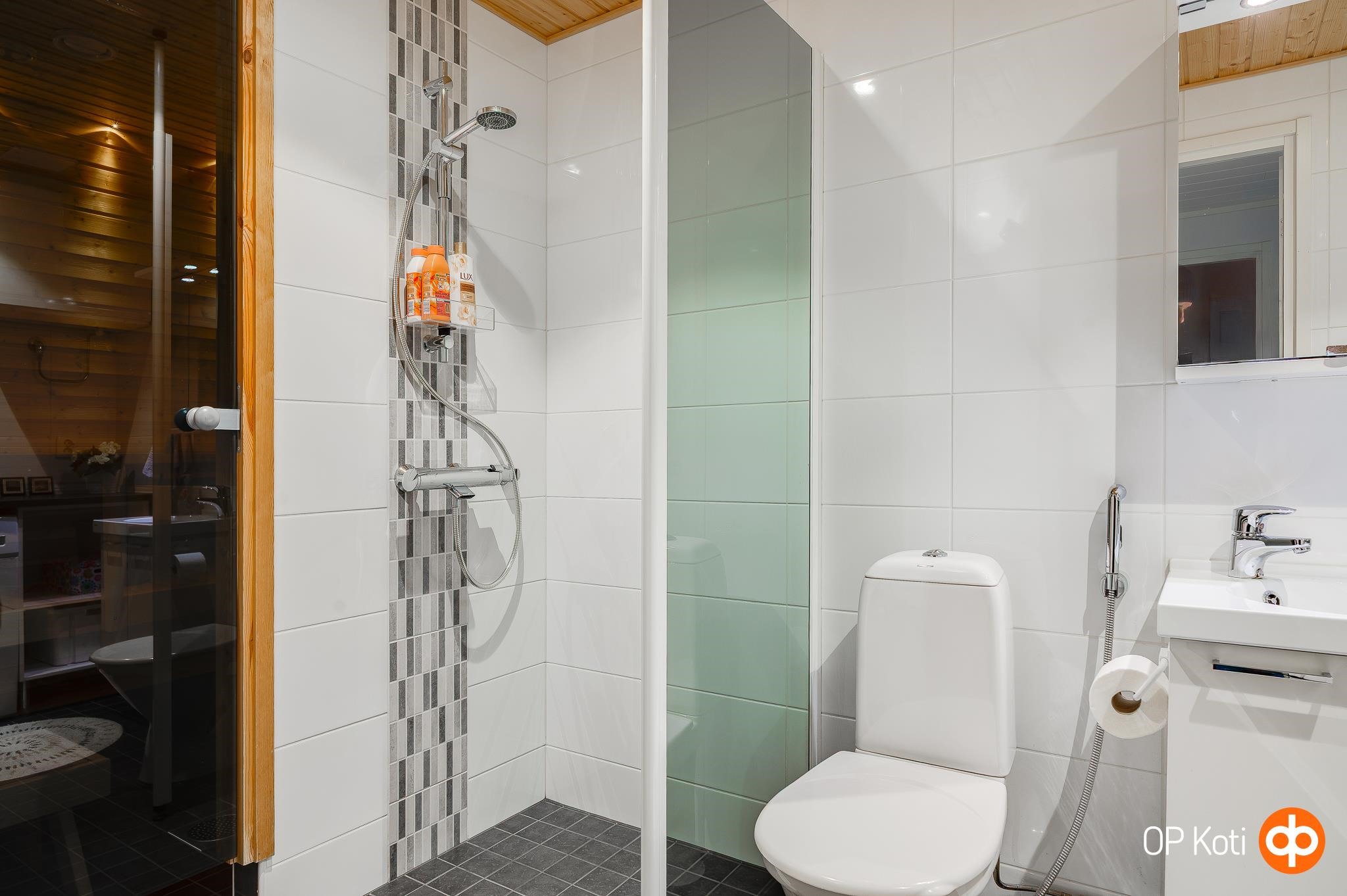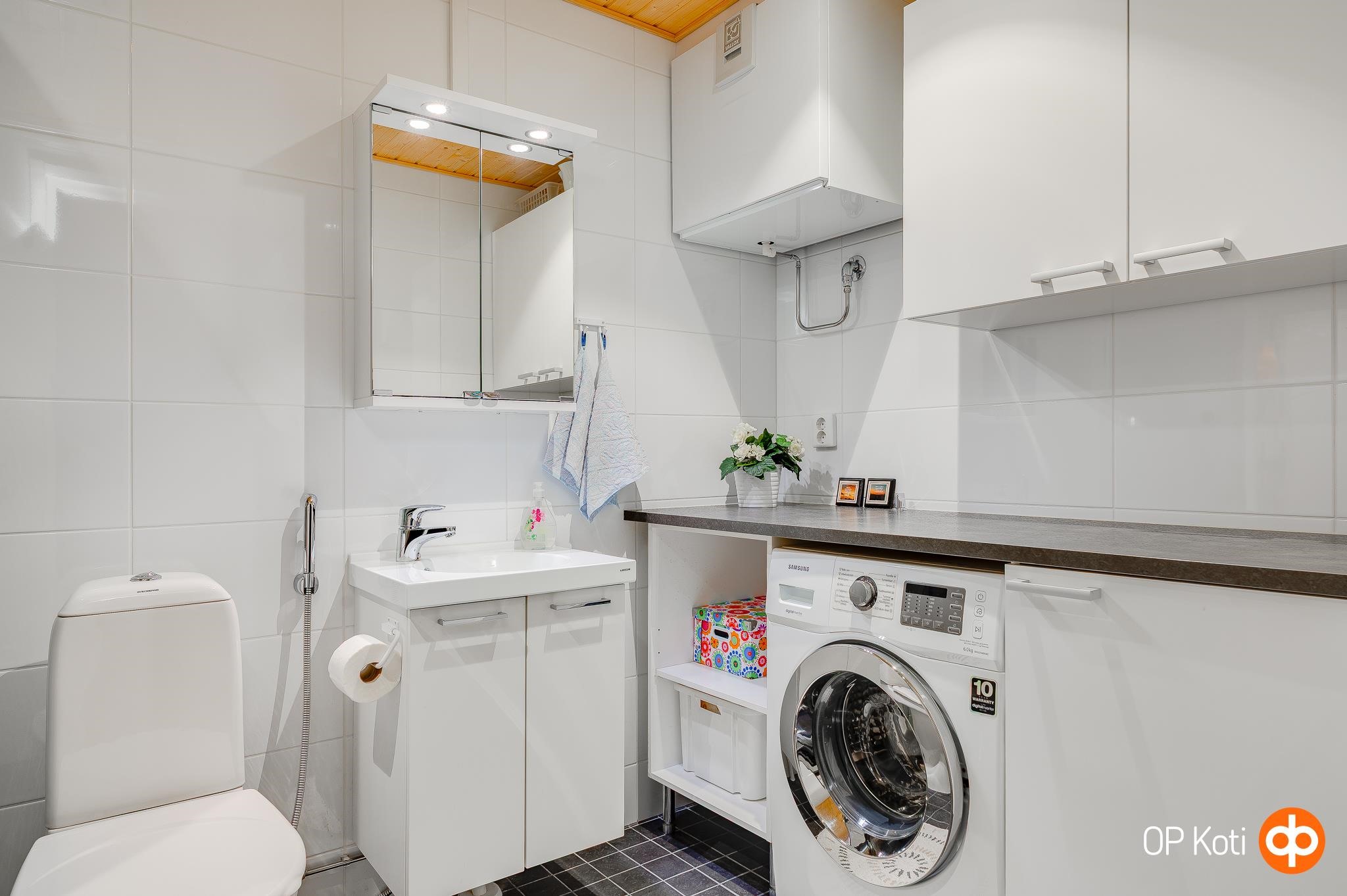 - Sauna, sähkökiuas, kylpyhuone, suihku, suihkuseinä, peilikaappi, kaapit, allaskaappi, pesukoneliitäntä, lattialämmitys, kiinteät valaisimet.