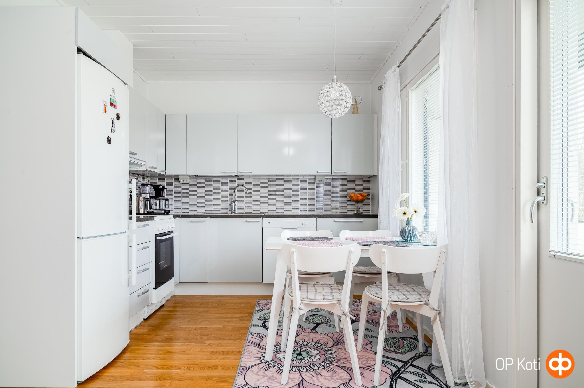 - Jääkaappipakastin, lattialiesi, keraaminen liesi, liesituuletin, mikroaaltouuni, astianpesukone, kaapistot, kiinteät valaisimet.