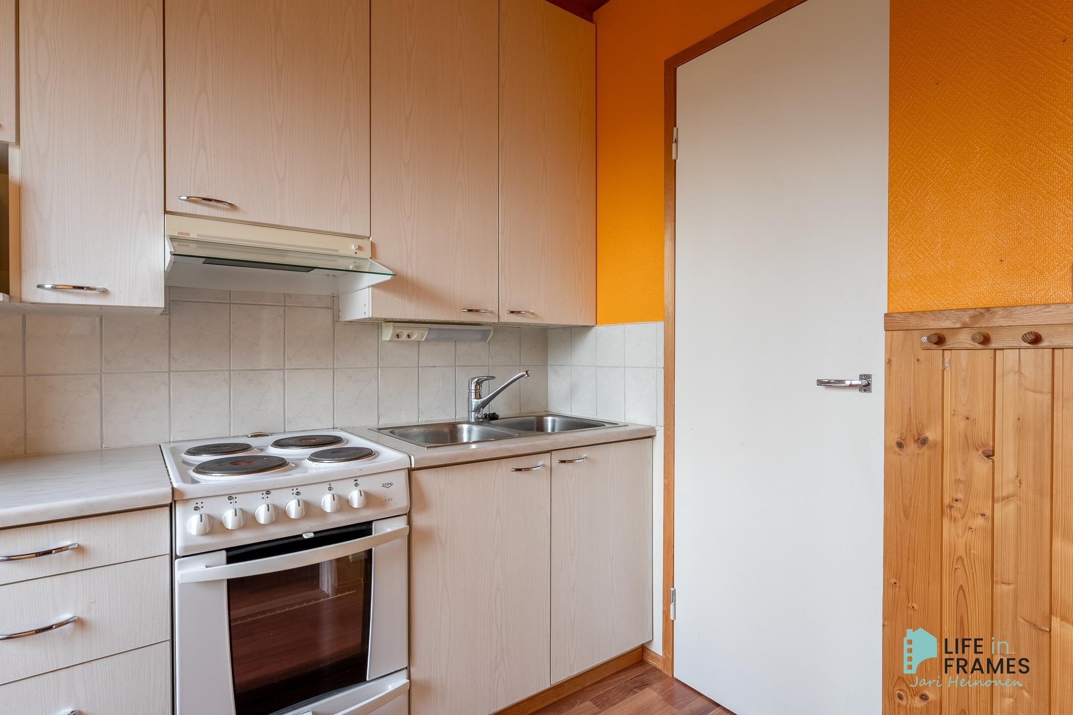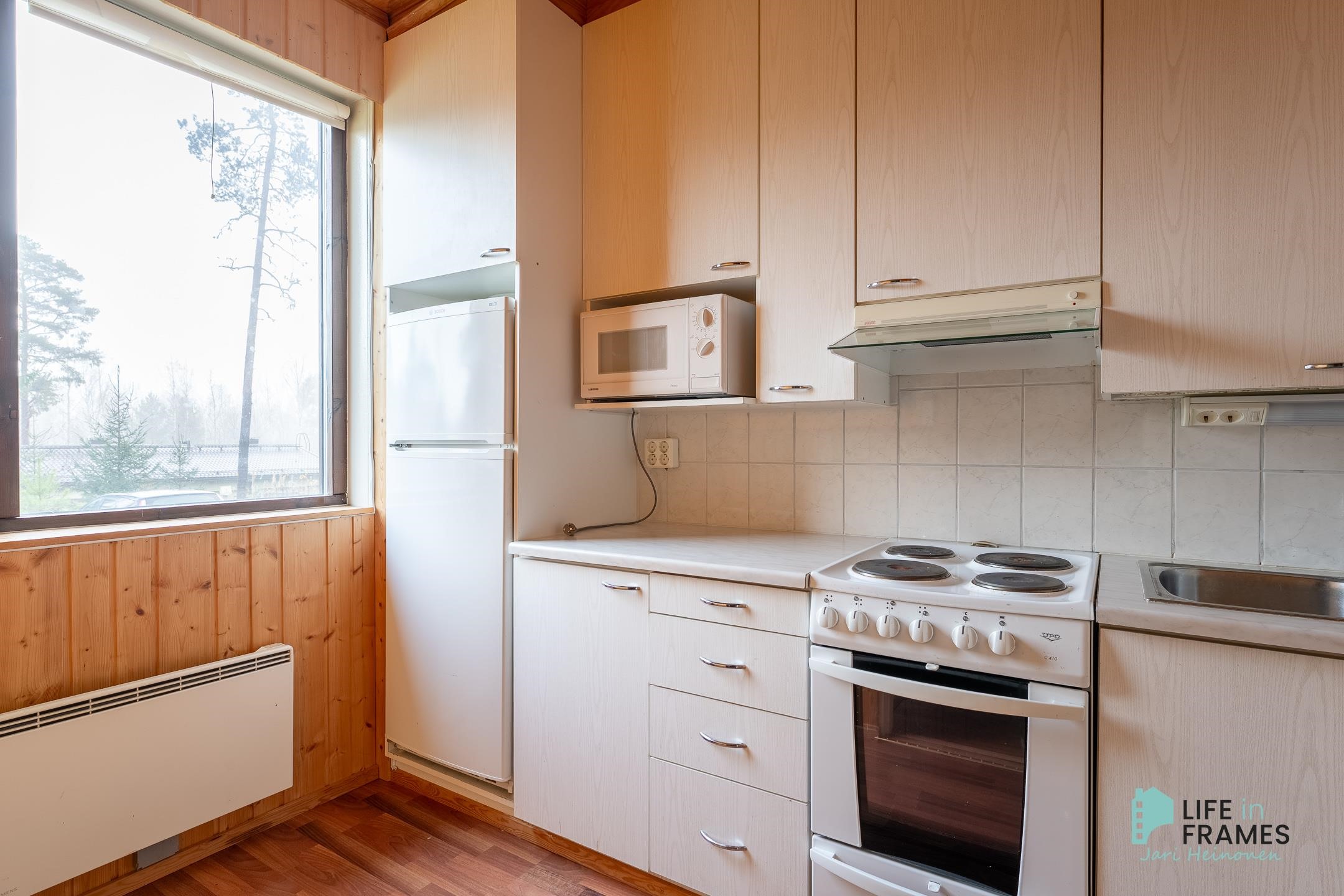- Jääkaappipakastin, lattialiesi, sähköliesi, liesikupu, kaapistot, kiinteät valaisimet.