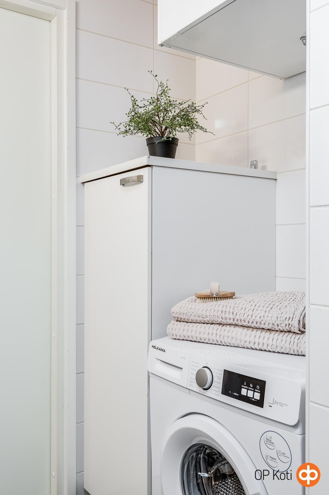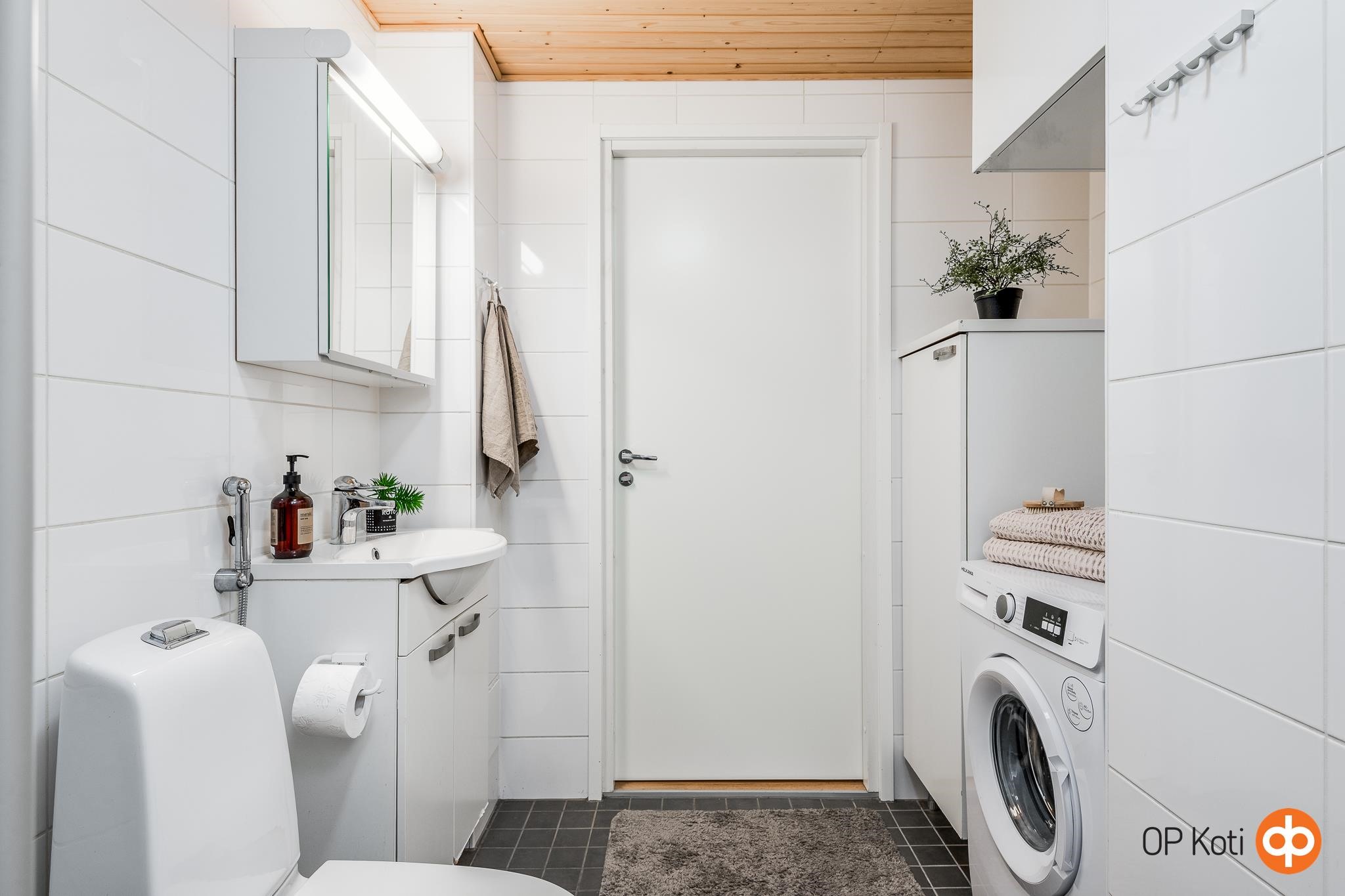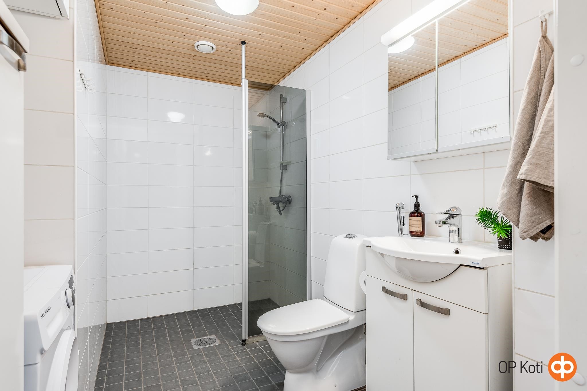 - Kylpyhuone, suihku, suihkuseinä, peilikaappi, allaskaappi, pesukoneliitäntä, lattialämmitys, kiinteät valaisimet. Kylpyhuoneen allaskaapin hana uusittu 4/2025.