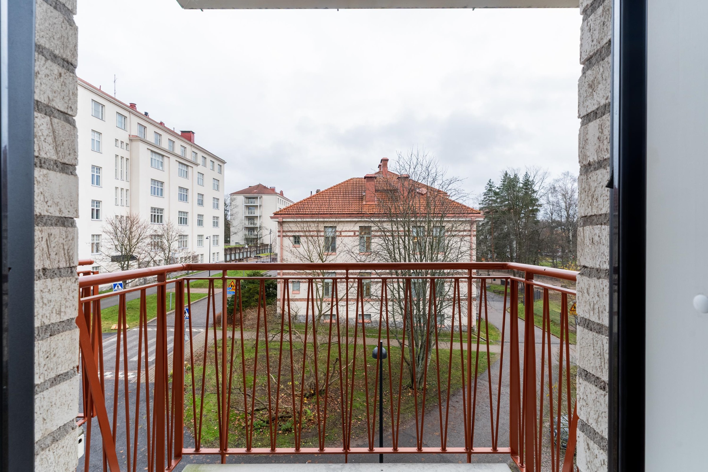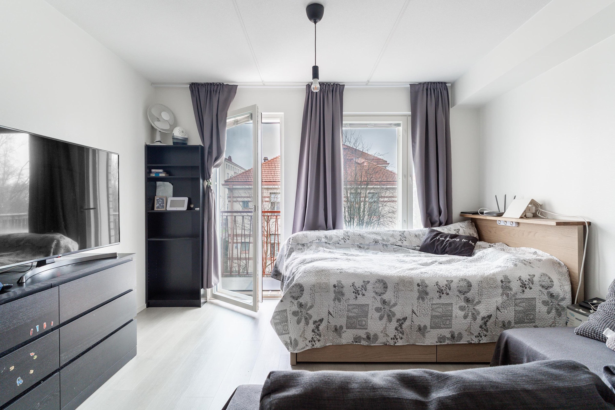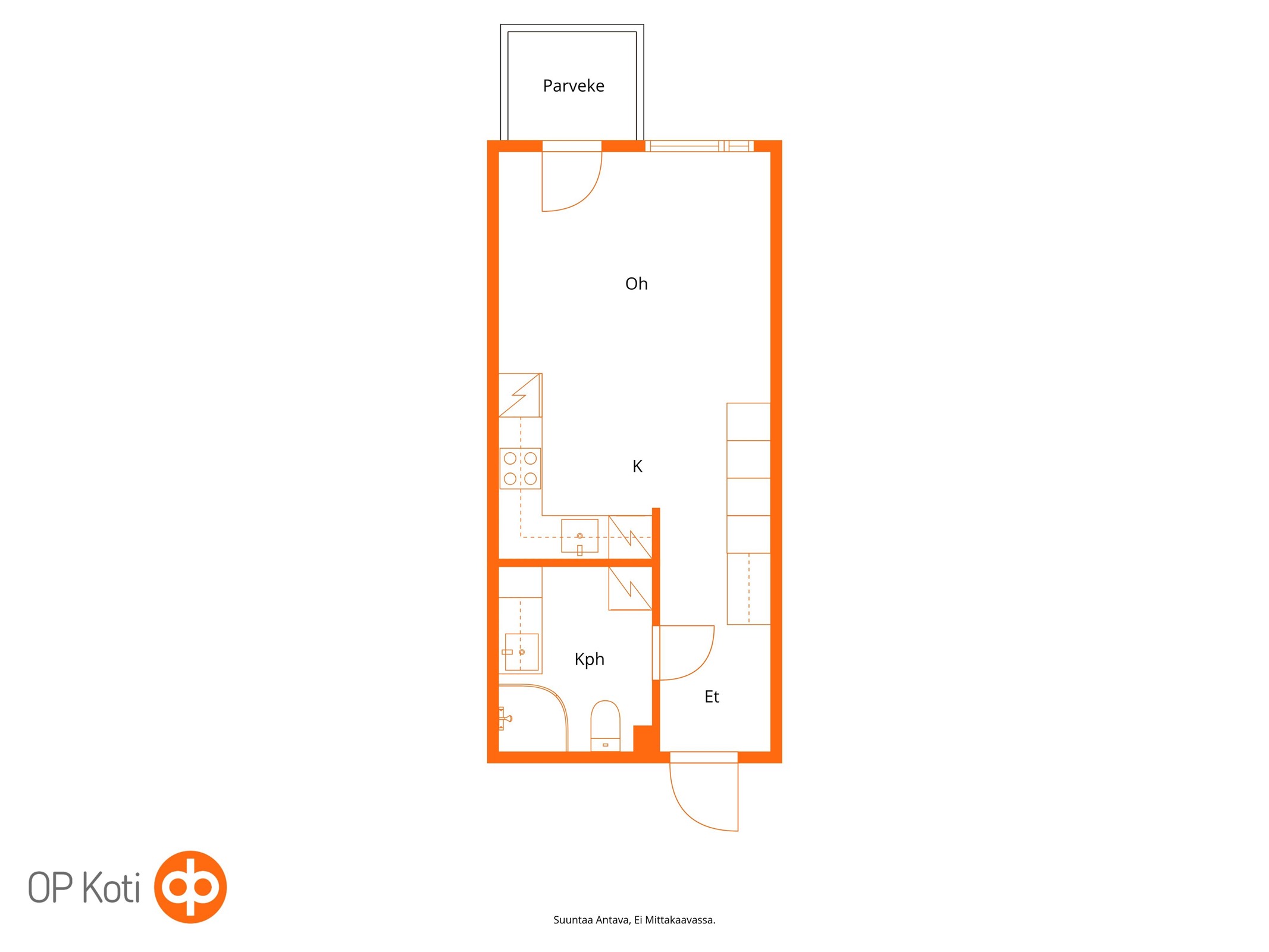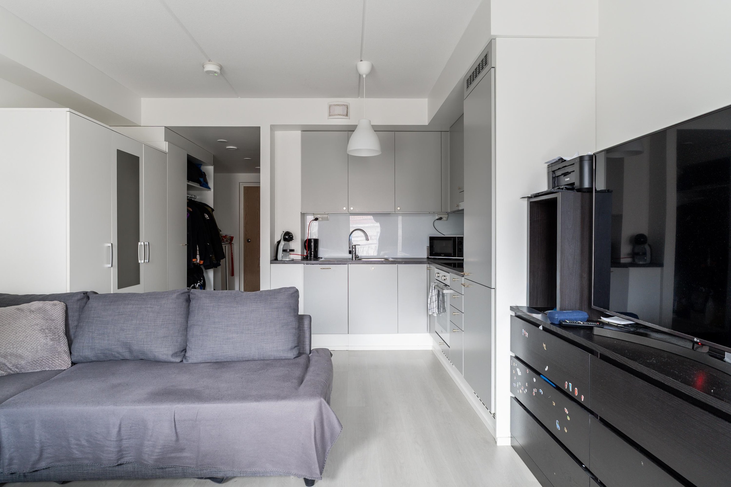 Asunnon pohjaratkaisu on tehokas ja toimiva. Valoisa huone yhdistyy moderniin avokeittiöön, jossa on laadukkaat materiaalit ja paljon säilytystilaa. Tilavaan kylpyhuoneeseen mahtuu hyvin myös pyykinpesukone. Pieni parveke tuo lisätilaa arkeen, ja se on täydellinen paikka vaikkapa aamukahville.