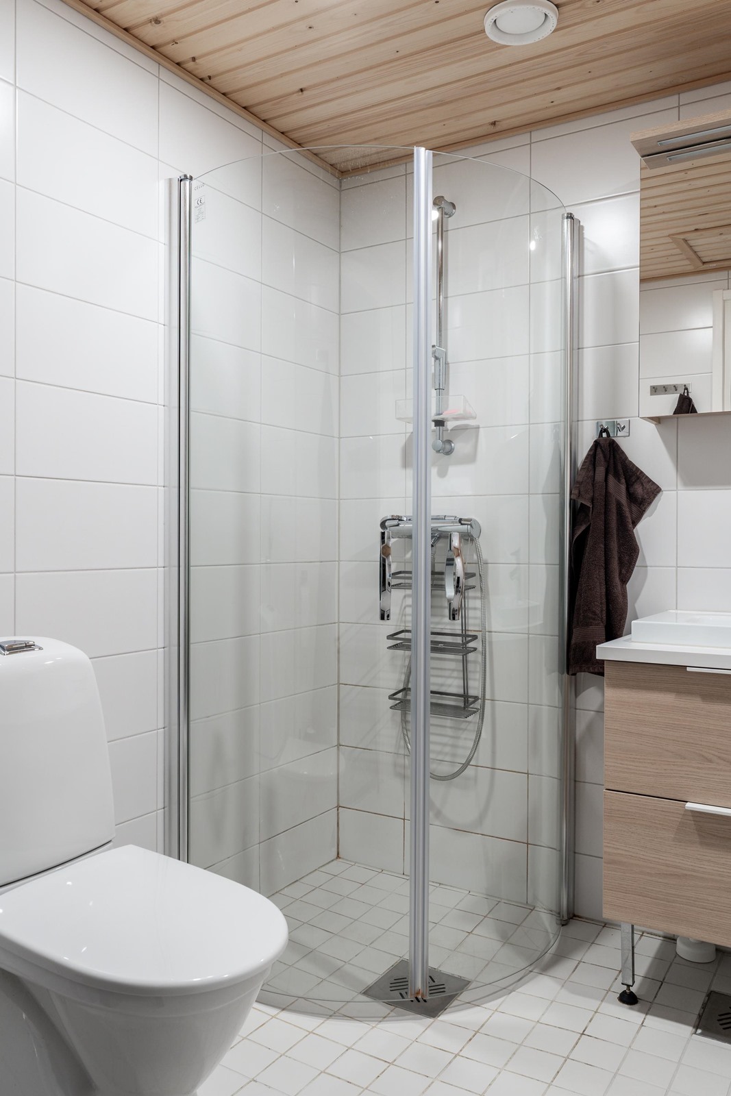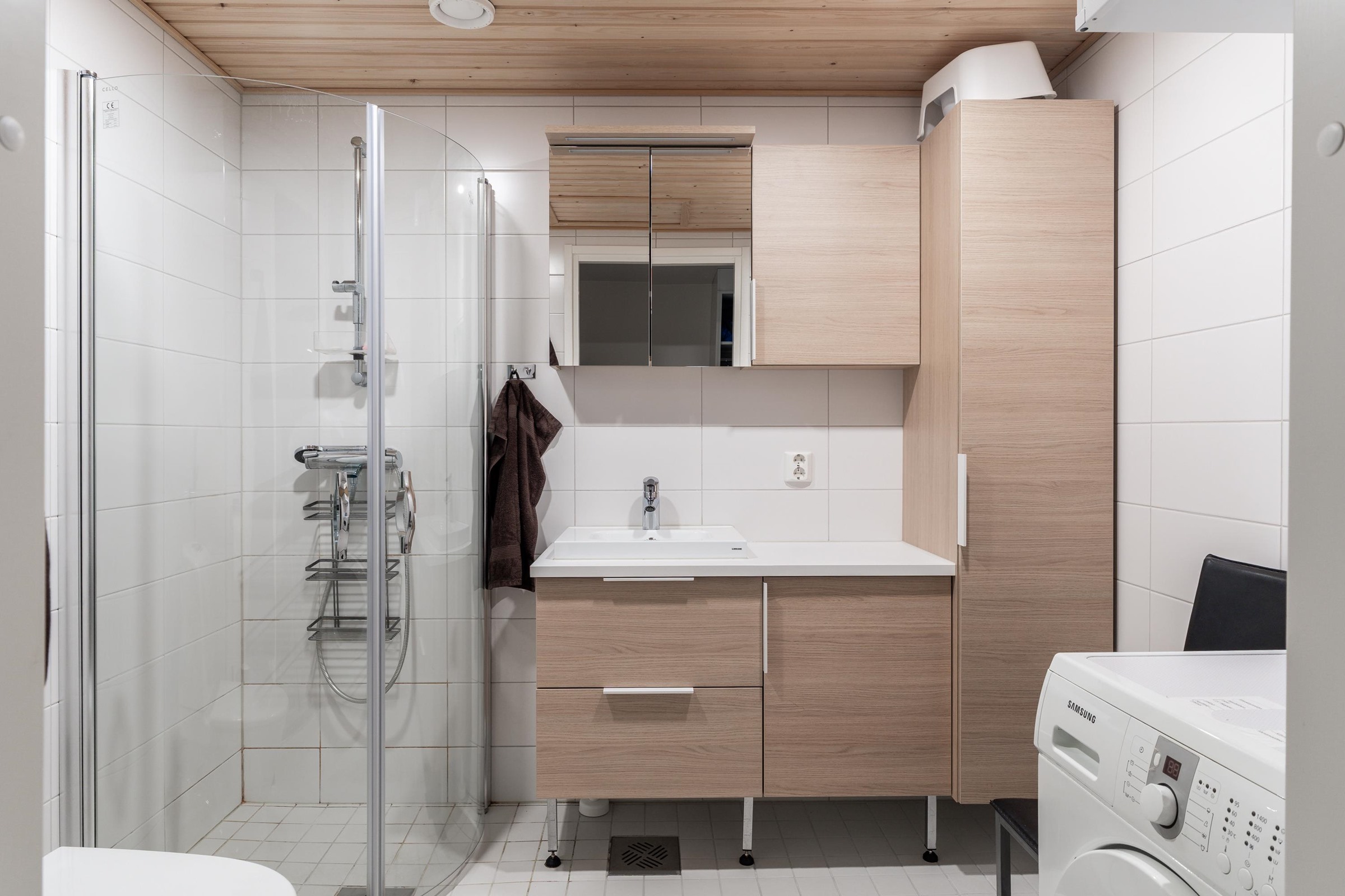 - Kylpyhuoneessa on suihkuseinä, peilikaappi, allaskaappi, erilliskaapit, pesukoneliitäntä ja sähkötoiminen lattialämmitys.