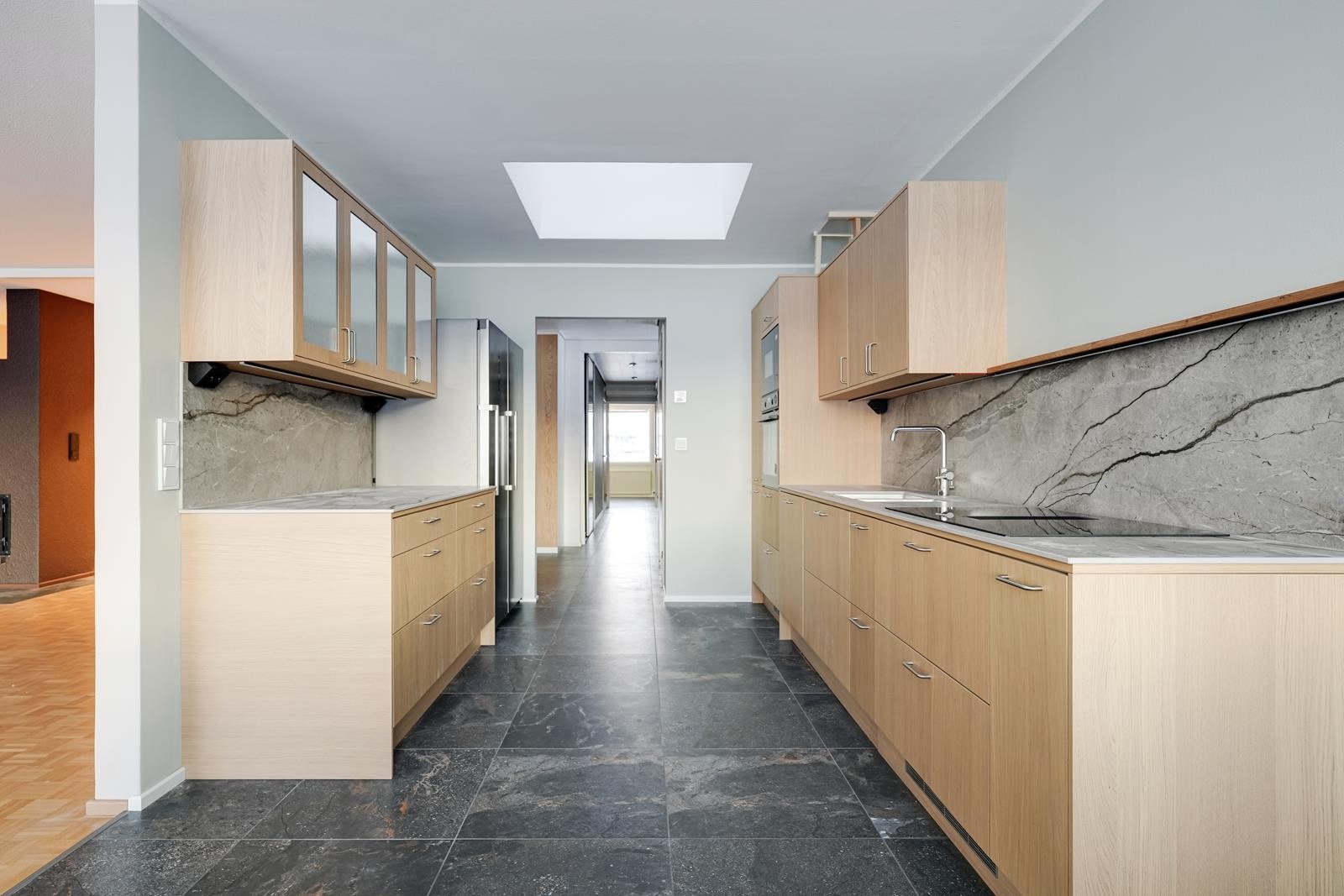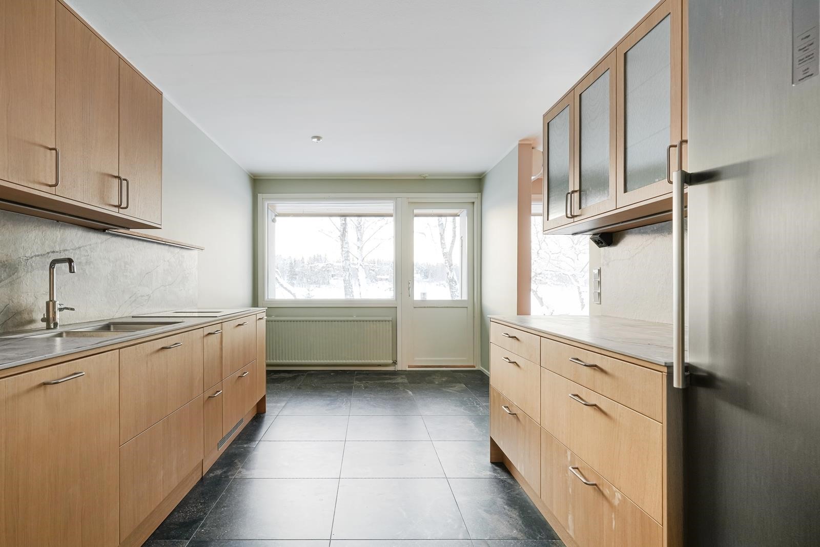 - Jääkaappi, pakastekaappi, erillisuuni, induktioliesi, liesituuletin (induktiotasossa), astianpesukone, kaapistot, kiinteät valaisimet. Uusi, keraaminen laattalattia.