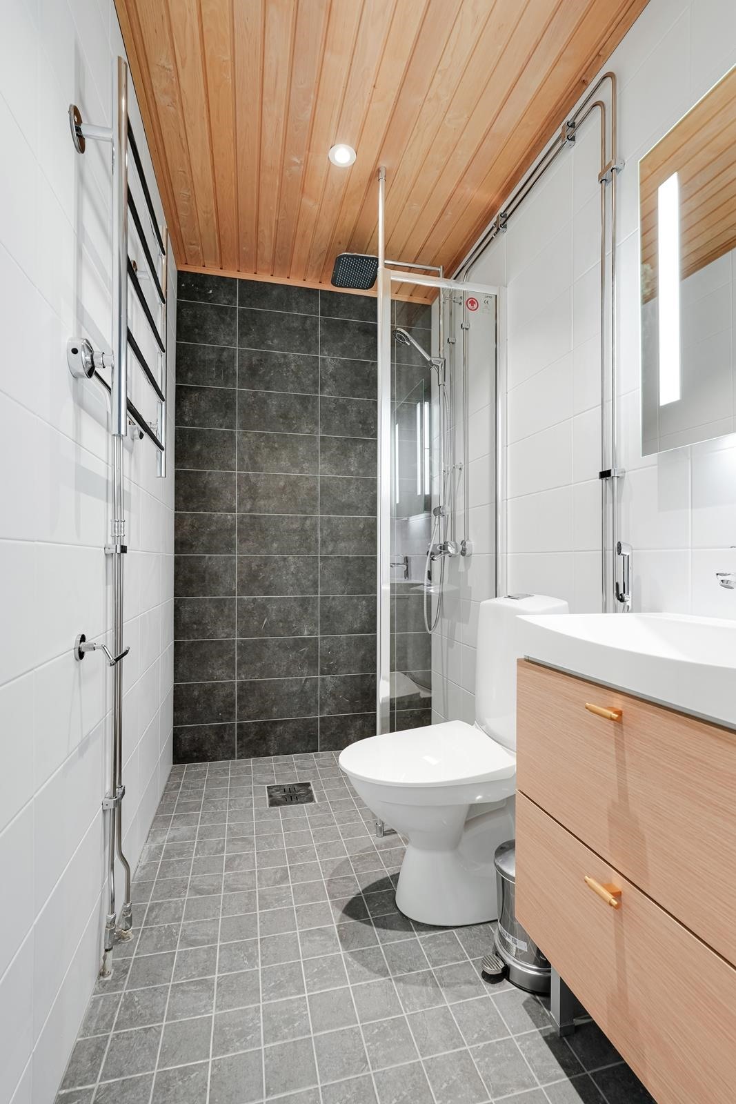 - Sauna, sähkökiuas, kylpyhuone, erillinen wc, suihku (3 kpl), peilit, allaskaappi, pesukoneliitäntä, lattialämmitys, kiinteät valaisimet. Erillinen pukuhuone.