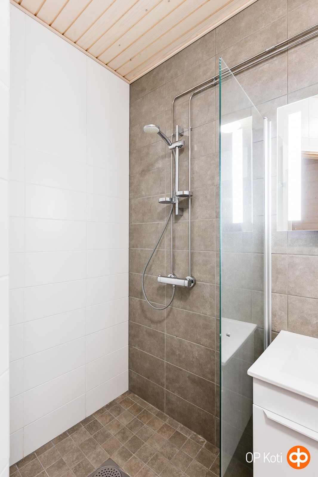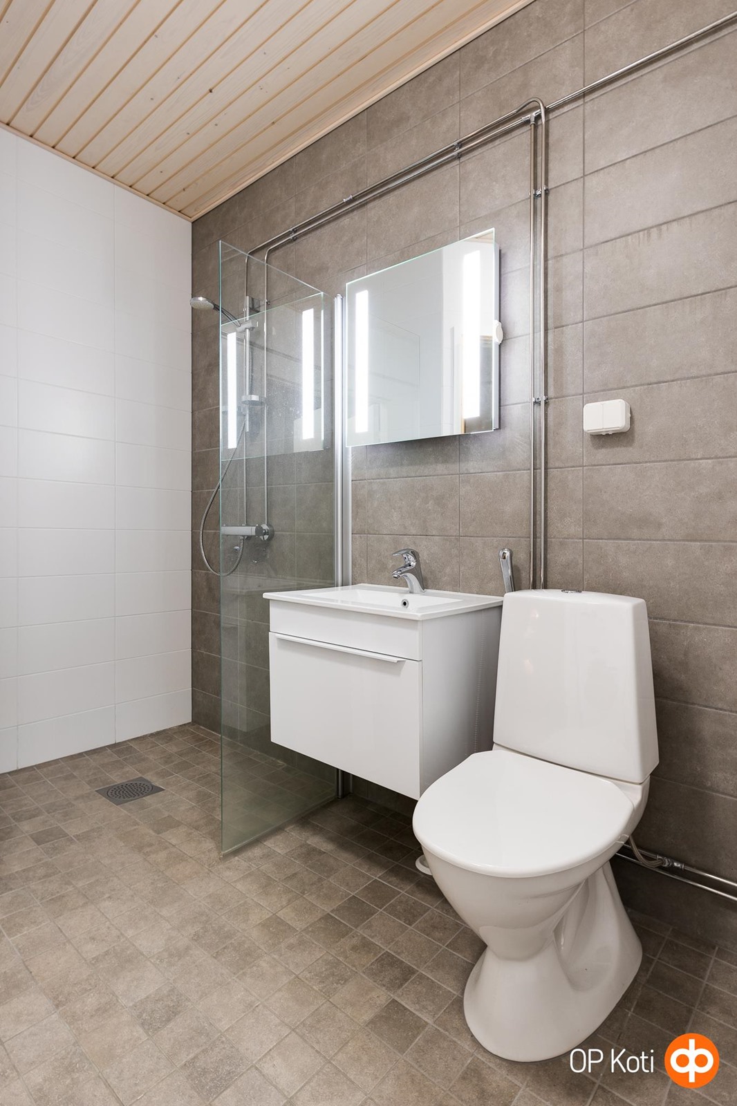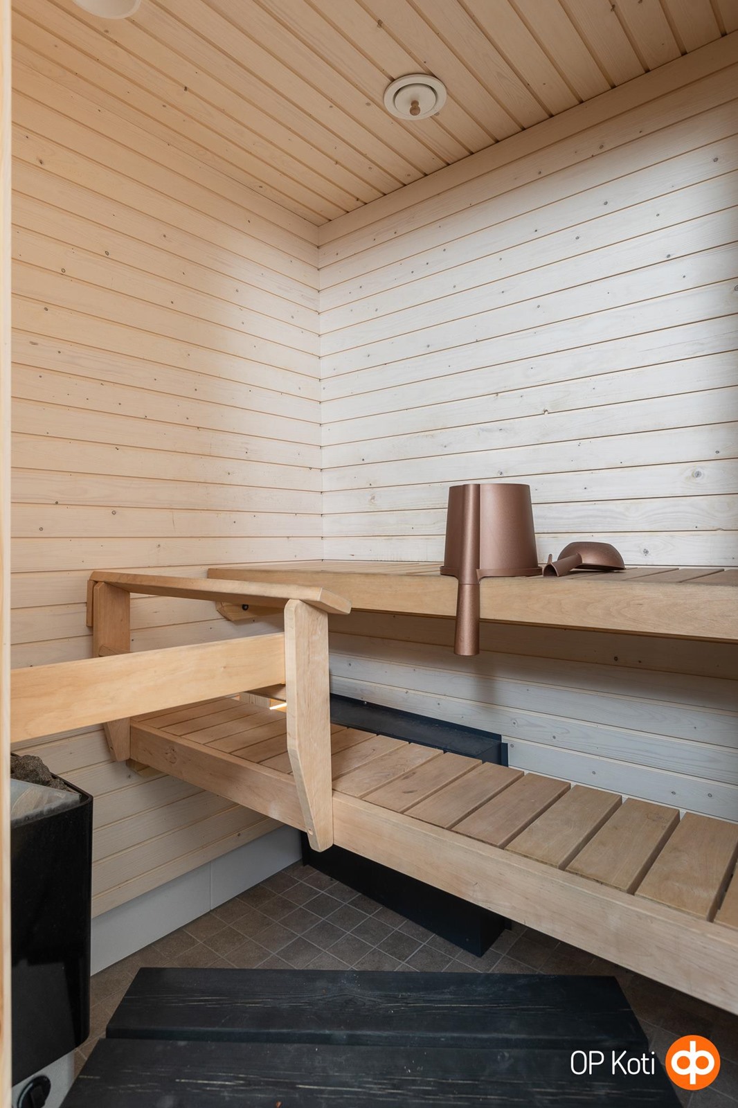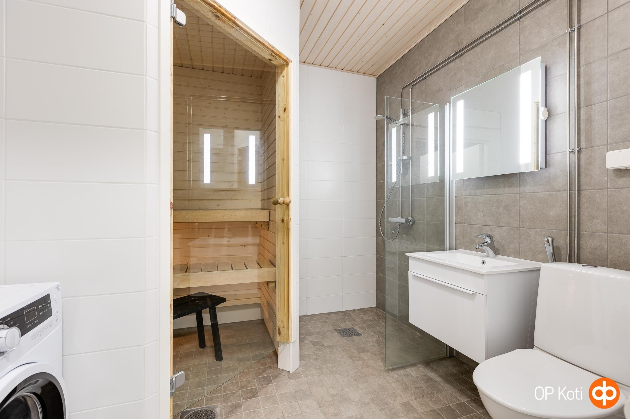 - Sauna, sähkökiuas, kylpyhuone, suihku, suihkuseinä, peilit, allaskaappi, pesukoneliitäntä, lattialämmitys, kiinteät valaisimet.