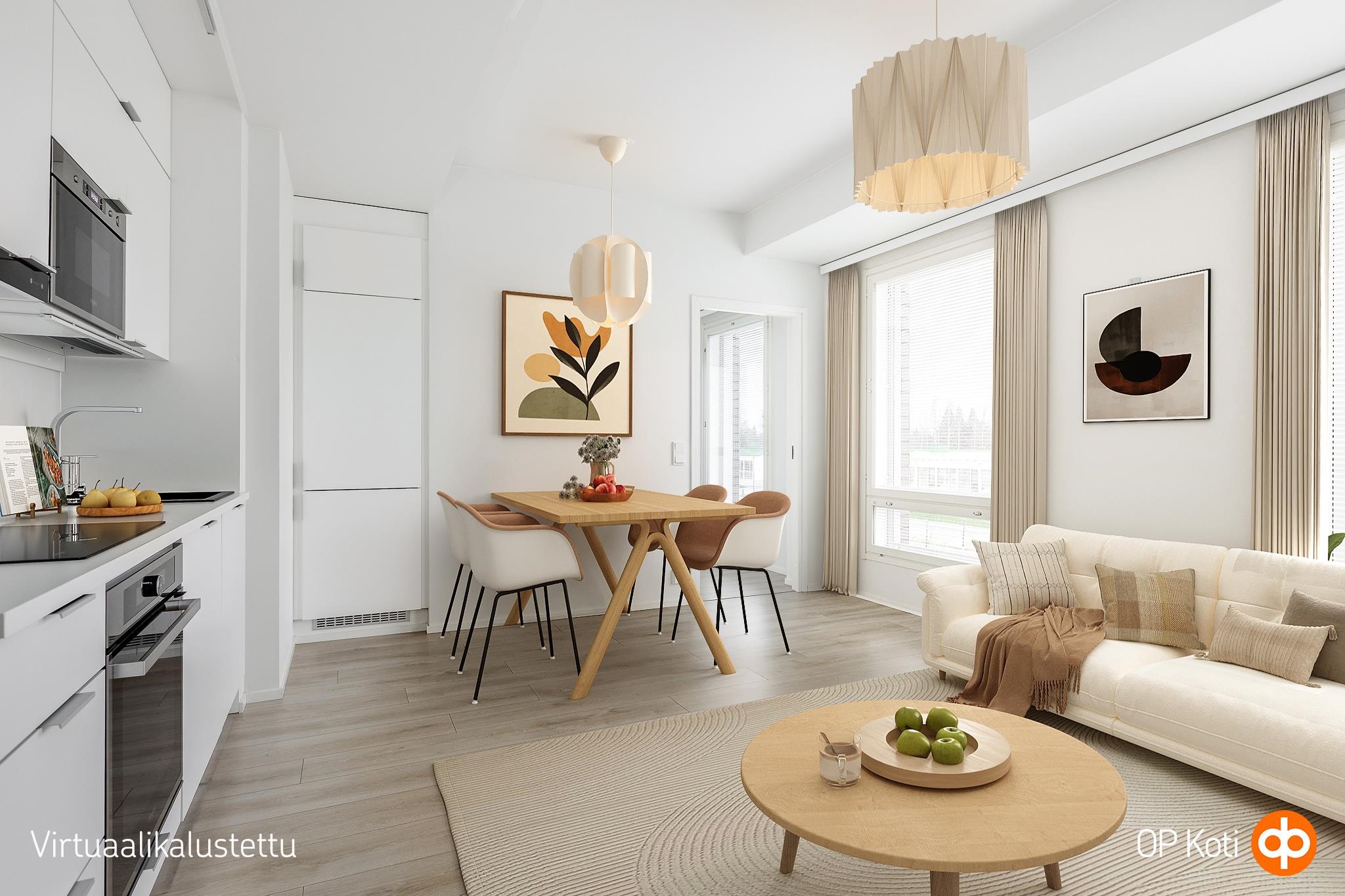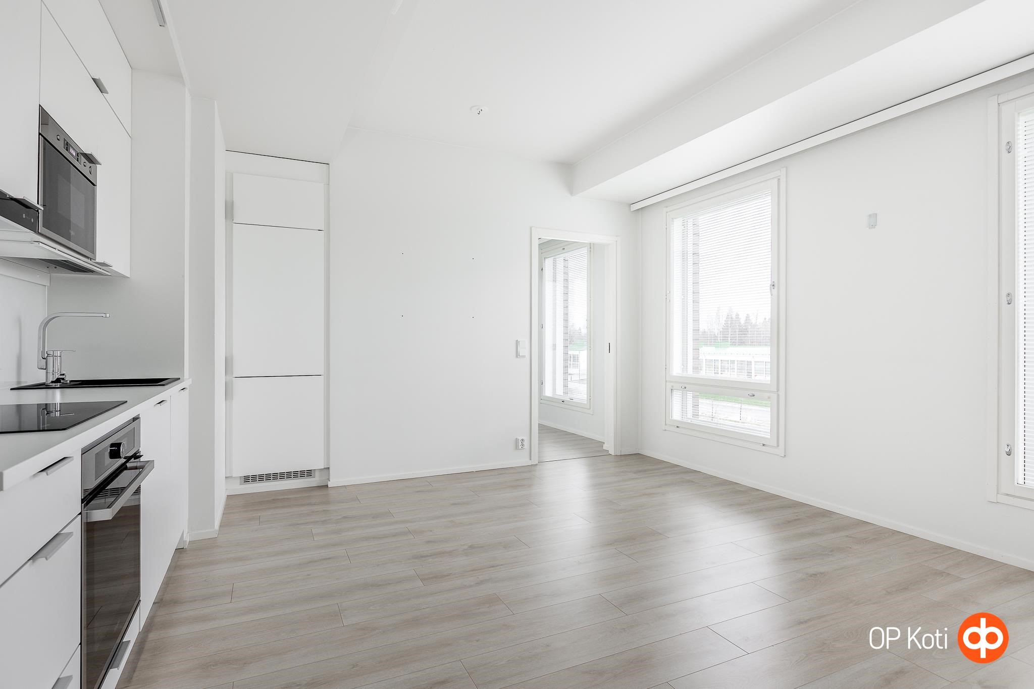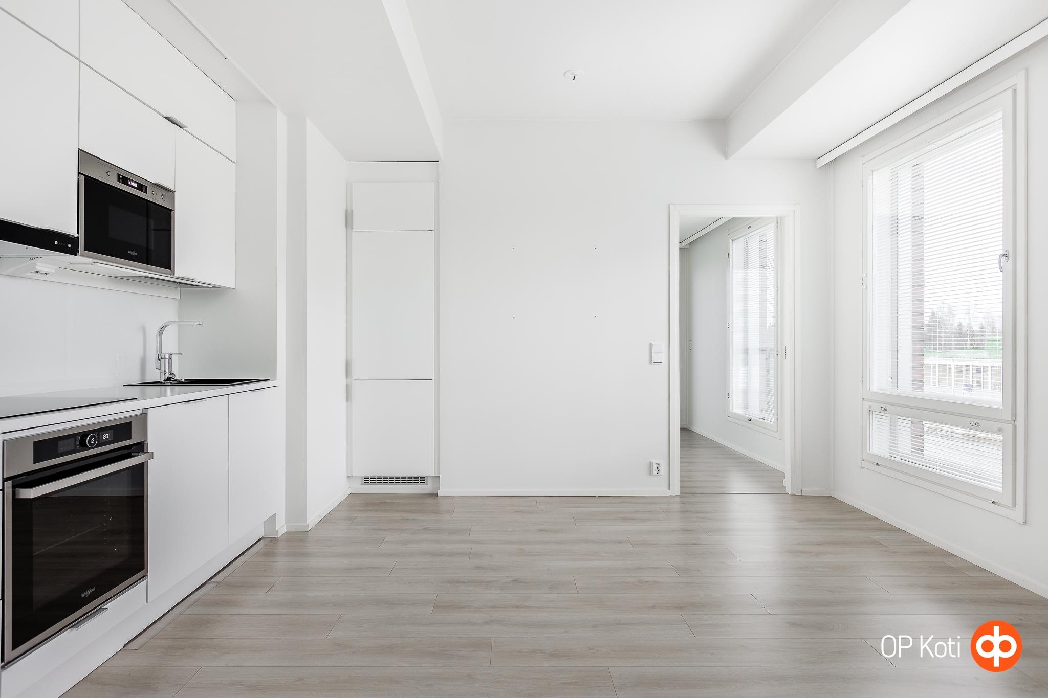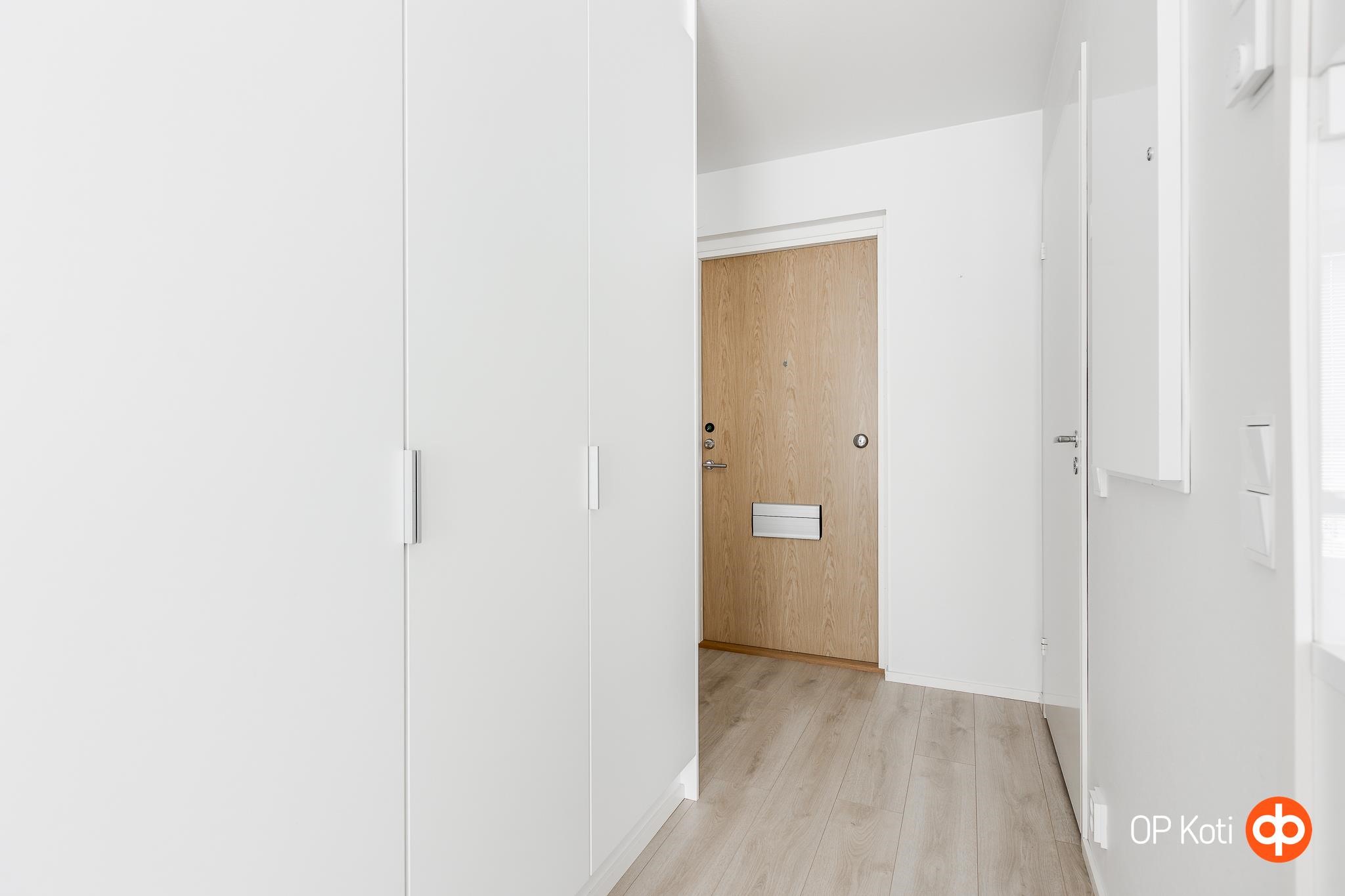 Tämä kolmannen kerroksen uudehko koti tarjoaa elämisen helppoutta ja kaupunkiasumisen parhaita puolia kompaktissa, mutta erittäin toimivassa paketissa. Valoisa tupakeittiö ja suuret ikkunat luovat avaran tunnelman. Makuuhuoneesta on suora käynti lasitetulle parvekkeelle, jossa nautit aamukahvit säällä kuin säällä. Parveke on kulmassa, jossa näkyvyys on laaja. Tilava kylpyhuone tekee arjesta sujuvaa - pyykkihuollollekin on oma paikkansa.